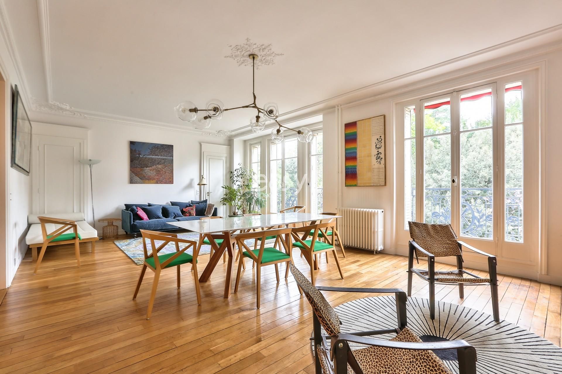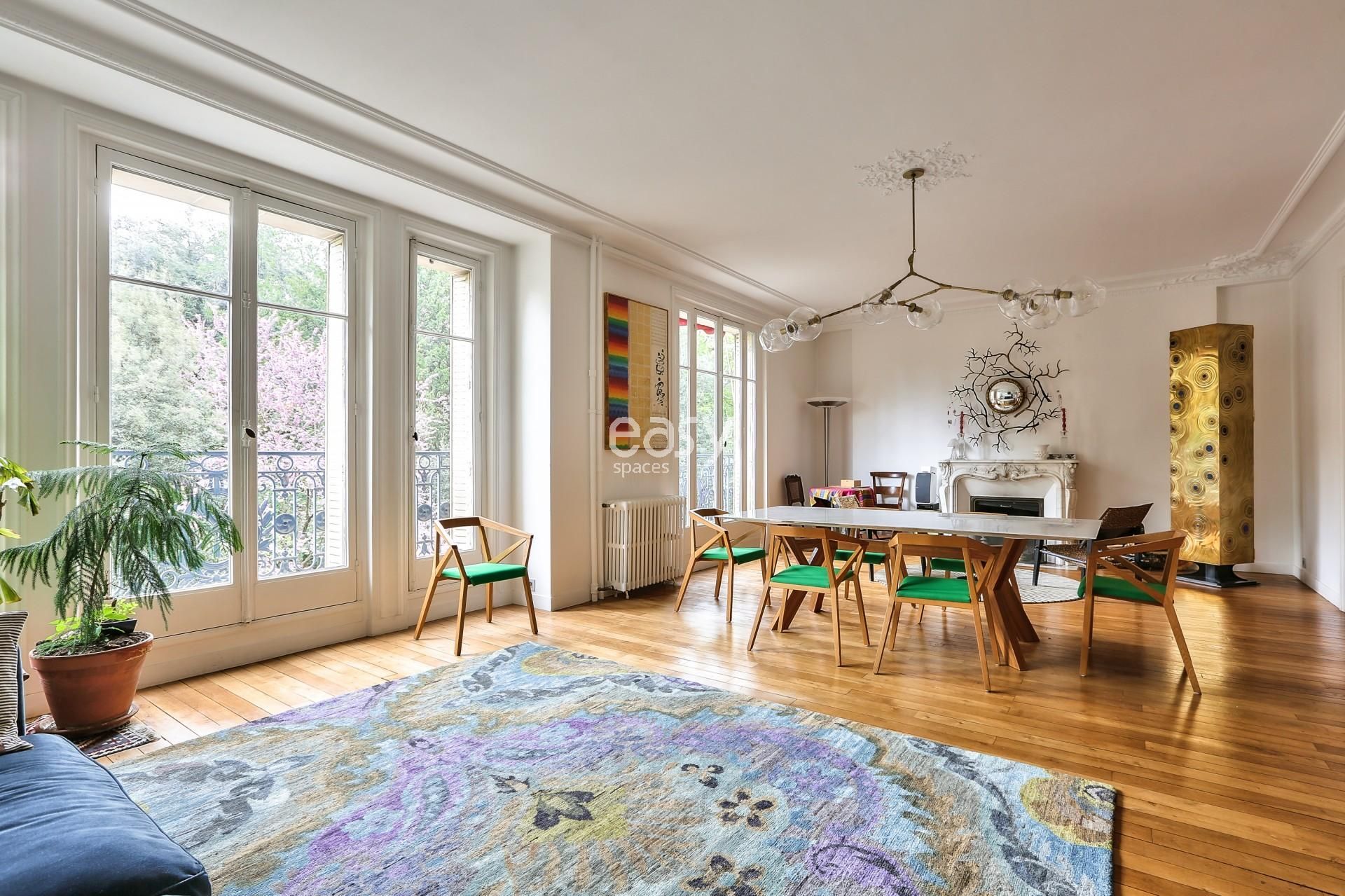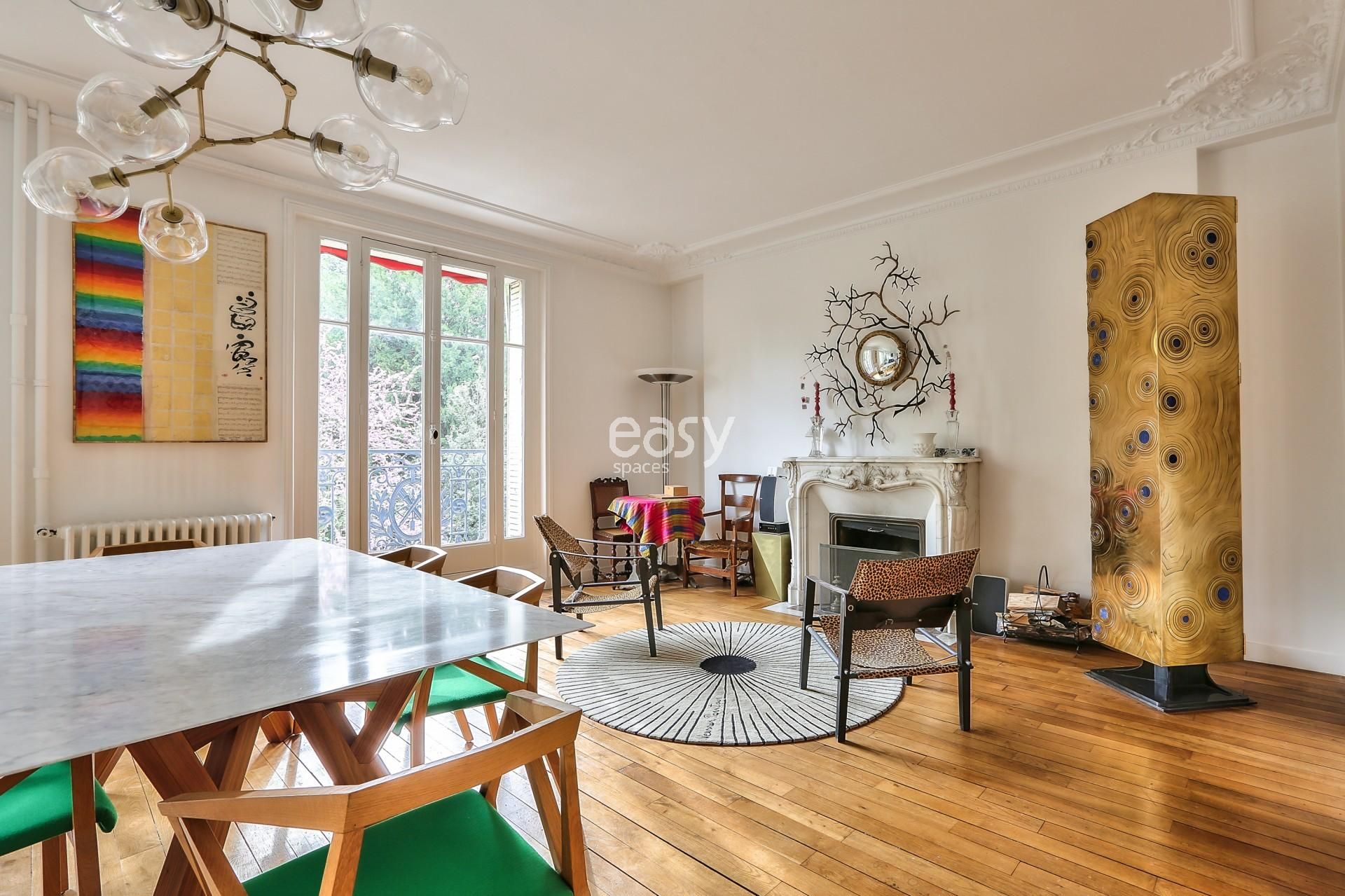 Bénéficiant d'un espace séjour lumineux de 40m2 avec parquet et moulures ainsi que sa belle cheminée ancienne en feront un décor idéal pour des productions photos pour de la de mode par exemple.