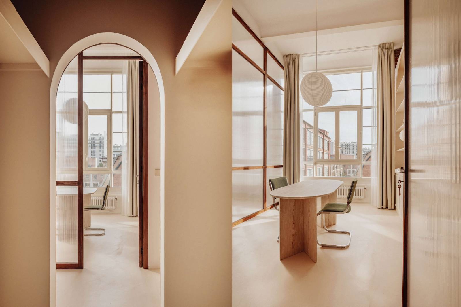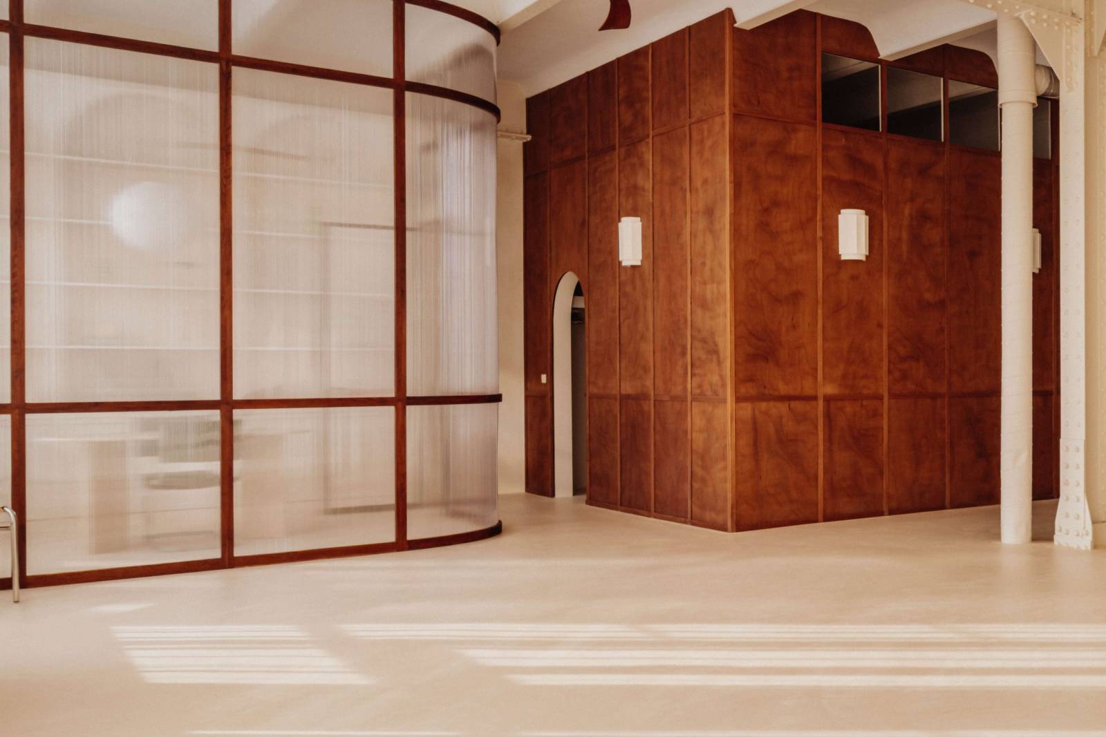 À seulement quelques minutes de Paris, Louer un atelier d'artiste pour shooting et événement à proximité de Paris prend ici la forme d’un studio lumineux au caractère architectural affirmé. Les images révèlent un espace structuré par de grandes fenêtres industrielles, des arches élégantes et un volume central habillé de panneaux bois brun. Des cloisons vitrées texturées encadrées de métal organisent certains espaces secondaires tout en laissant circuler la lumière.