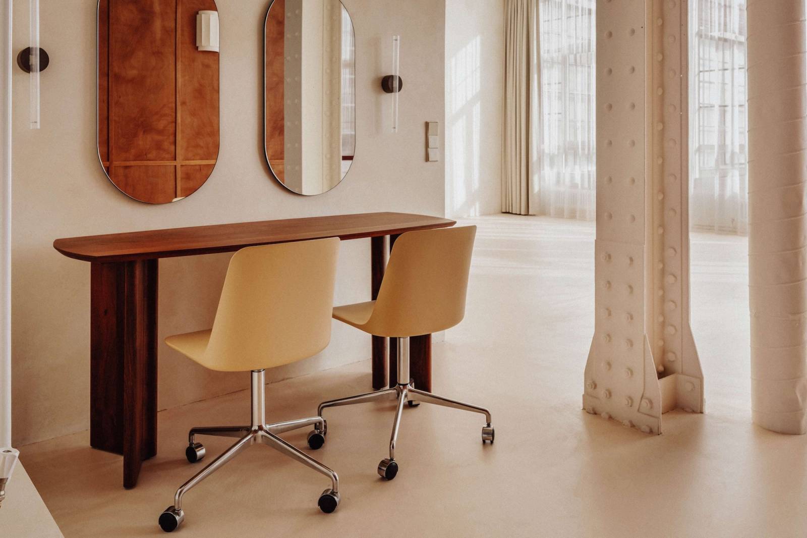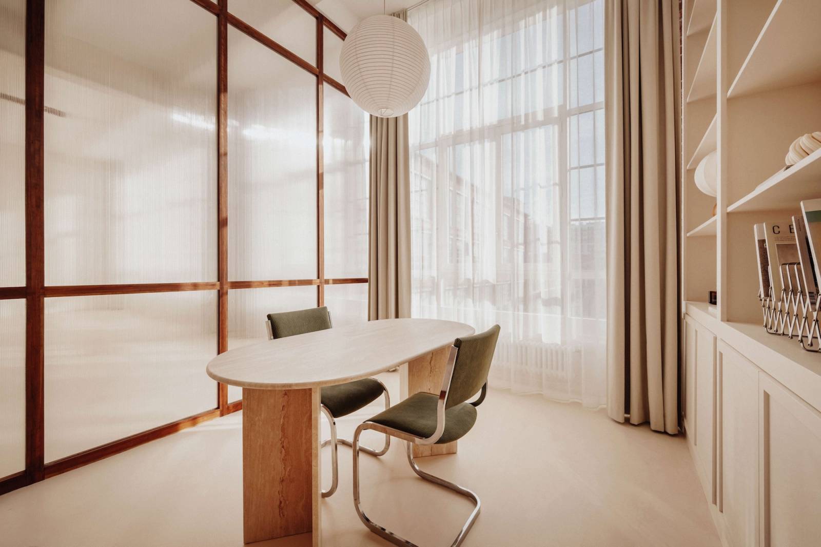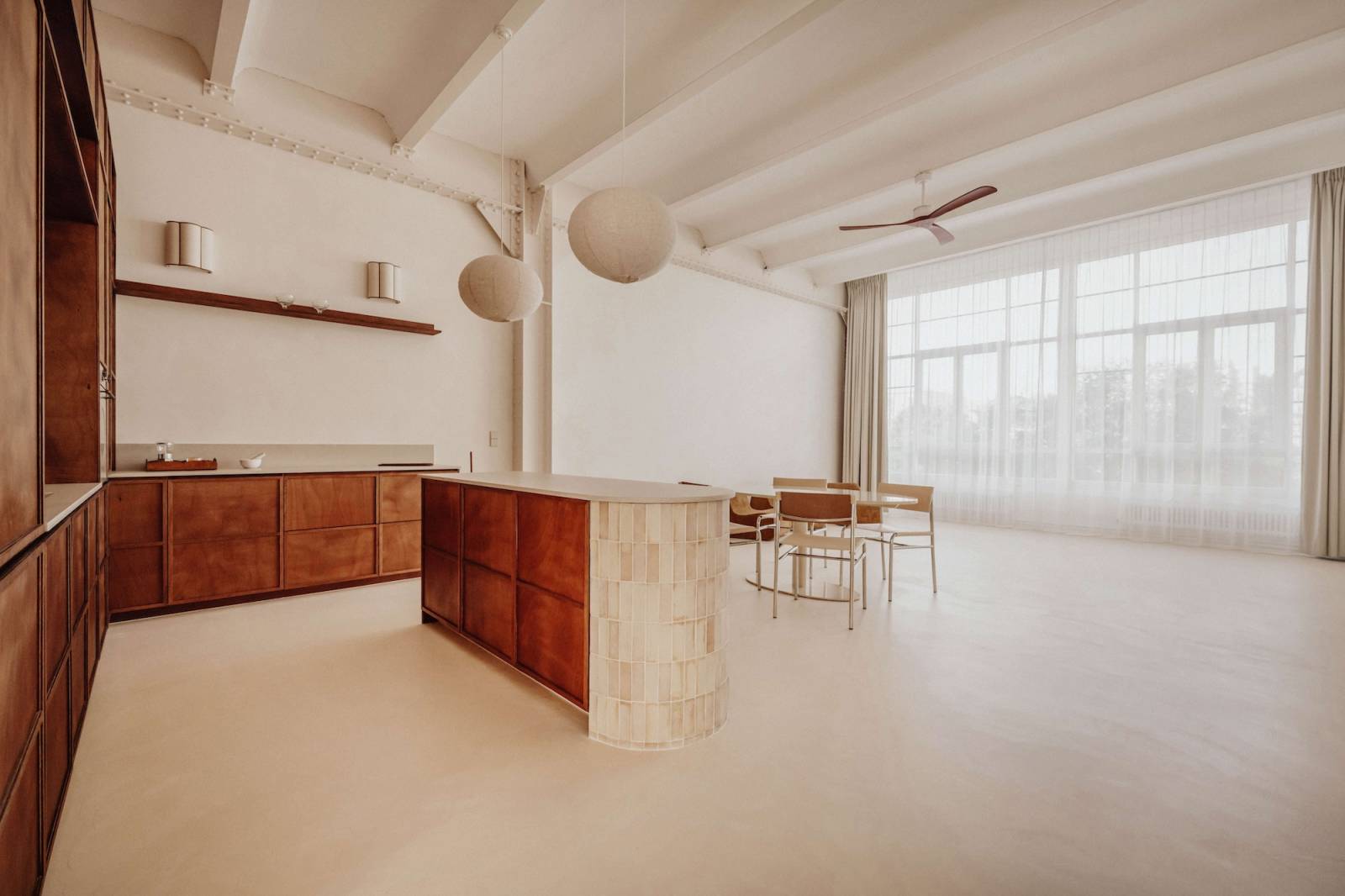 L’espace est structuré autour d’une architecture industrielle adoucie par des matériaux chaleureux. Les grandes fenêtres laissent entrer une lumière naturelle abondante qui glisse sur les sols clairs et les surfaces boisées. Les rideaux translucides permettent de diffuser la lumière, tandis que certaines zones peuvent être entièrement occultées pour maîtriser l’éclairage.