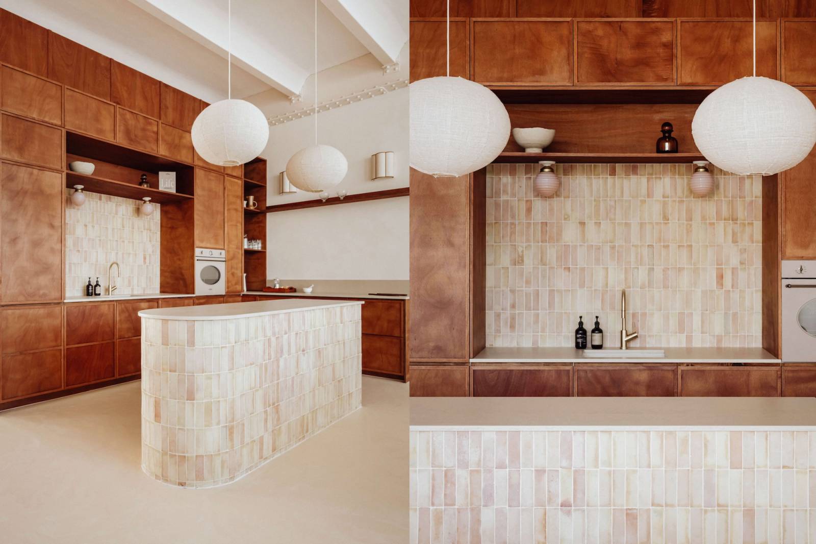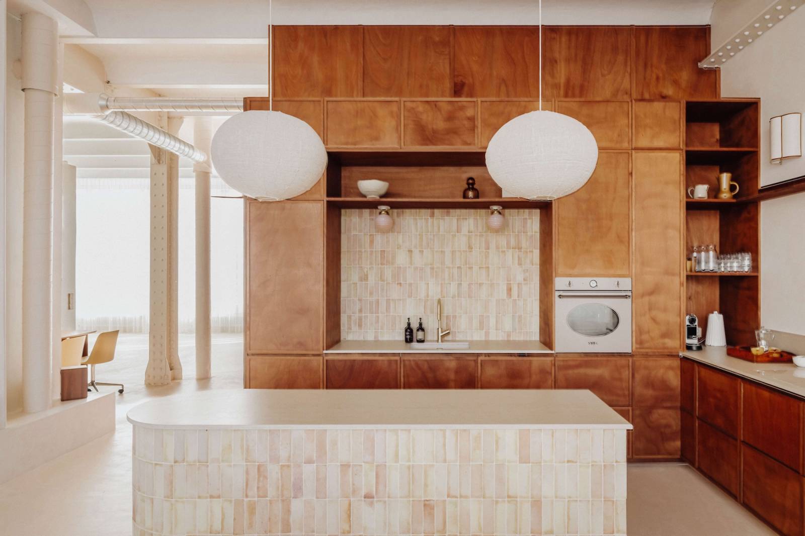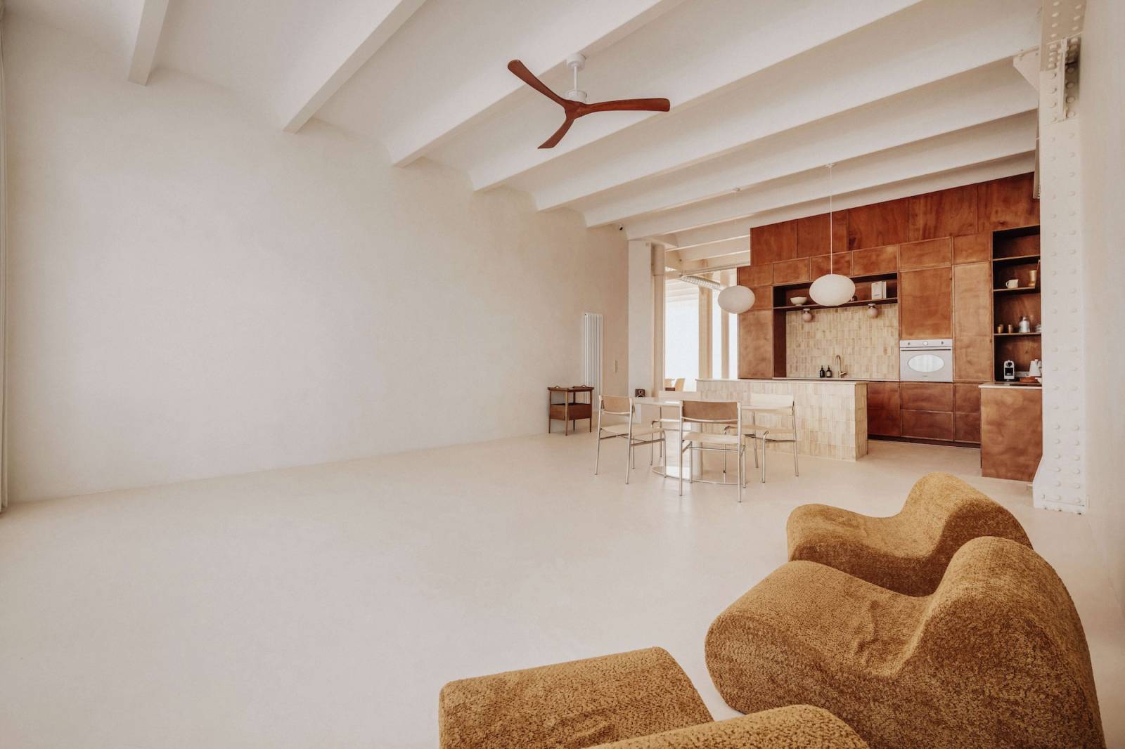 La cuisine ouverte se distingue par un îlot recouvert de carreaux minéraux et un mobilier bois intégré, créant un décor épuré pour des prises de vue éditoriales ou lifestyle. Plusieurs éléments signature apparaissent également : colonnes métalliques rivetées, plafonds structurés par des poutres apparentes et ventilateurs suspendus. L’ensemble compose un décor minimaliste et facilement modulable pour différents univers créatifs.