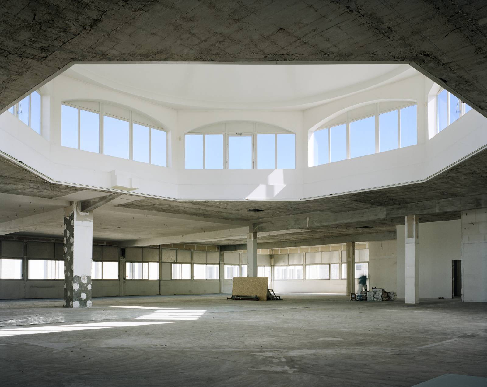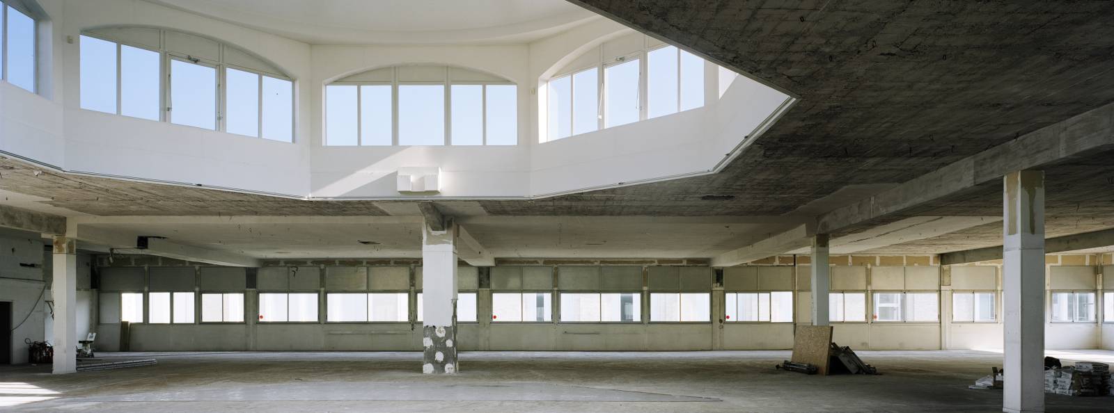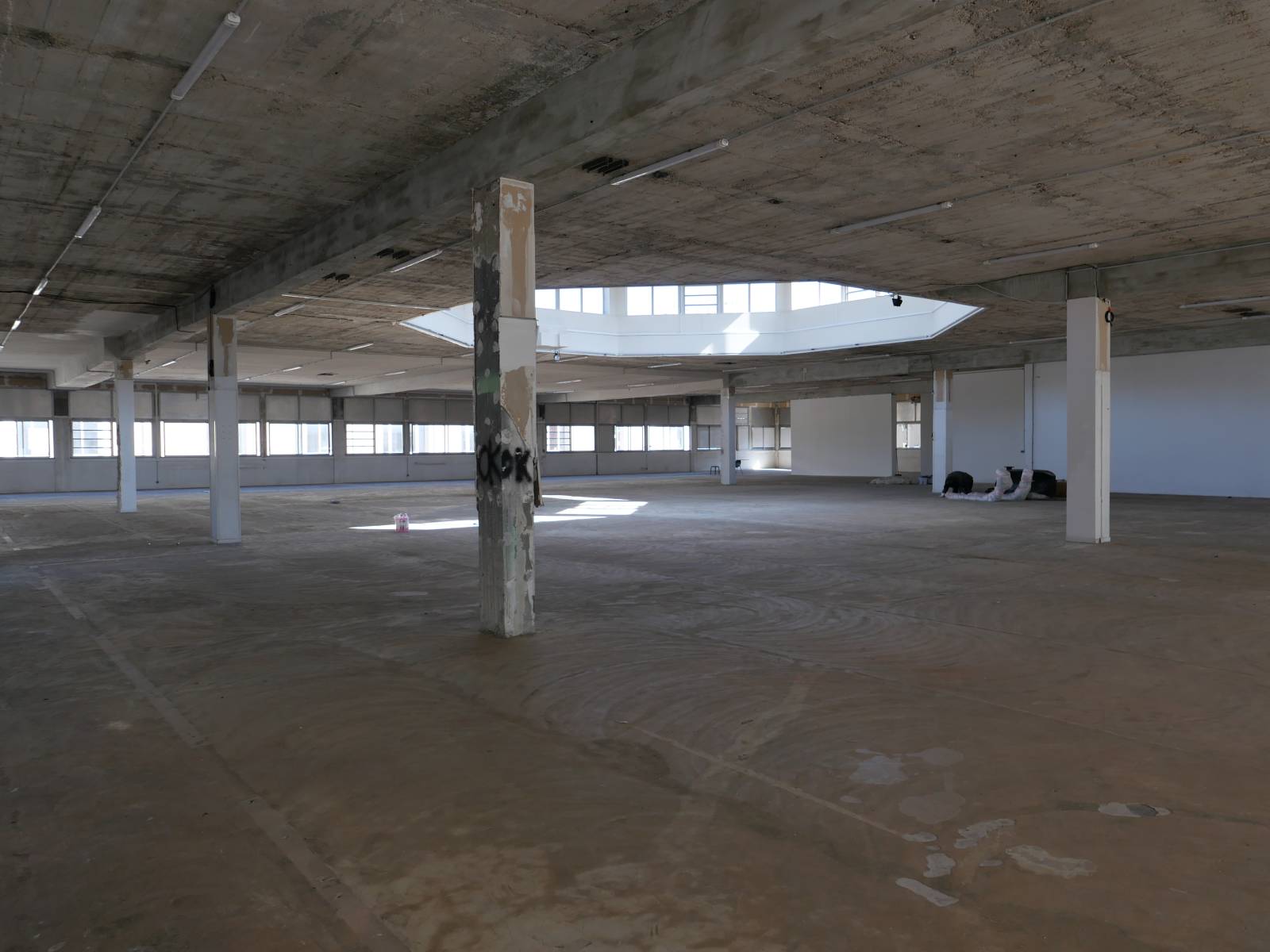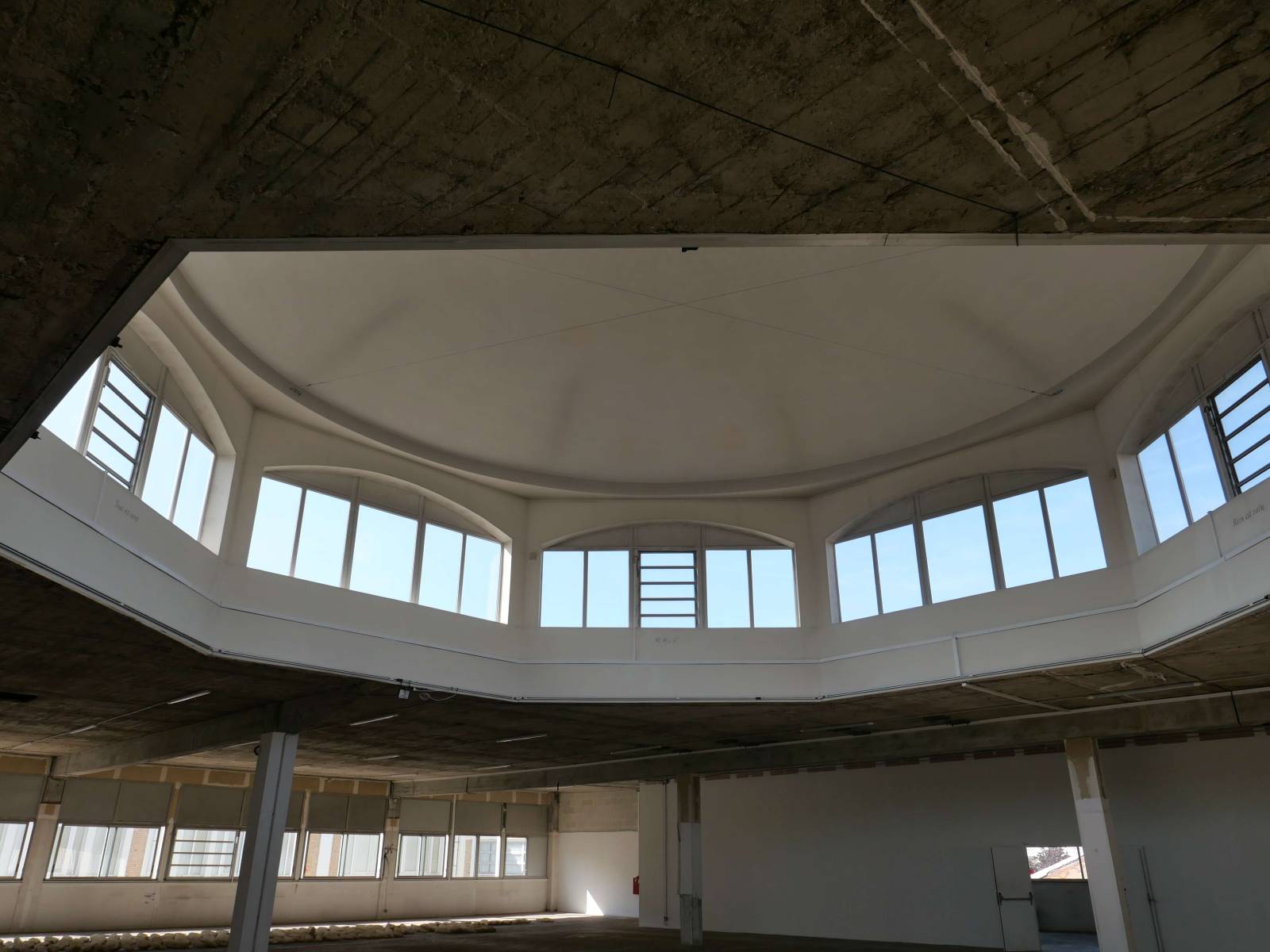 Son état brut en fait un décor puissant, presque cinématographique : murs défraîchis, matières brutes, détails industriels apparents, et une immense coupole centrale qui capte la lumière naturelle et donne une dimension architecturale forte à l’ensemble.