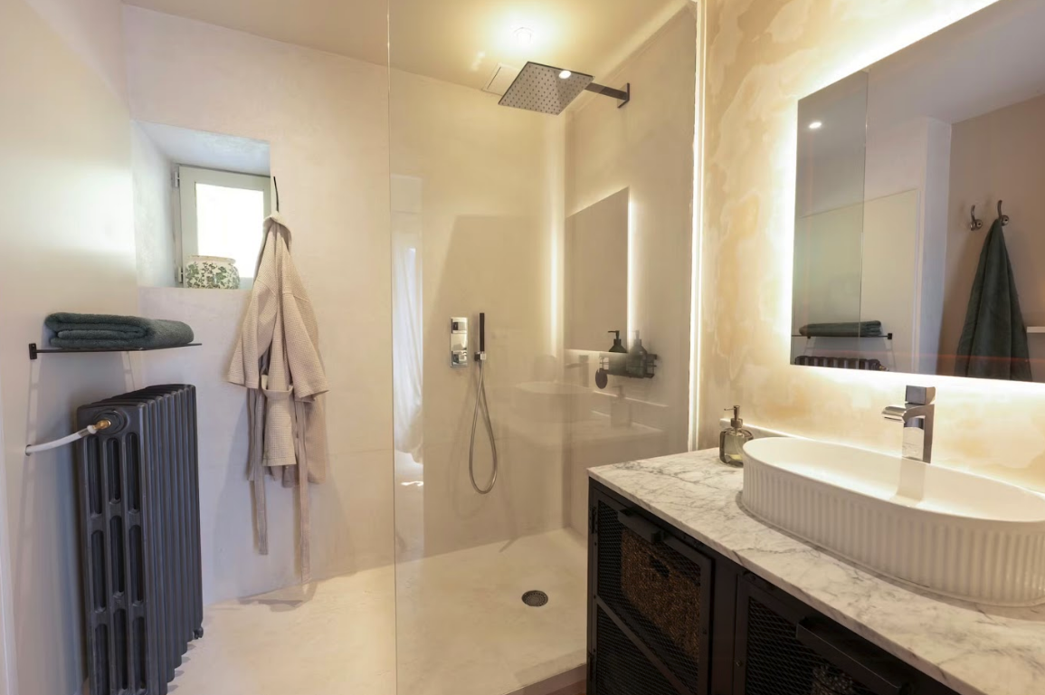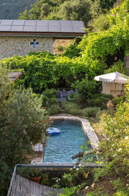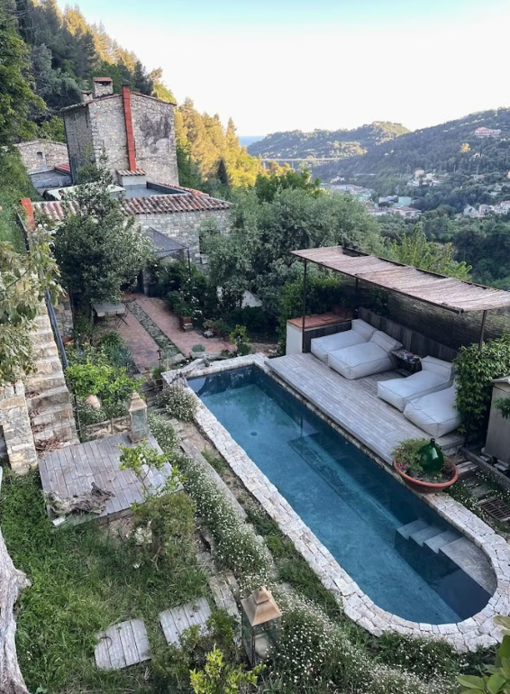 Les extérieurs en restanques et la piscine en pierre renforcent le caractère unique du lieu.