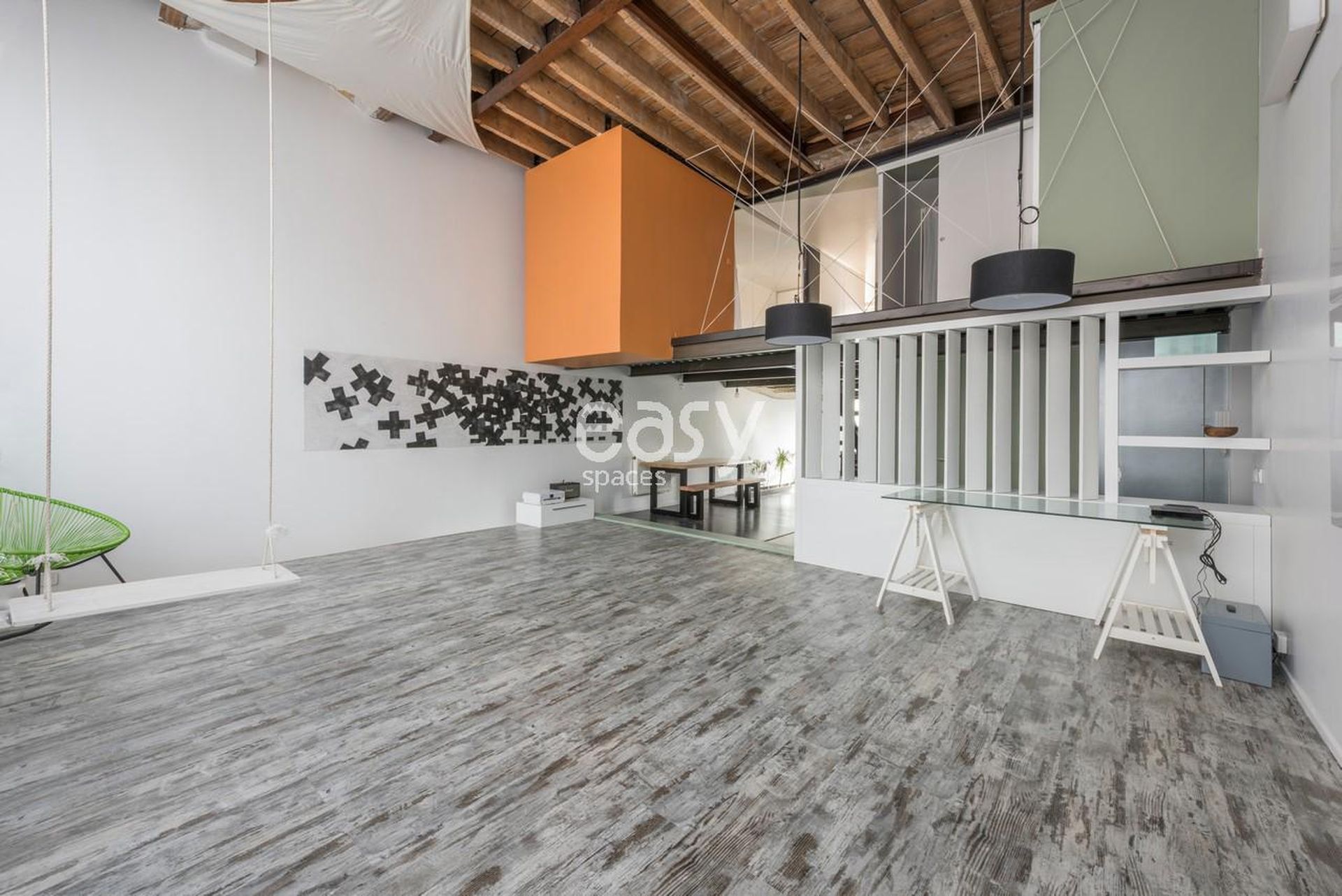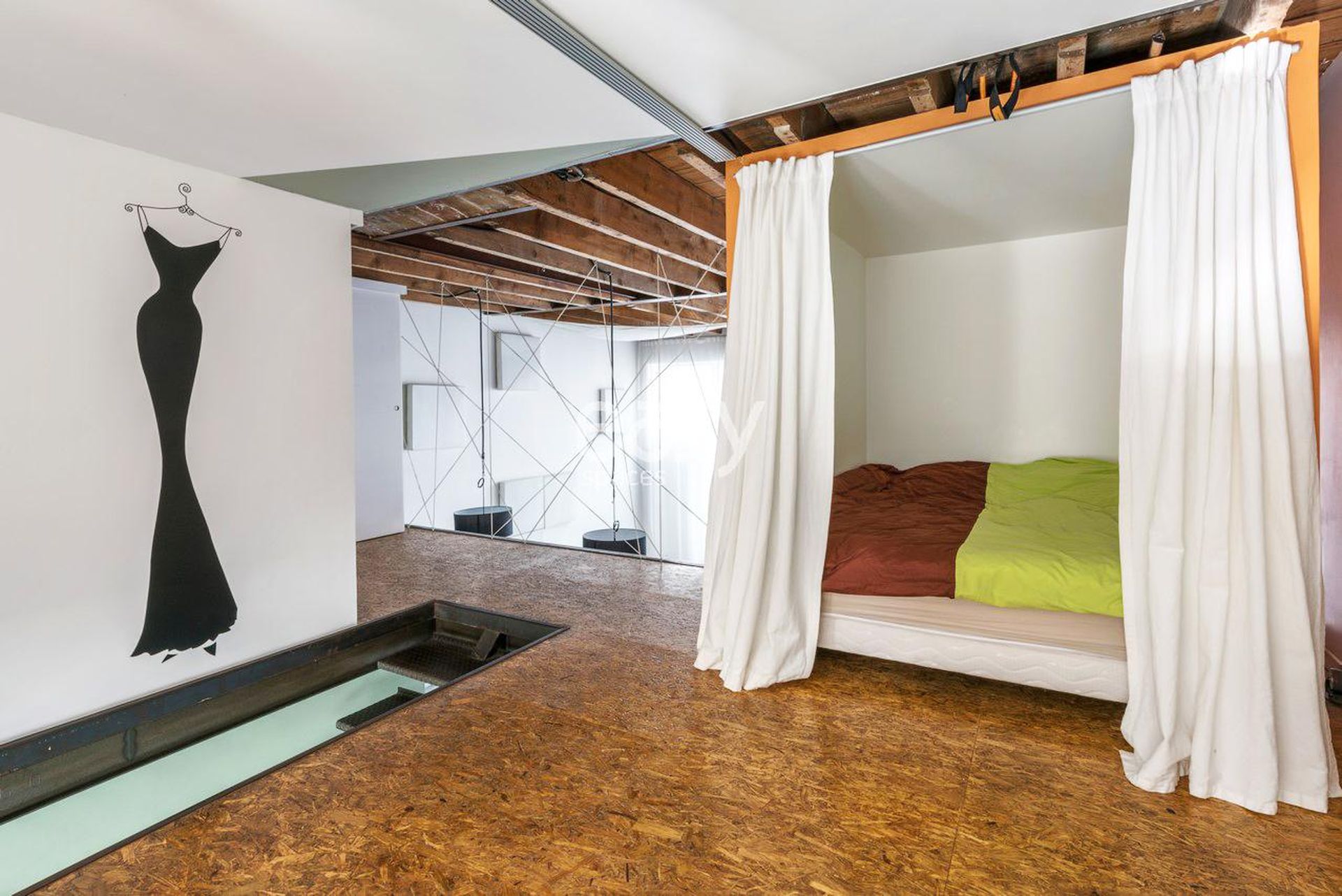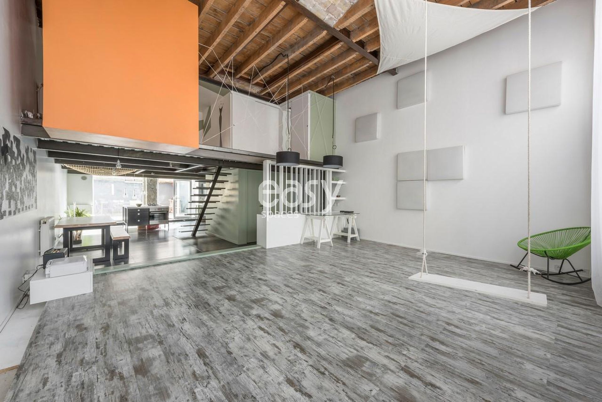 Volumes modulables et photogéniques : vaste pièce principale à la perspective nette, claustra vertical pour structurer vos axes caméra, escalier design à marches suspendues, mezzanine avec filet tendu très visuel pour plans en hauteur et compositions audacieuses.