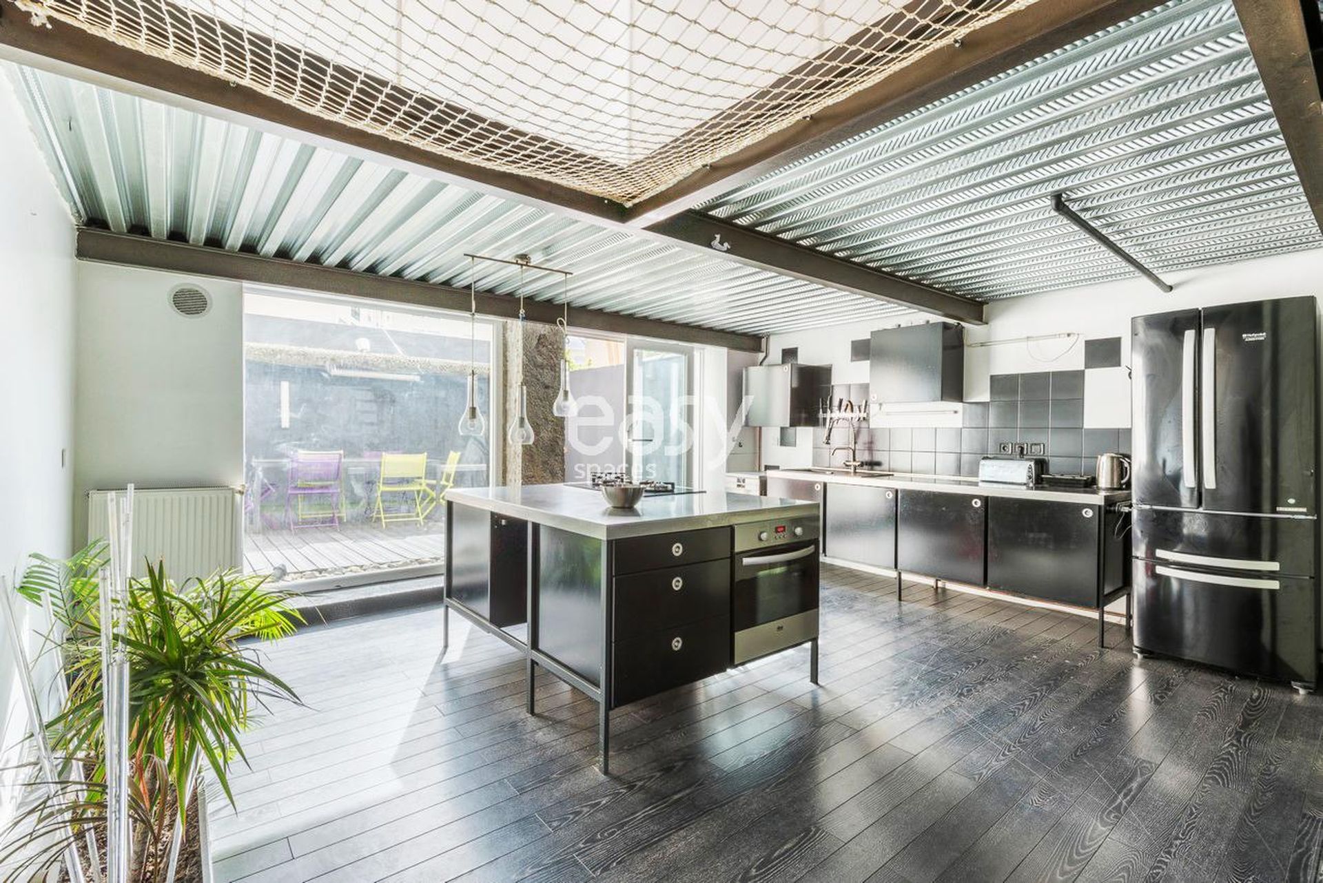 Cuisine au style industriel : grand îlot en inox, feux intégrés, suspensions en verre, crédences noires et réfrigérateur américain — idéal pour tournages food, démonstrations produits et stylisme culinaire.