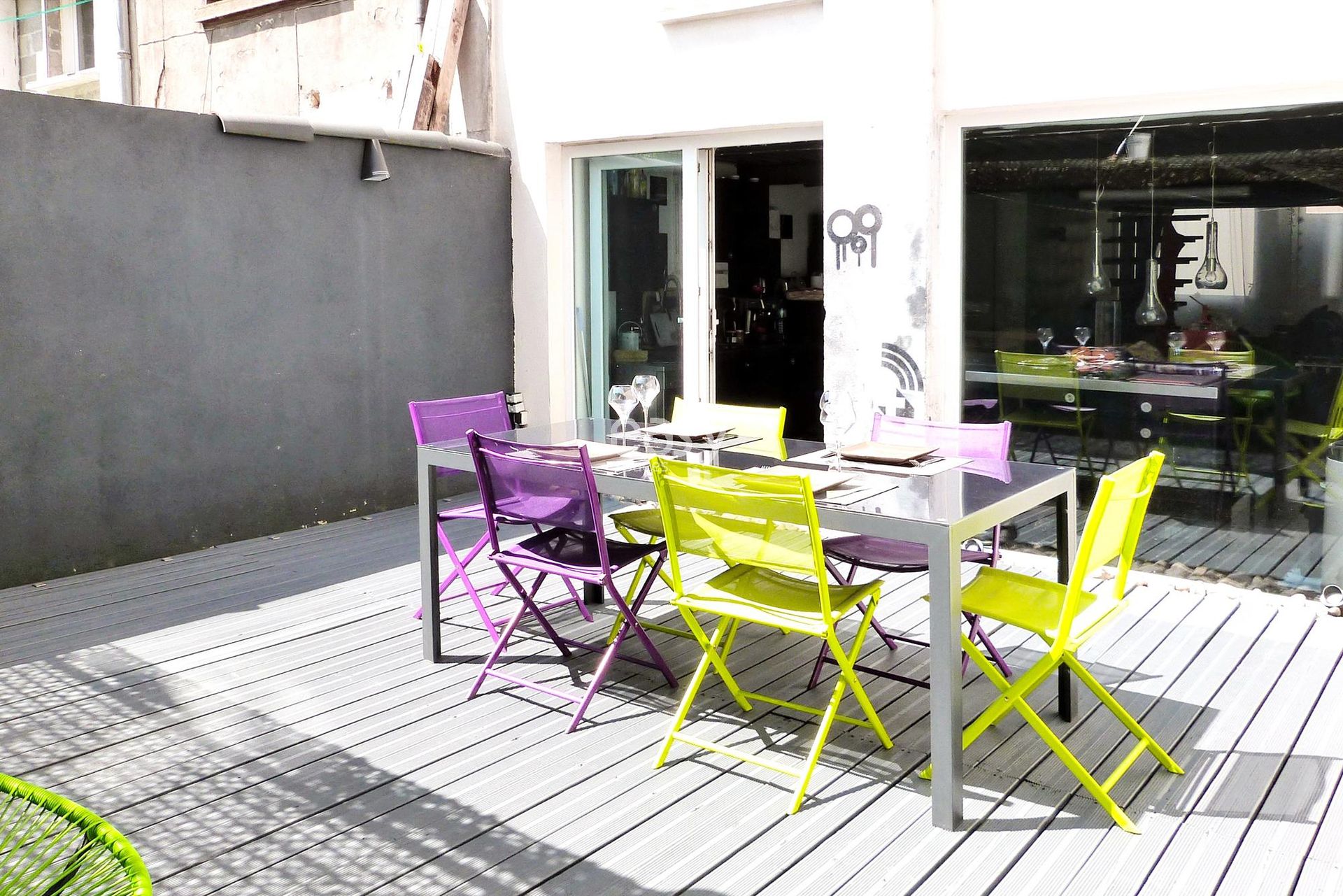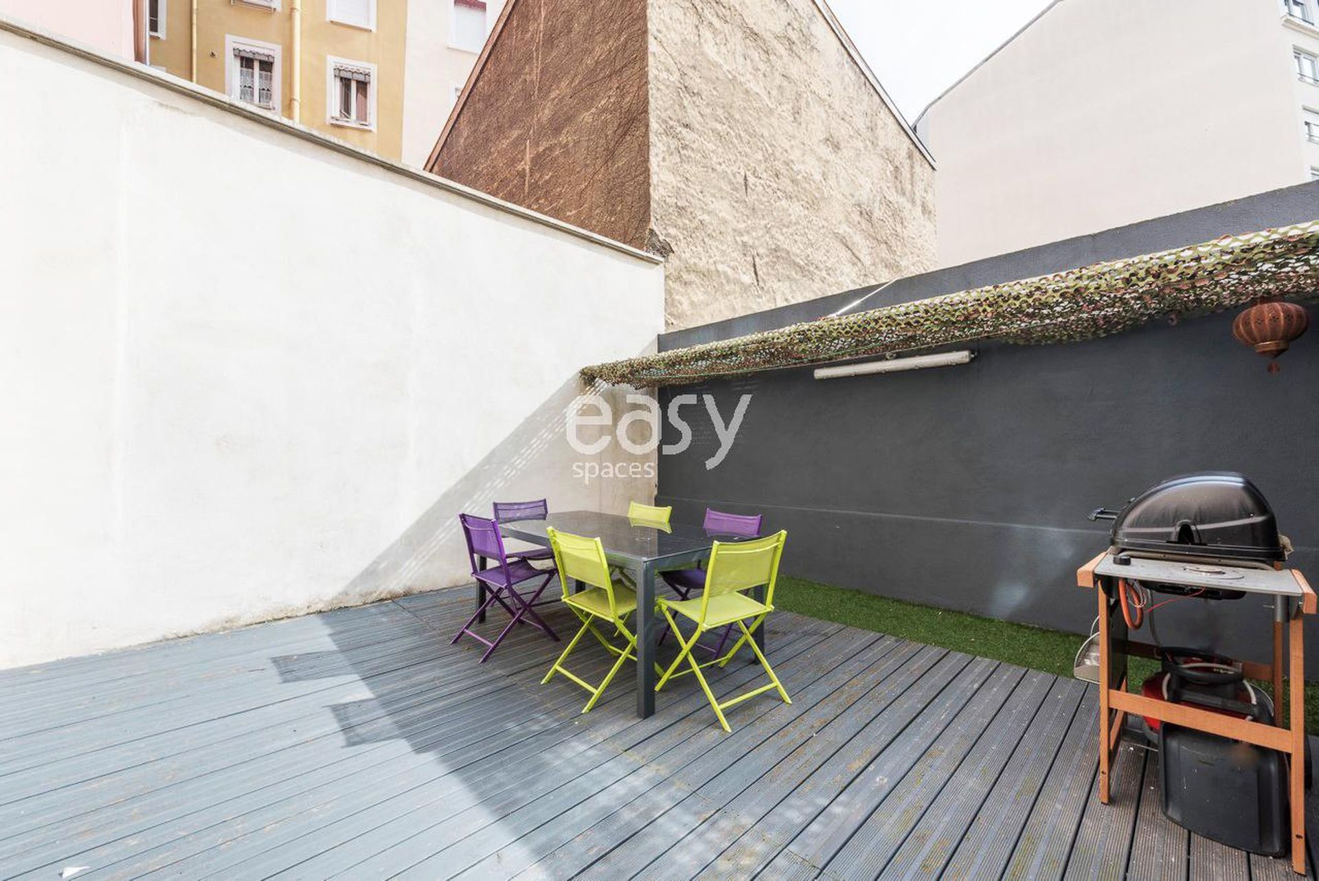 Extérieur prêt à tourner : terrasse urbaine close avec mobilier coloré, parfait pour portraits, scènes lifestyle ou pauses équipe.