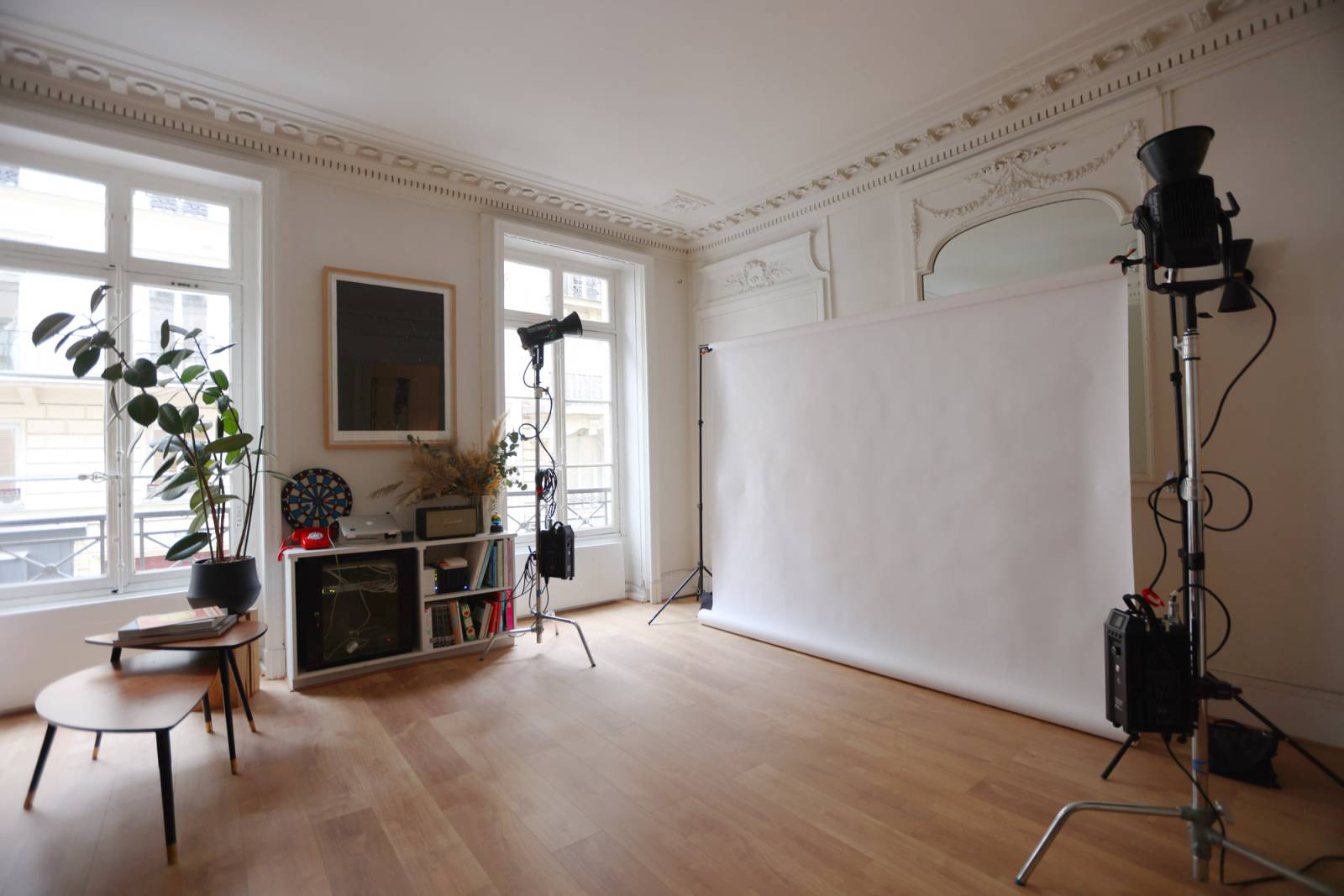 Situé au cœur de Paris, ce studio photo de 90 m² allie le charme de l’architecture haussmannienne avec un intérieur moderne et épuré. Les moulures raffinées, le parquet authentique et la hauteur sous plafond de 3,40 m créent une atmosphère lumineuse et élégante, idéale pour les shootings lifestyle, mode, éditorial ou mobilier.