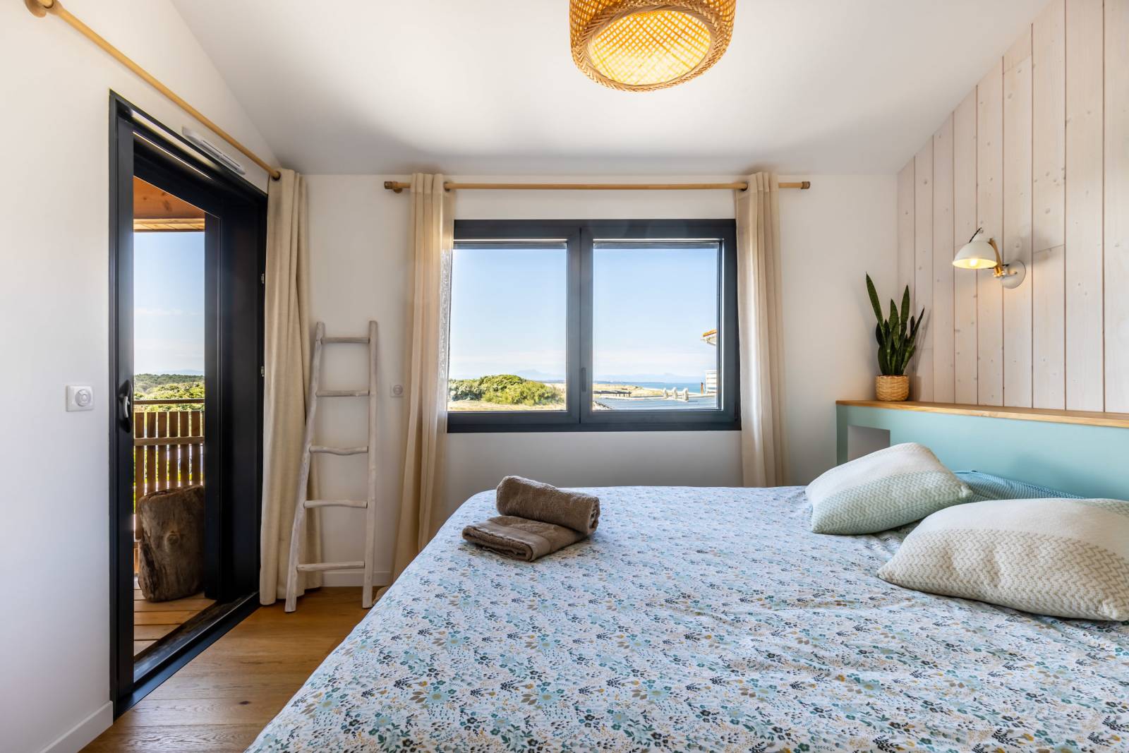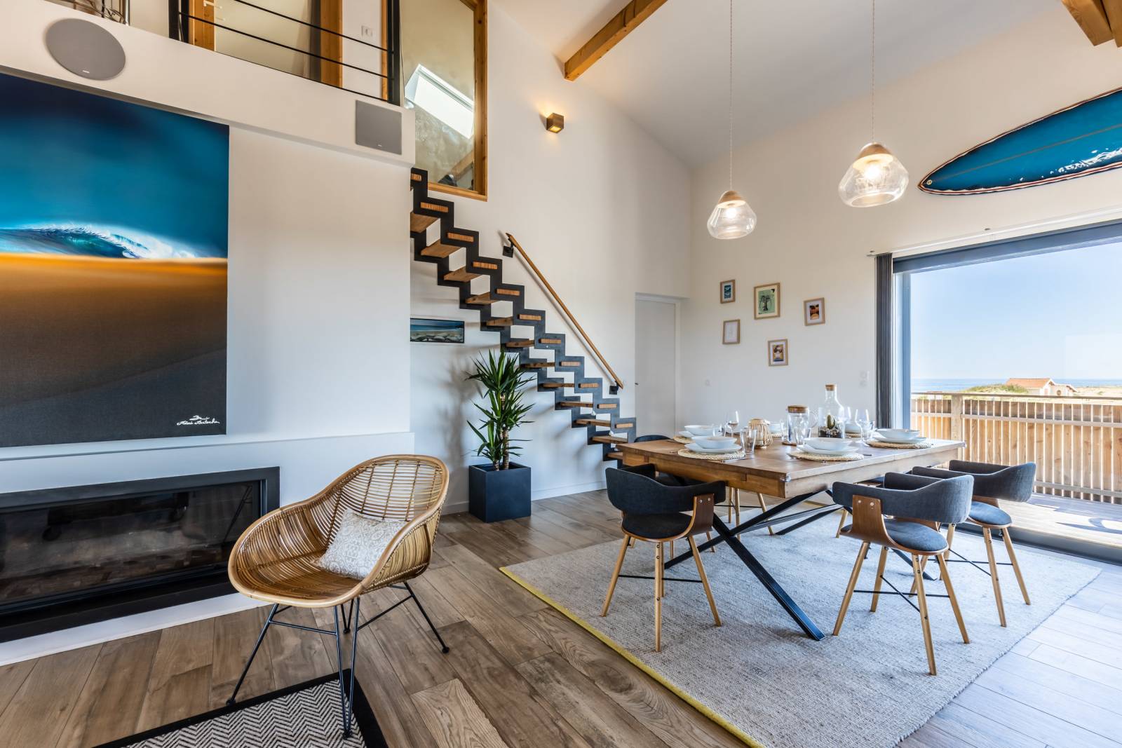 ANAELLE propose un parti pris “côte” net : bois apparent, lignes contemporaines, textiles neutres et touches graphiques. La pièce de vie en double hauteur, avec poutres visibles, escalier métal noir et mezzanine : un cadre efficace pour des scènes de marque ou des séquences lifestyle. Louer une maison accès mer pour shooting et tournage proche de Biarritz devient alors une option de parfaite pour votre prochaine production photo.