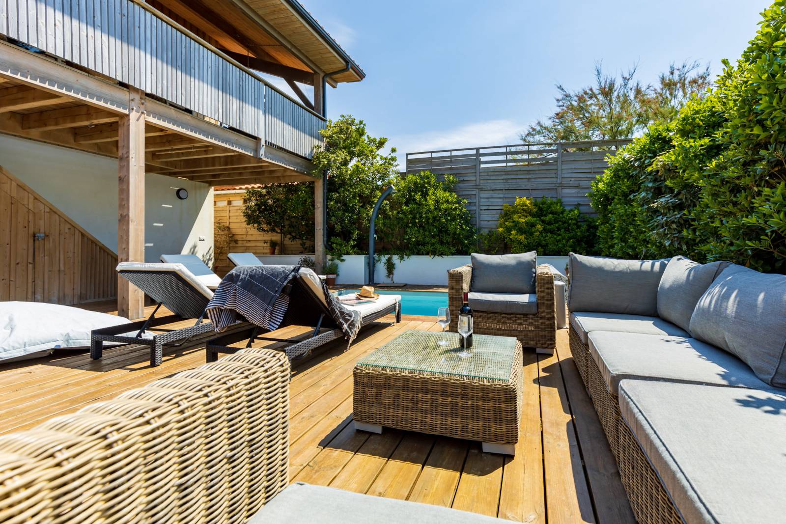 Pour un shooting ou un tournage, louer une maison accès mer proche de Biarritz permet de varier rapidement : plan large depuis la mezzanine, séquence table en lumière naturelle, puis bascule sur terrasse vue mer sans changement de décor.