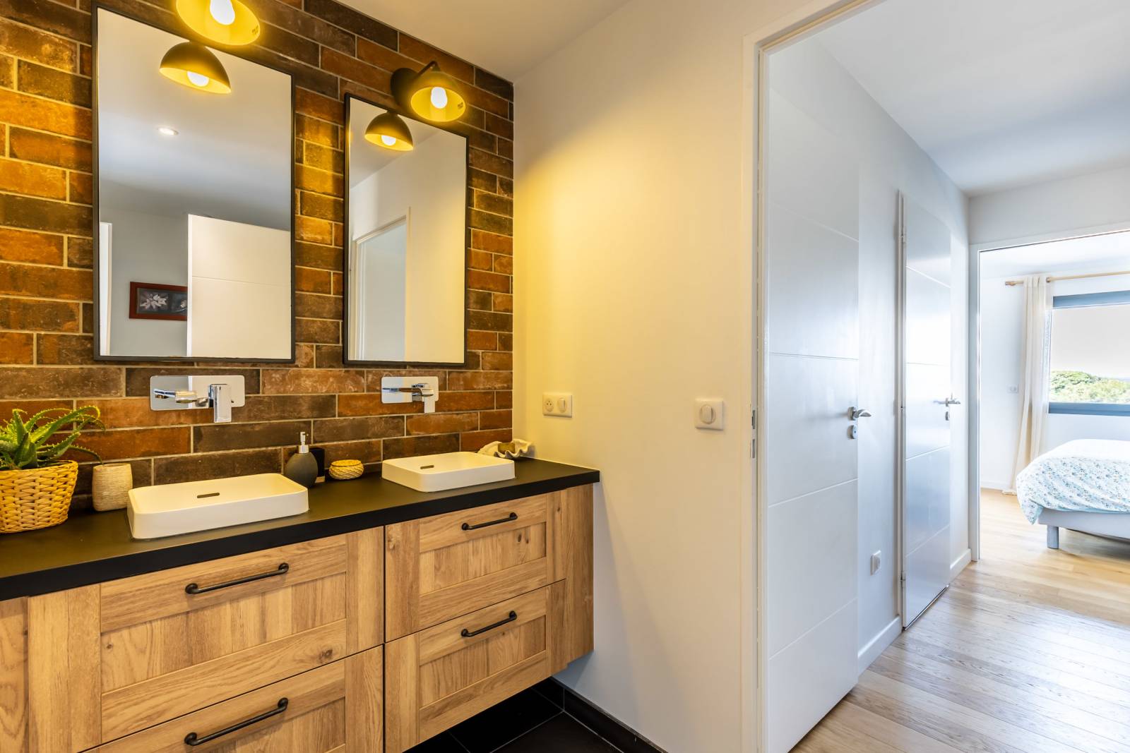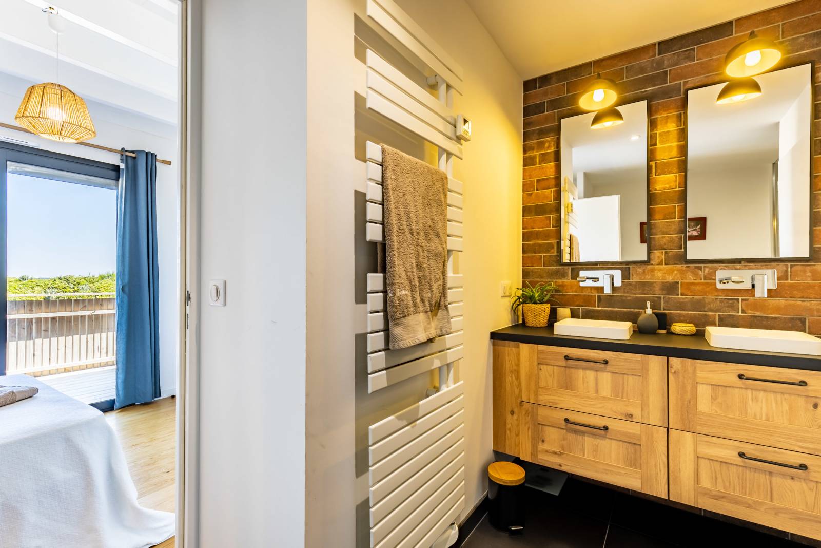 Les images mettent en avant des matières franches : bardage bois à l’extérieur, terrasse en lames, et à l’intérieur un mix bois clair / métal noir / teintes sable. La salle de bain se distingue avec une crédence type brique, double vasque et plan sombre, parfait pour des détails “grooming” ou beauté. Dans une chambre, la tête de lit colorée et le lambris clair structurent un cadre simple, avec ouverture sur l’océan.
