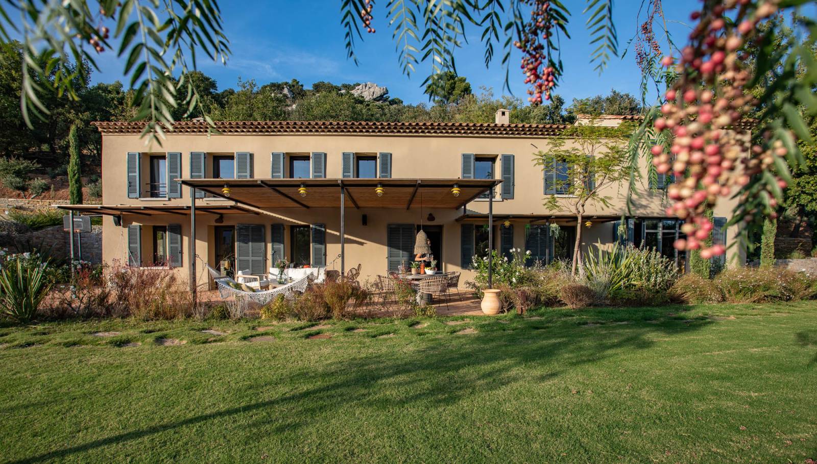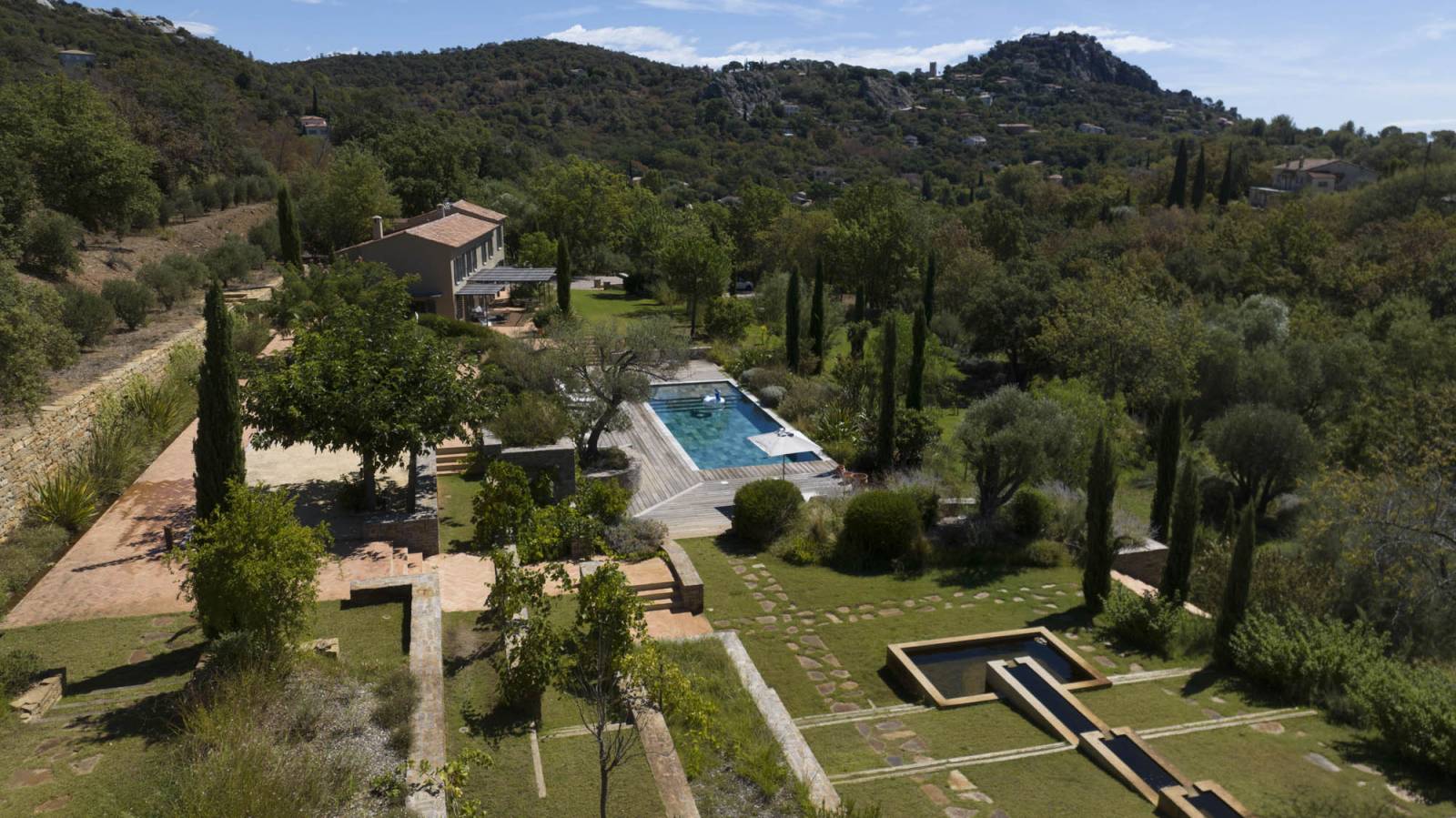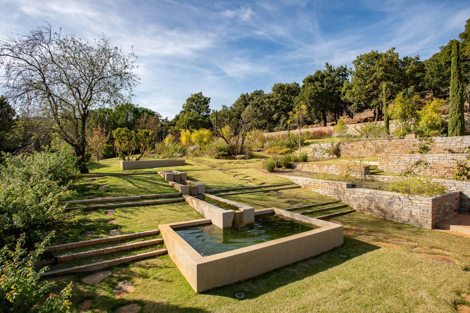 Le jardin paysager de 6 hectares, entre espaces plats et restanques méditerranéennes, offre une diversité de décors : allées ombragées, massifs fleuris, coins sauvages et espaces soigneusement entretenus. C’est un véritable décor naturel, à la fois bucolique et chic.