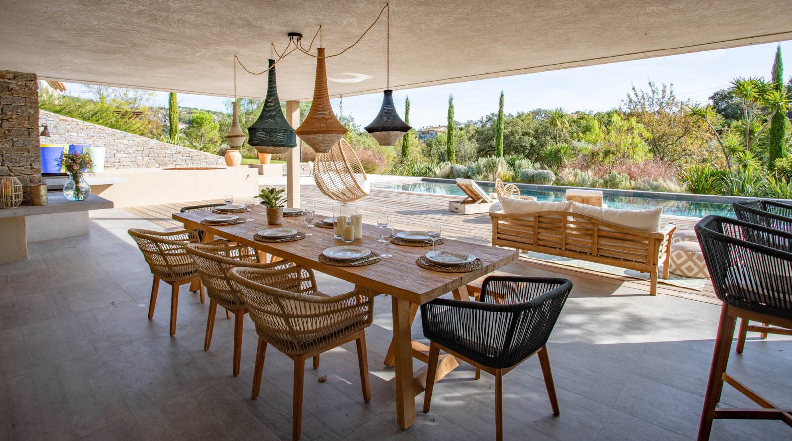 La grande terrasse ouverte sur la campagne environnante permet d’organiser des scènes en extérieur avec une belle vue dégagée. Le pool house en pierre, avec sa cuisine extérieure entièrement équipée, complète parfaitement le cadre et donne sur la superbe piscine de 15 mètres — un atout visuel majeur pour des prises de vue estivales, des shootings mobilier outdoor ou des tournages lifestyle haut de gamme.