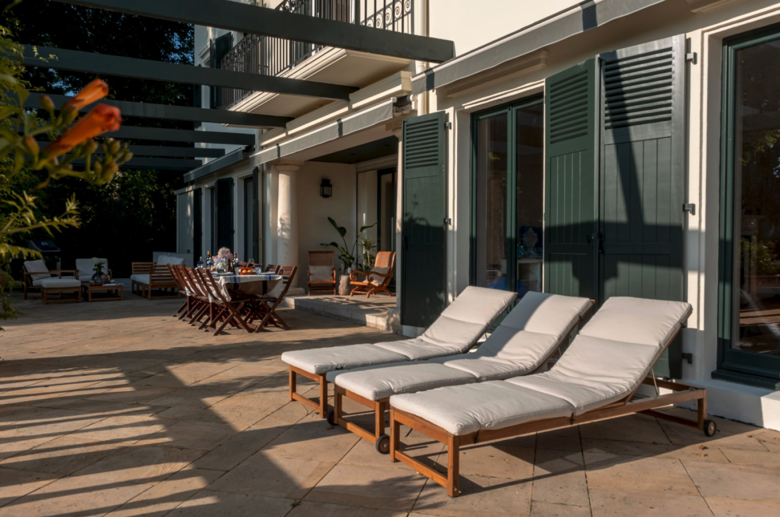 Le jardin, soigneusement paysagé, permet l’installation de mobilier outdoor ou de structures événementielles.