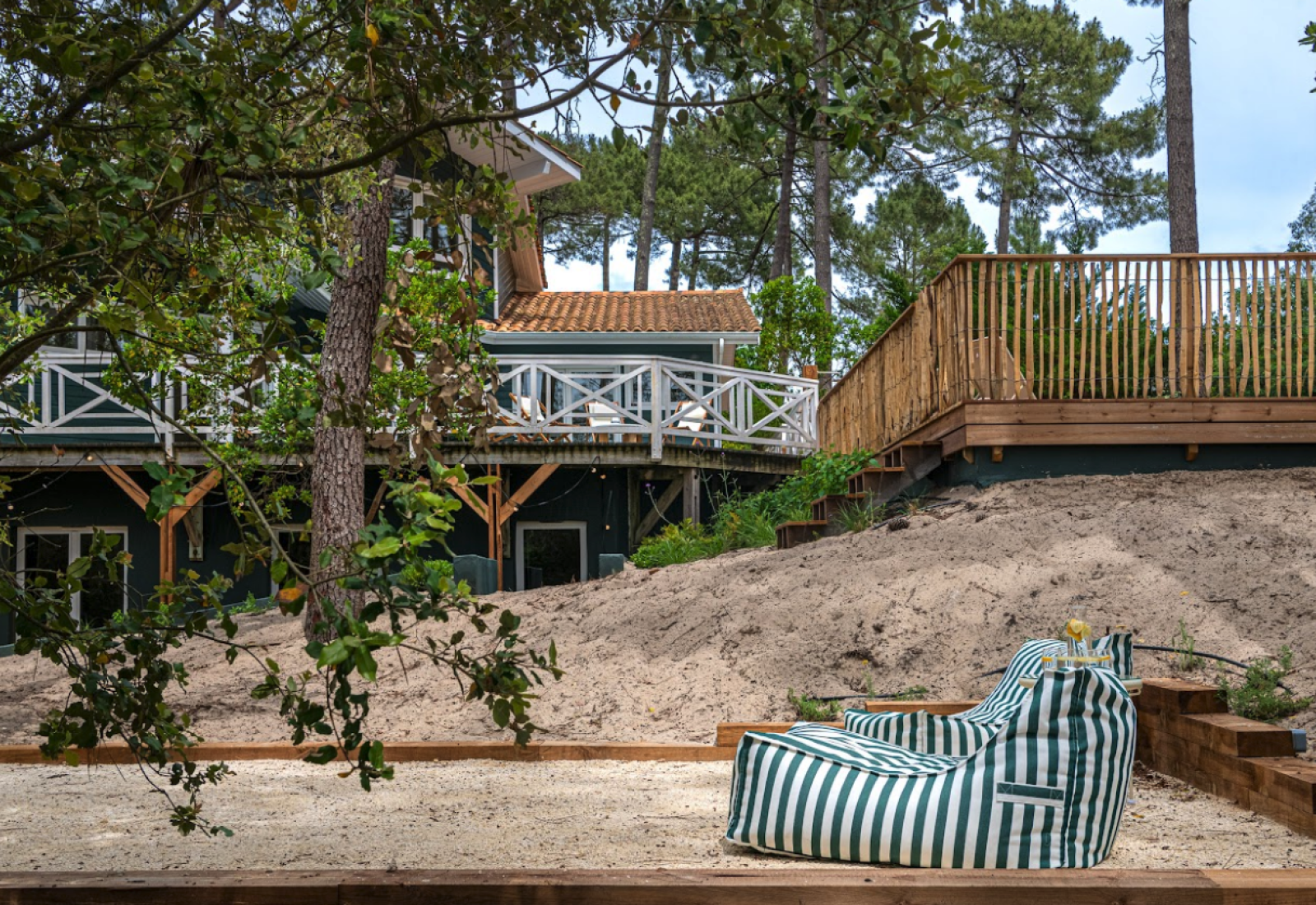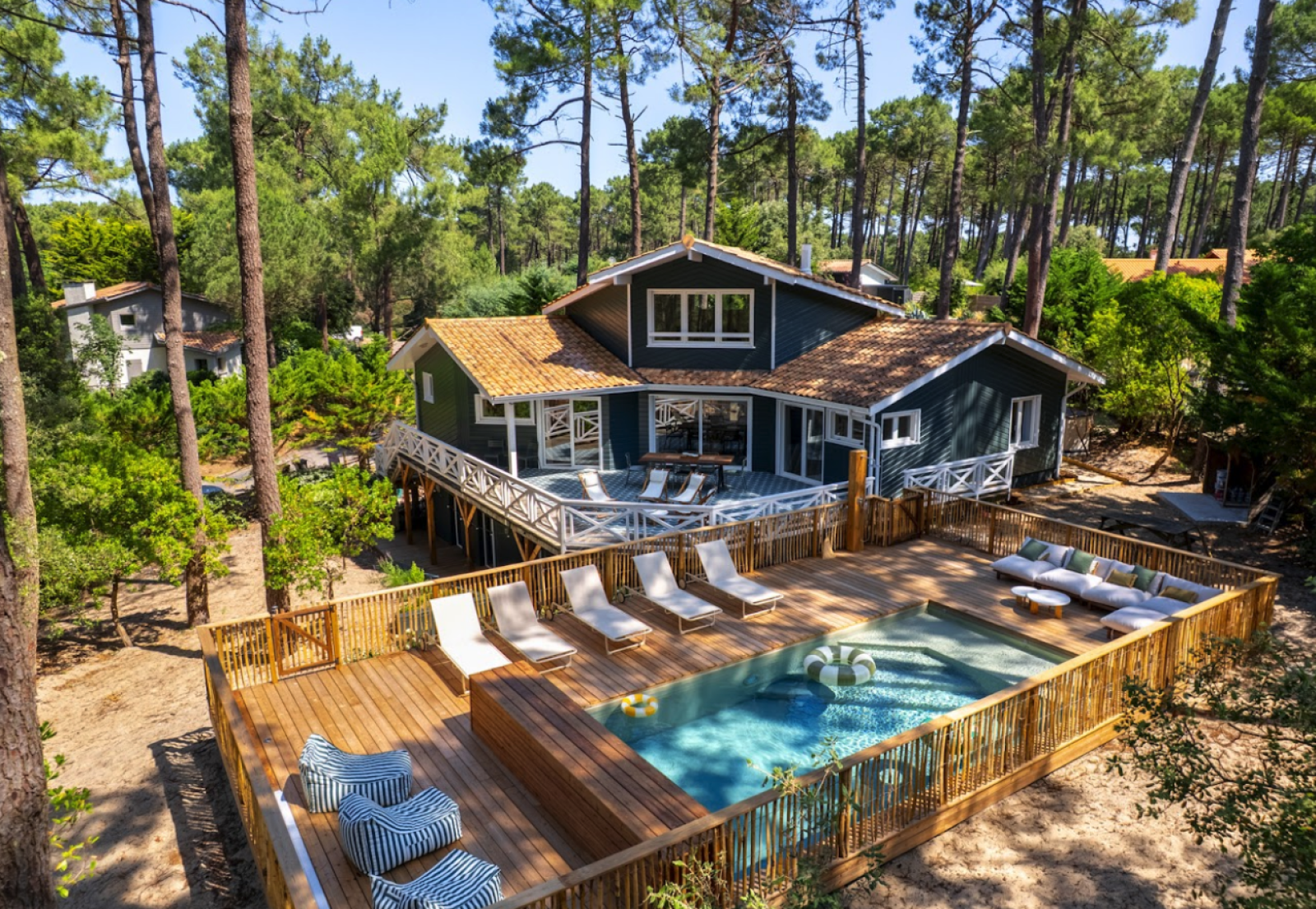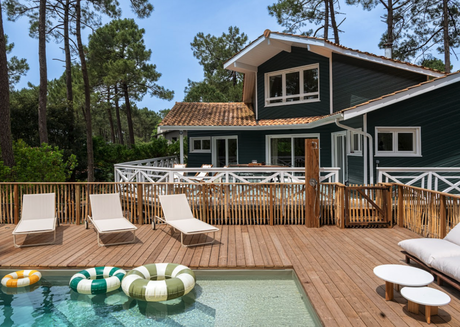 Cette maison typique de Lacanau en bois, disponible à la location pour shooting et événementiel professionnel, est située au cœur des pins dans un environnement naturel et préservé.