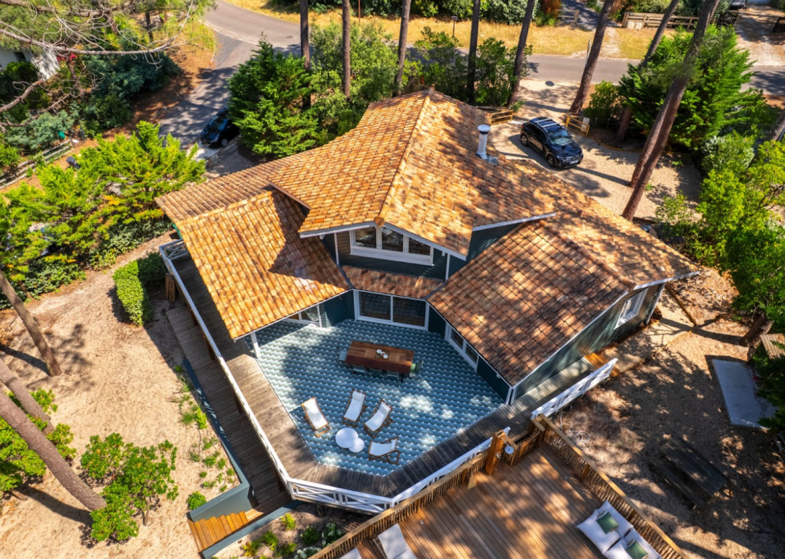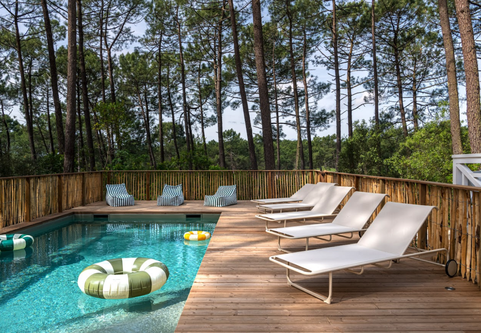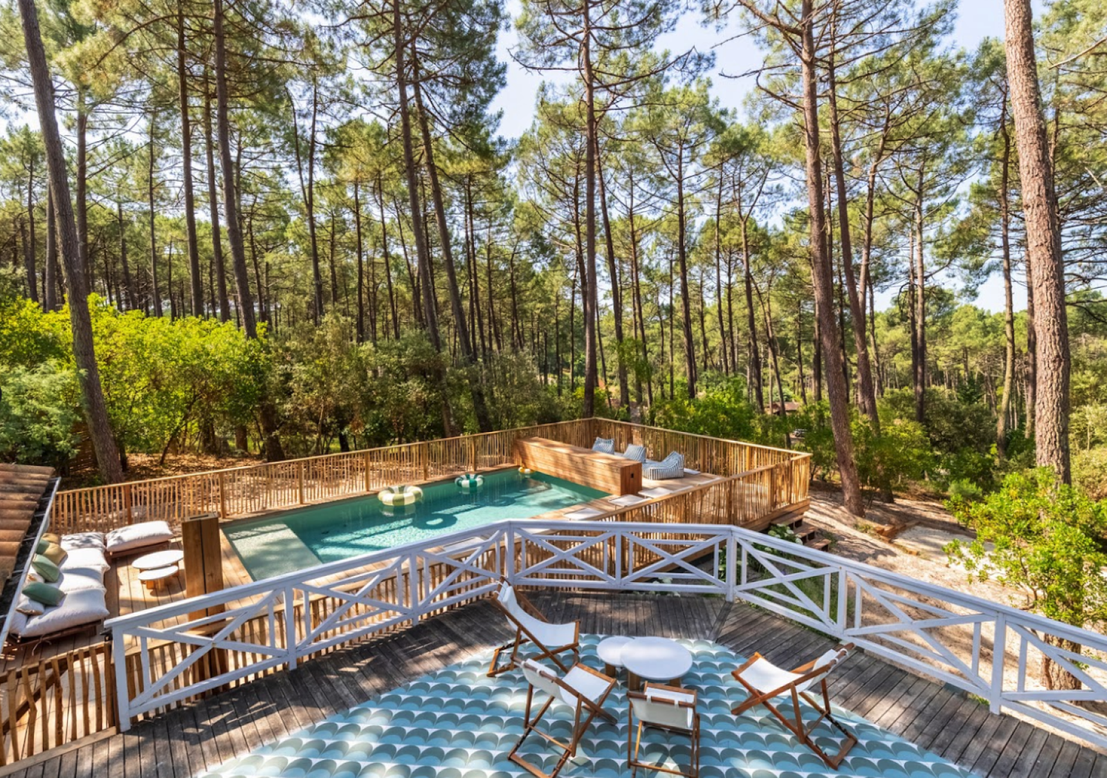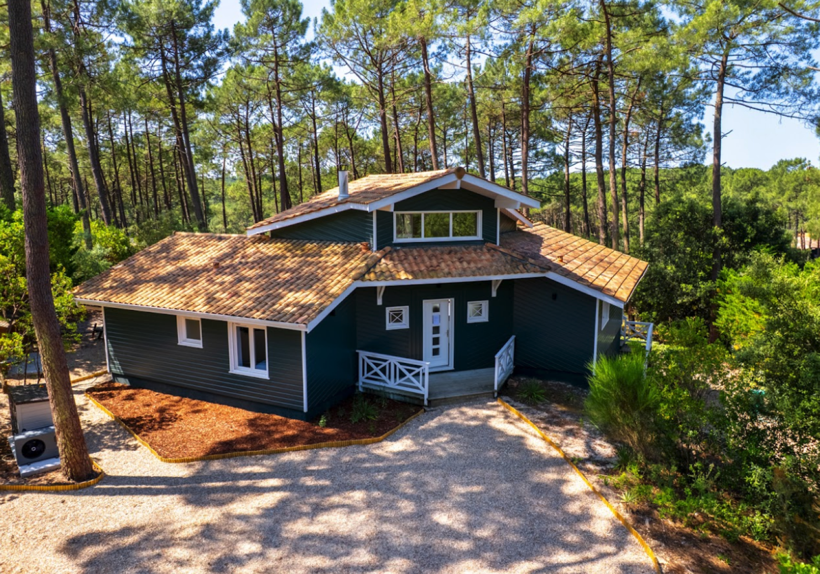 Cette maison typique de Lacanau en bois, disponible à la location pour shooting et événementiel professionnel, est située au cœur des pins dans un environnement naturel et préservé.