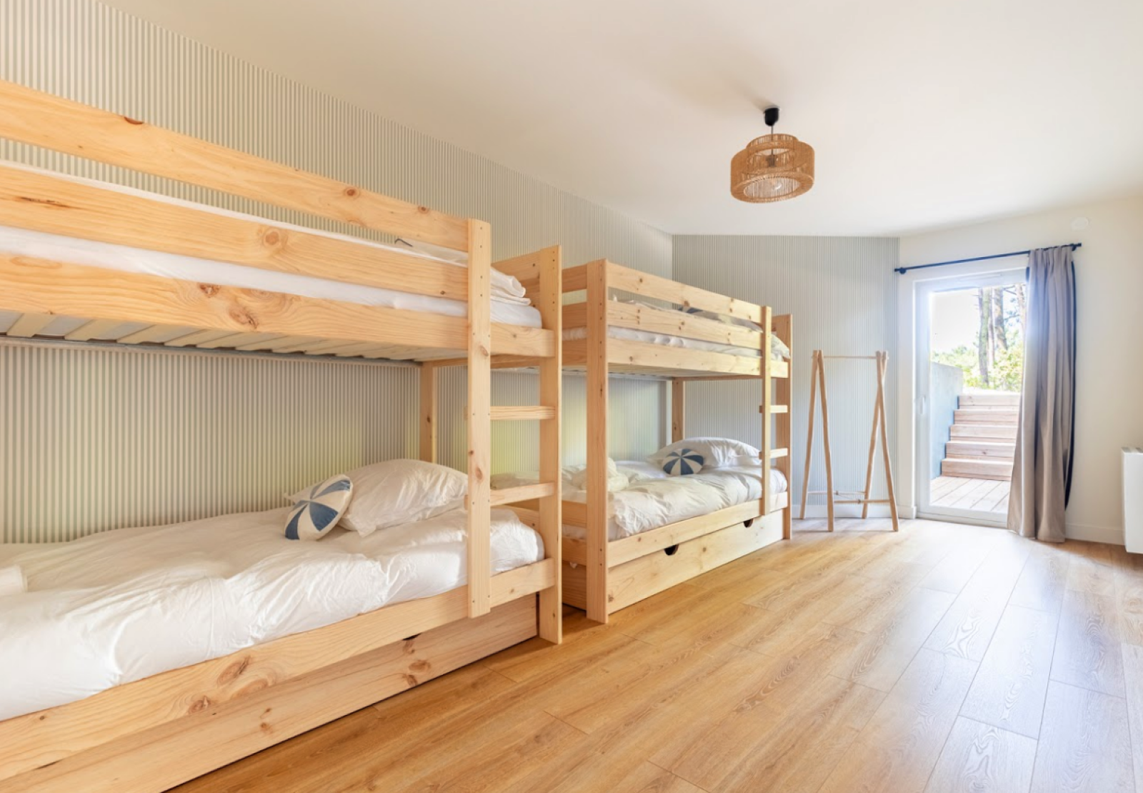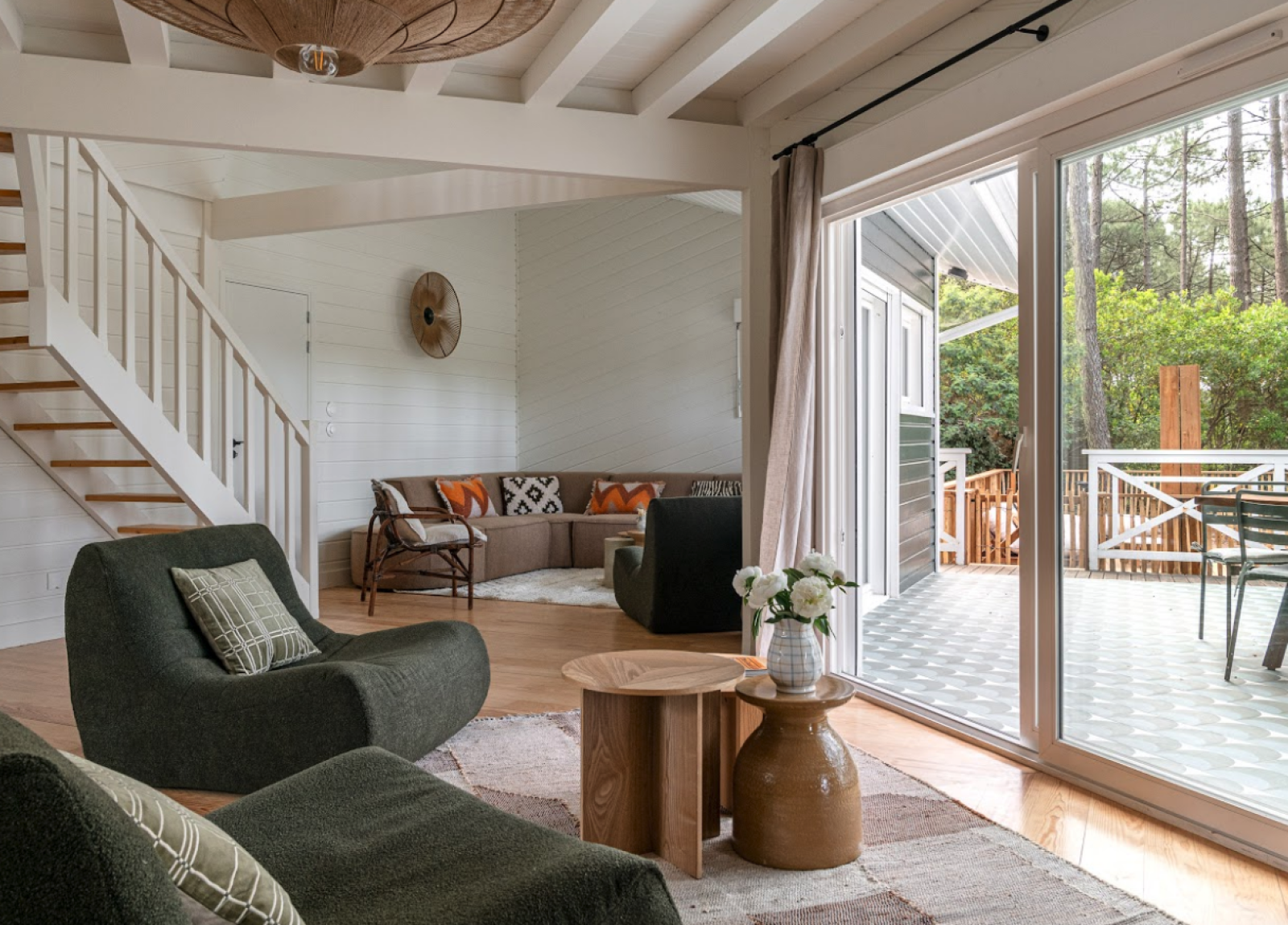 À l’extérieur, le jardin de 1 500 m² offre un cadre naturel exceptionnel au cœur des pins.
