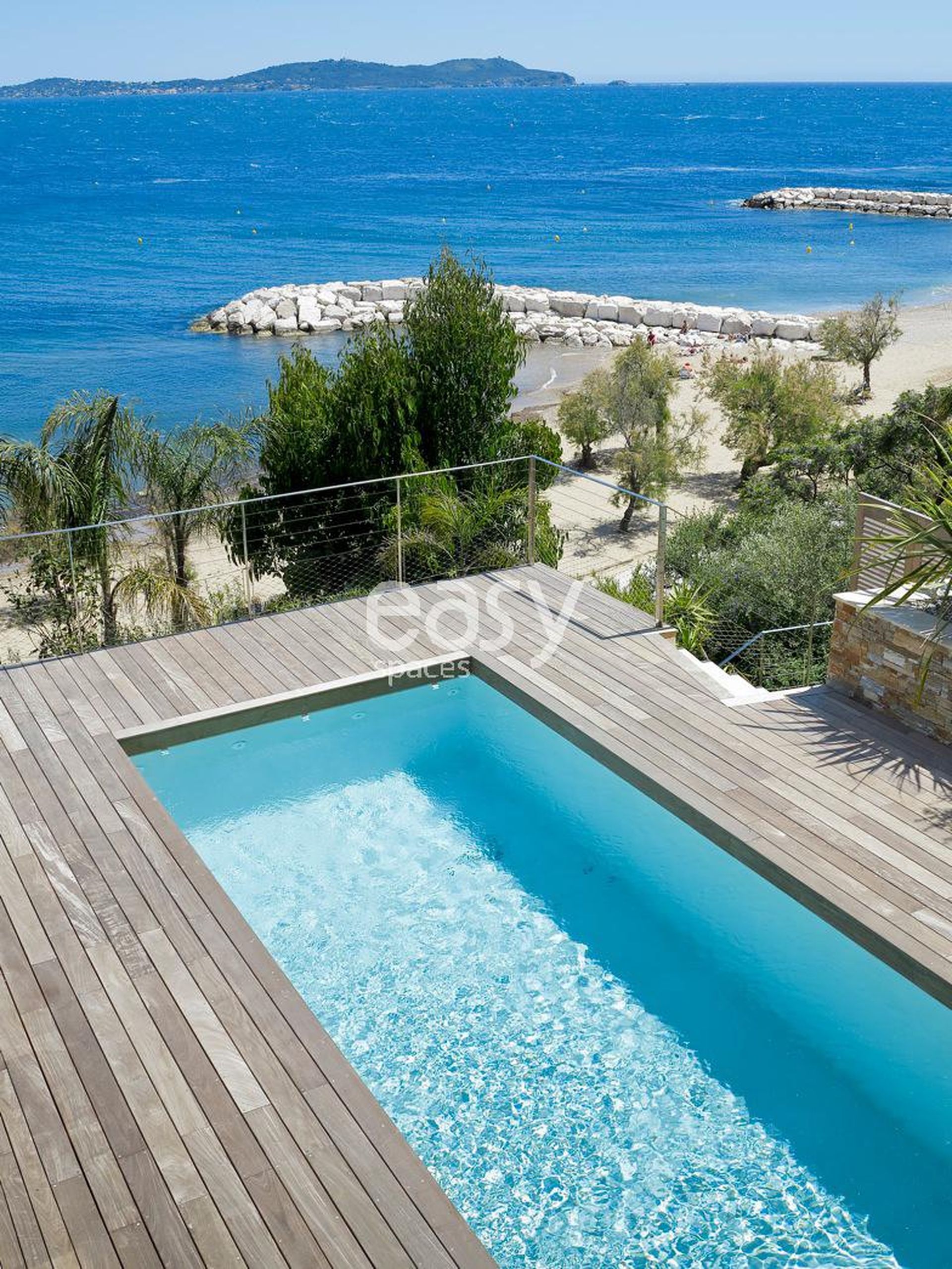 À l’extérieur, la piscine vue mer (7,11 x 3,10 m), le jardin de 700 m², la terrasse de 80 m² et le toit-terrasse composent une succession de décors complémentaires : plan large face mer, ambiance jardin, moments plus intimistes en terrasse ou séquences directement sur le sable grâce à l’accès plage. Cet environnement en bord de mer se prête particulièrement bien à une production photo dans le Var, à un film publicitaire ou à un lancement de produit pour une marque tournée vers l’outdoor, le lifestyle ou le haut de gamme.