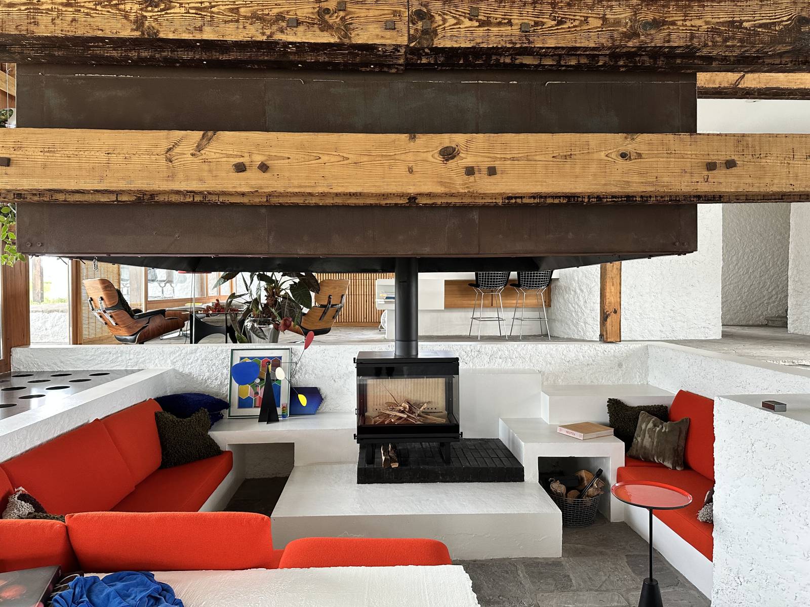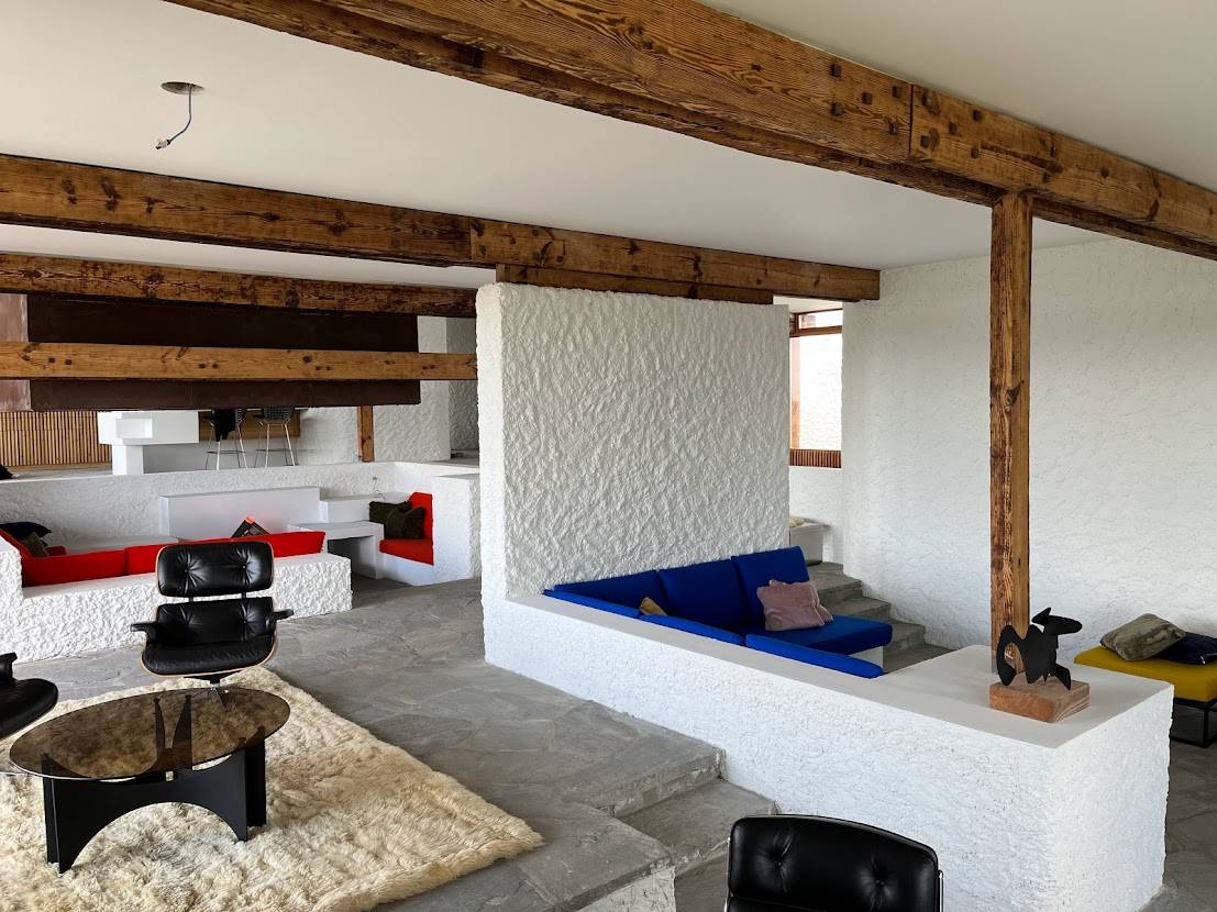 La décoration intérieure soigneusement pensée s’inscrit dans un style résolument design, inspiré des années 70 : mobilier vintage, couleurs chaleureuses, matières nobles et détails graphiques confèrent à la villa une signature visuelle forte.