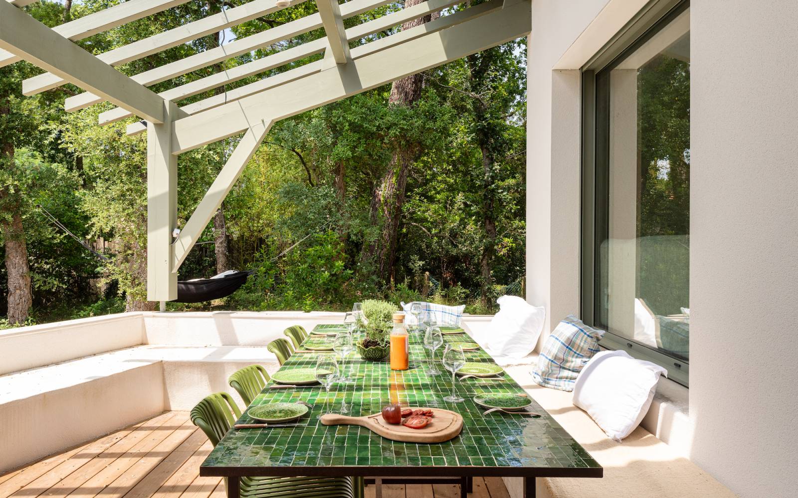 Ses larges baies vitrées s'ouvrent sur une terrasse en bois spacieuse, idéale pour des prises de vues en extérieur, du mobilier de jardin ou des réceptions en plein air.