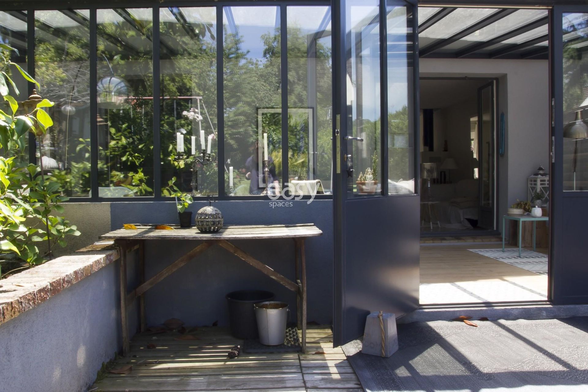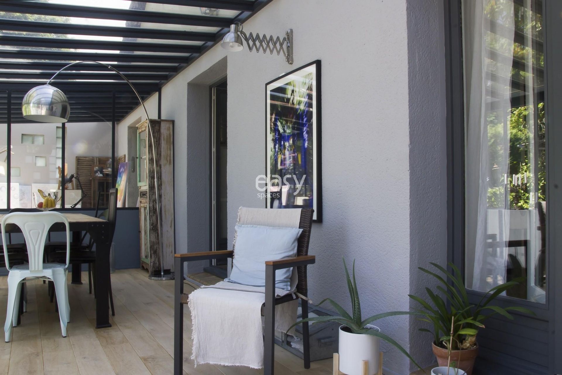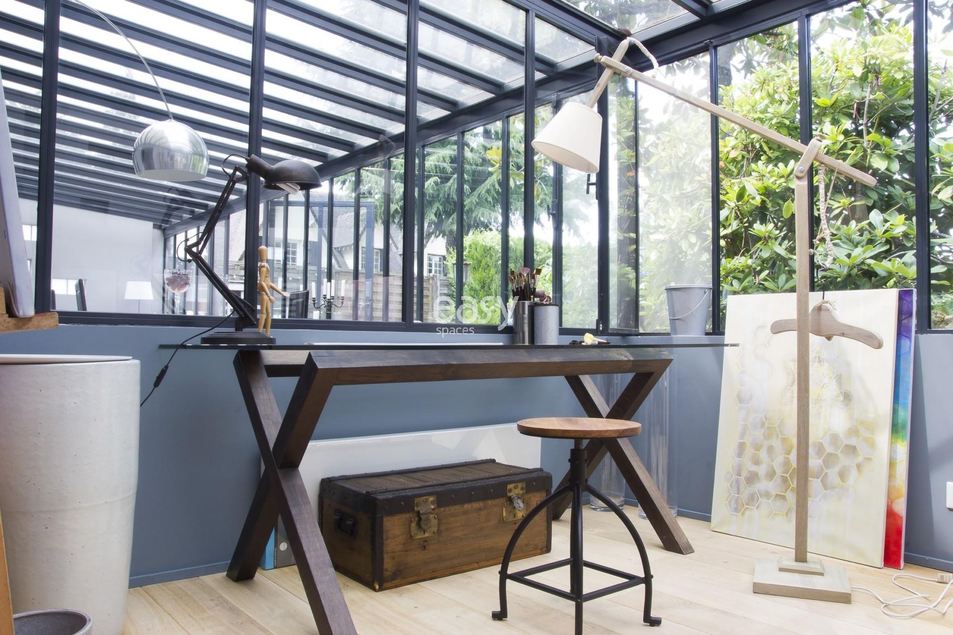 Cette jolie maison près de Paris, avec ses grandes verrières style atelier d'artiste et son esprit vacances, bénéficie d'un séjour lumineux avec cheminée de 60m2 et offre un cadre photogénique.