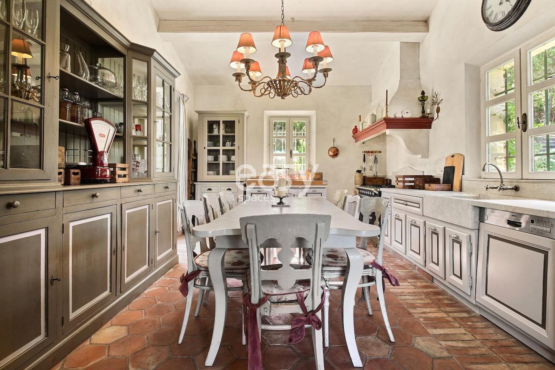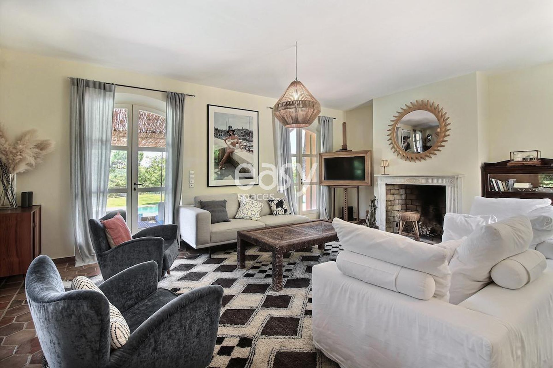 Son bel espace séjour avec cheminée et salle à manger en enfilade, sa décoration chaleureuse et soignée, sa terrasse avec piscine et son cadre incroyable en pleine nature en font un décor idéal pour un édito mode ou pour un shooting déco par exemple.