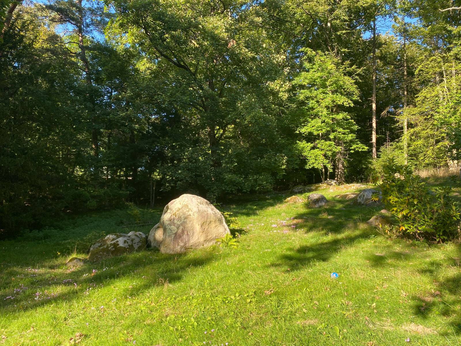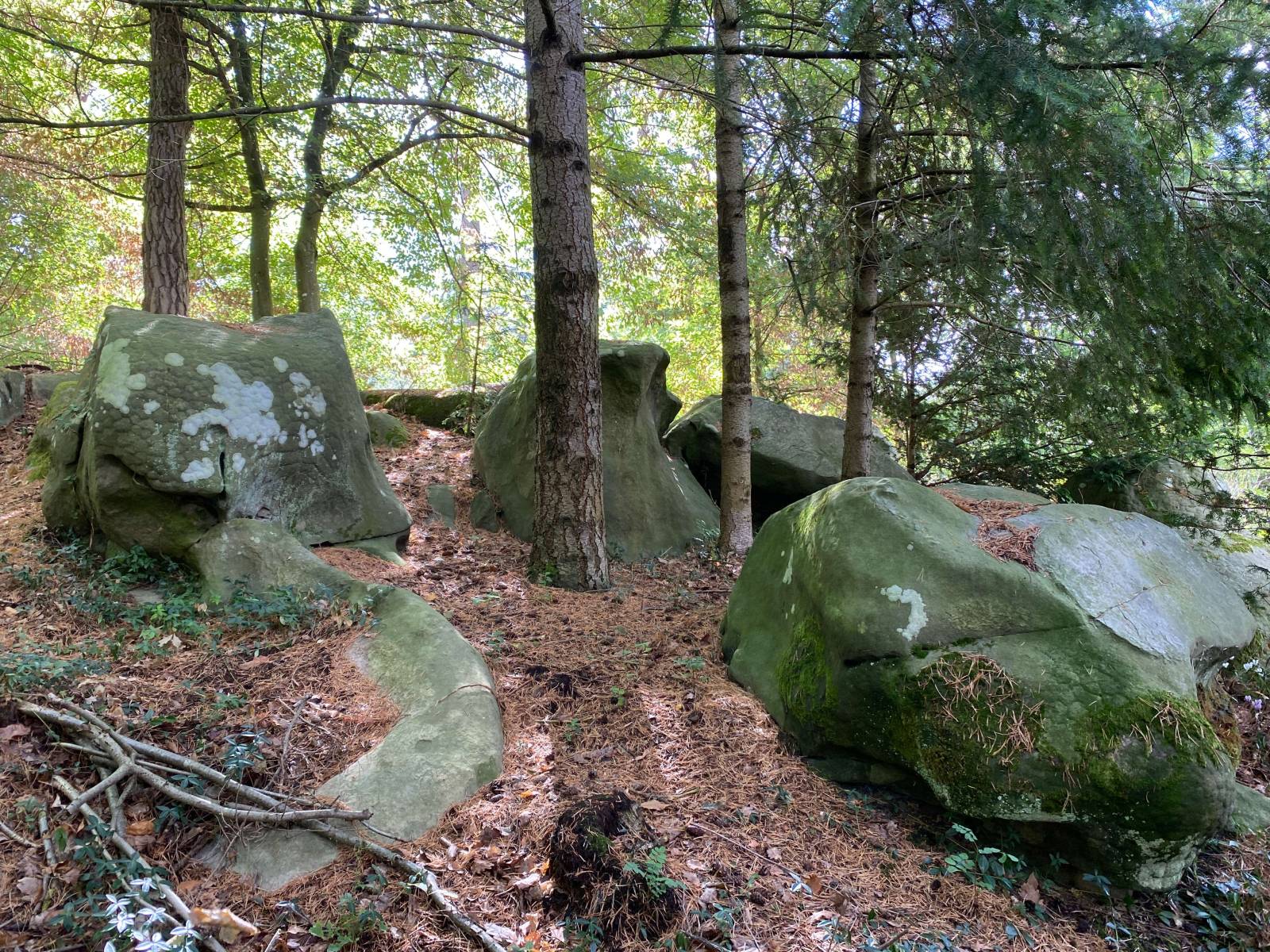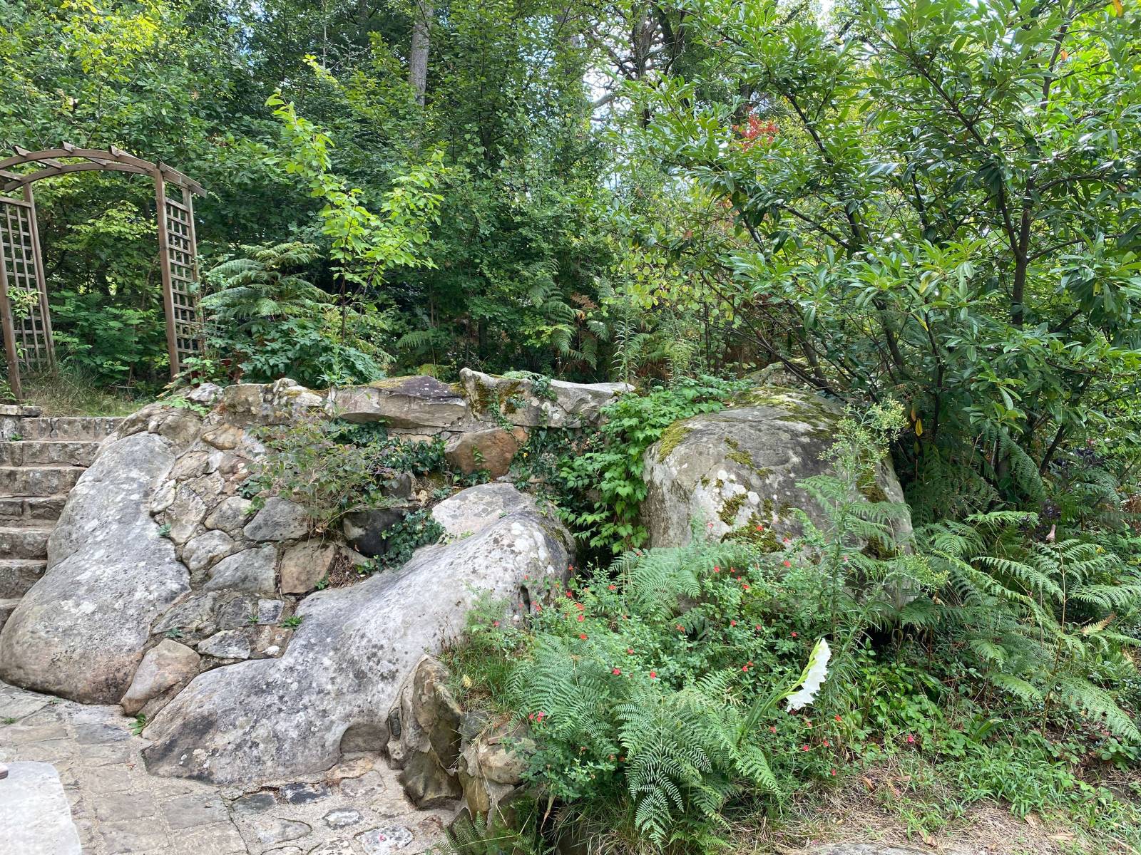 Ici, ce décor atypique vient tout seul : une vieille maison en pierres qui assume ses aspérités, posée au milieu d’un parc verdoyant de 10 000 m². Entre les grands arbres, les clairières et les zones plus denses avec de la roche ; certaines couvertes de mousse qui donnent un relief très photogénique et une vraie sensation de sous-bois.