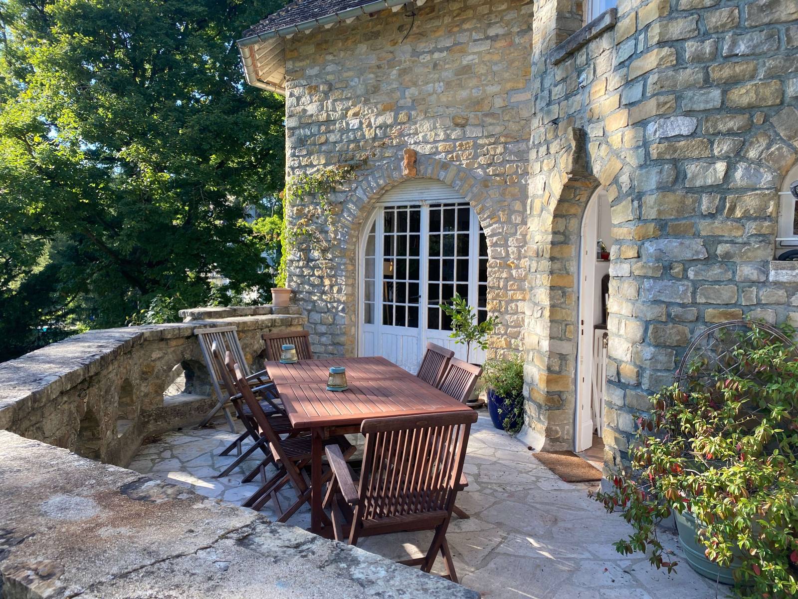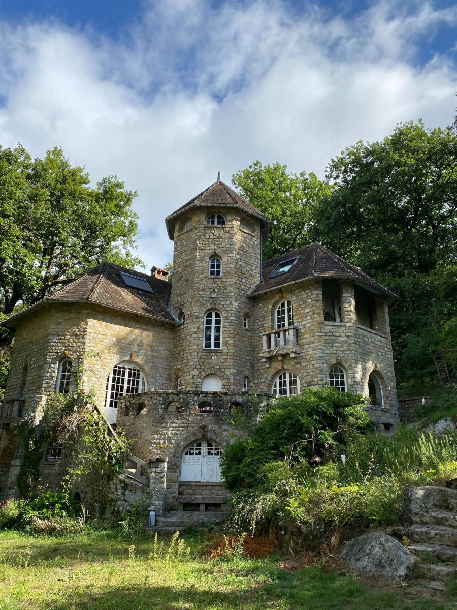 En façade, on lit une vieille maison en pierres avec une tour, des baies cintrées et une terrasse minérale. Les arcs, la pierre et les ombres portées des arbres donnent tout de suite un rendu "charmant" .