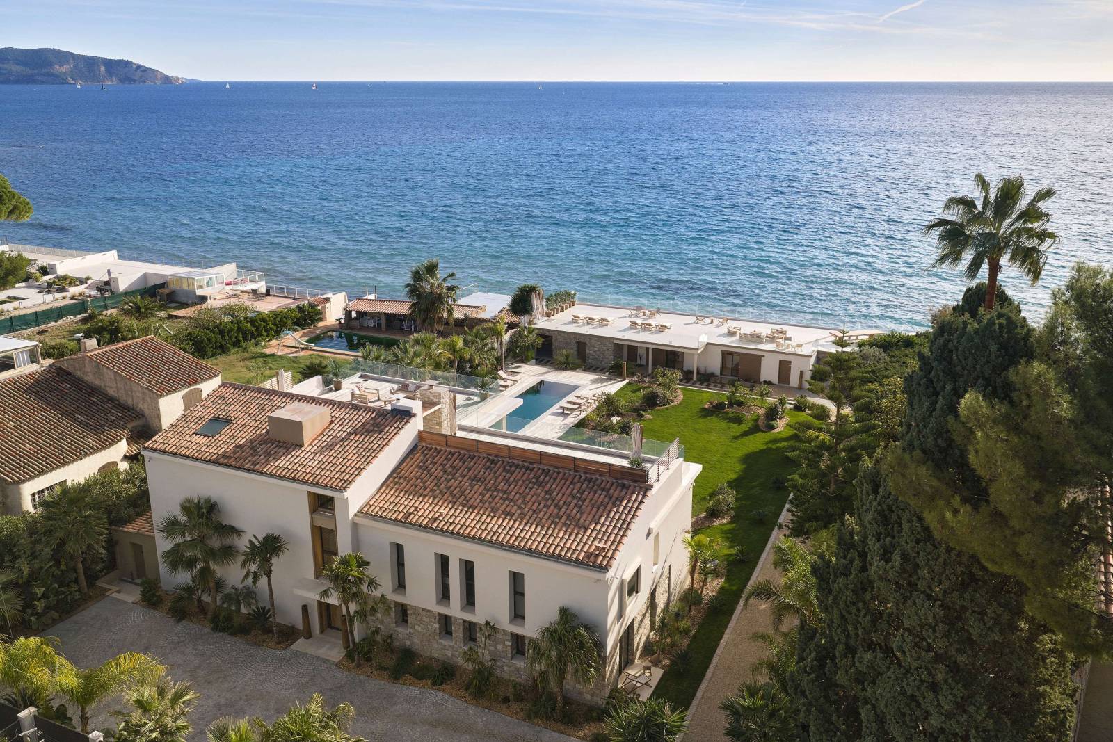 Les extérieurs sont un véritable plateau : terrasse bois autour de la piscine, grande esplanade minérale face à la mer, et jardin planté (palmiers/essences méditerranéennes visibles).