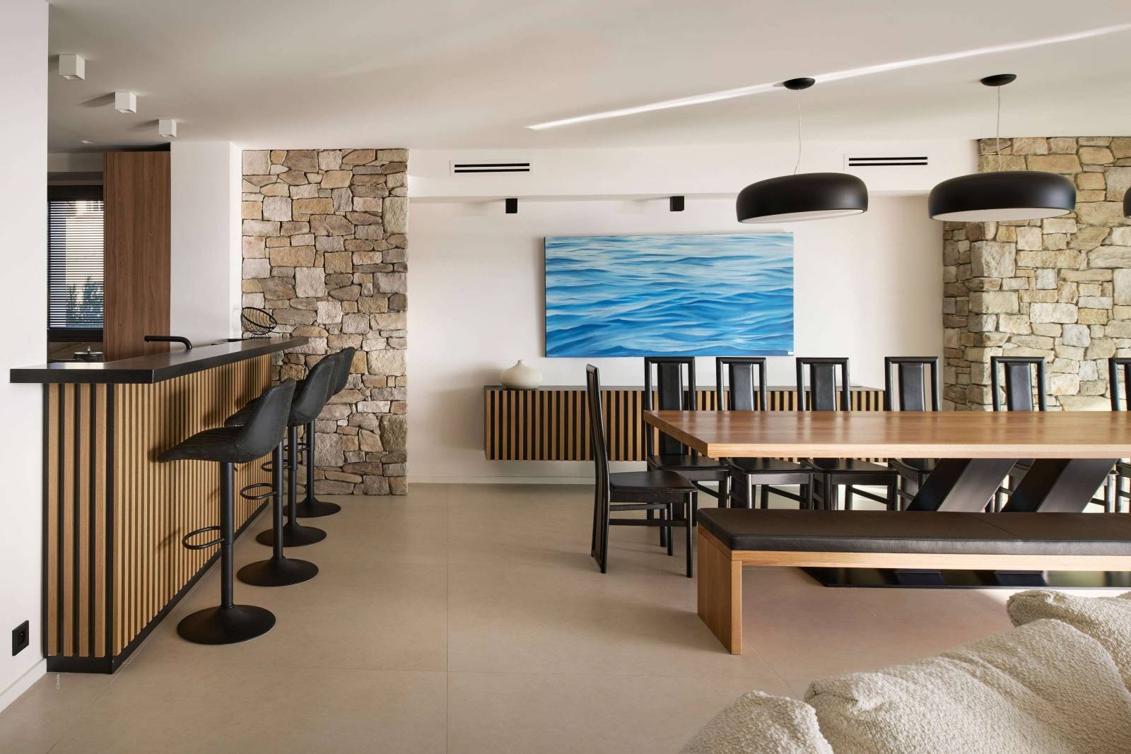 Côté matières et lumière, le lieu semble conçu autour de grandes ouvertures : baies pleine hauteur, rideaux clairs, et vues mer dégagées depuis plusieurs pièces (y compris des chambres). Le contraste “blanc + bois + pierre” donne le décor parfait pour la mode, avec une colorimétrie facile à maîtriser.