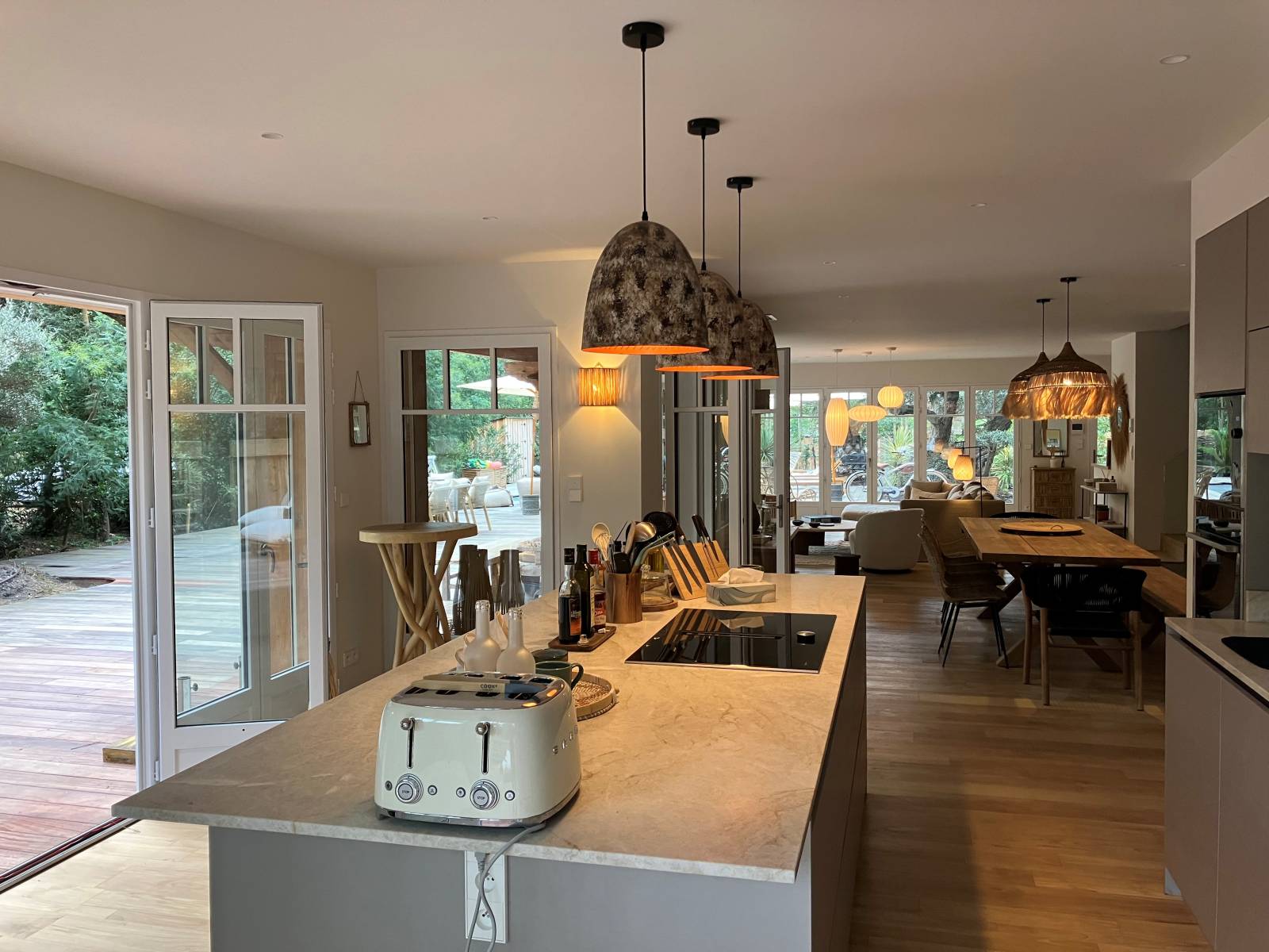 Le jardin et la terrasse offrent une configuration fluide et élégante, propice à des moments de convivialité raffinés dans l’esprit chic et décontracté du bassin d’Arcachon.