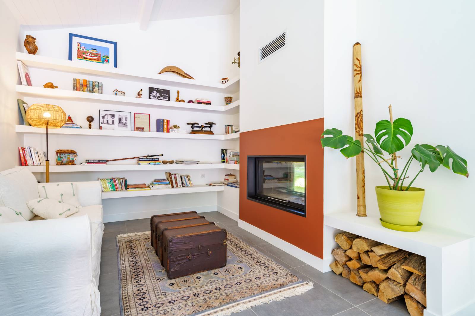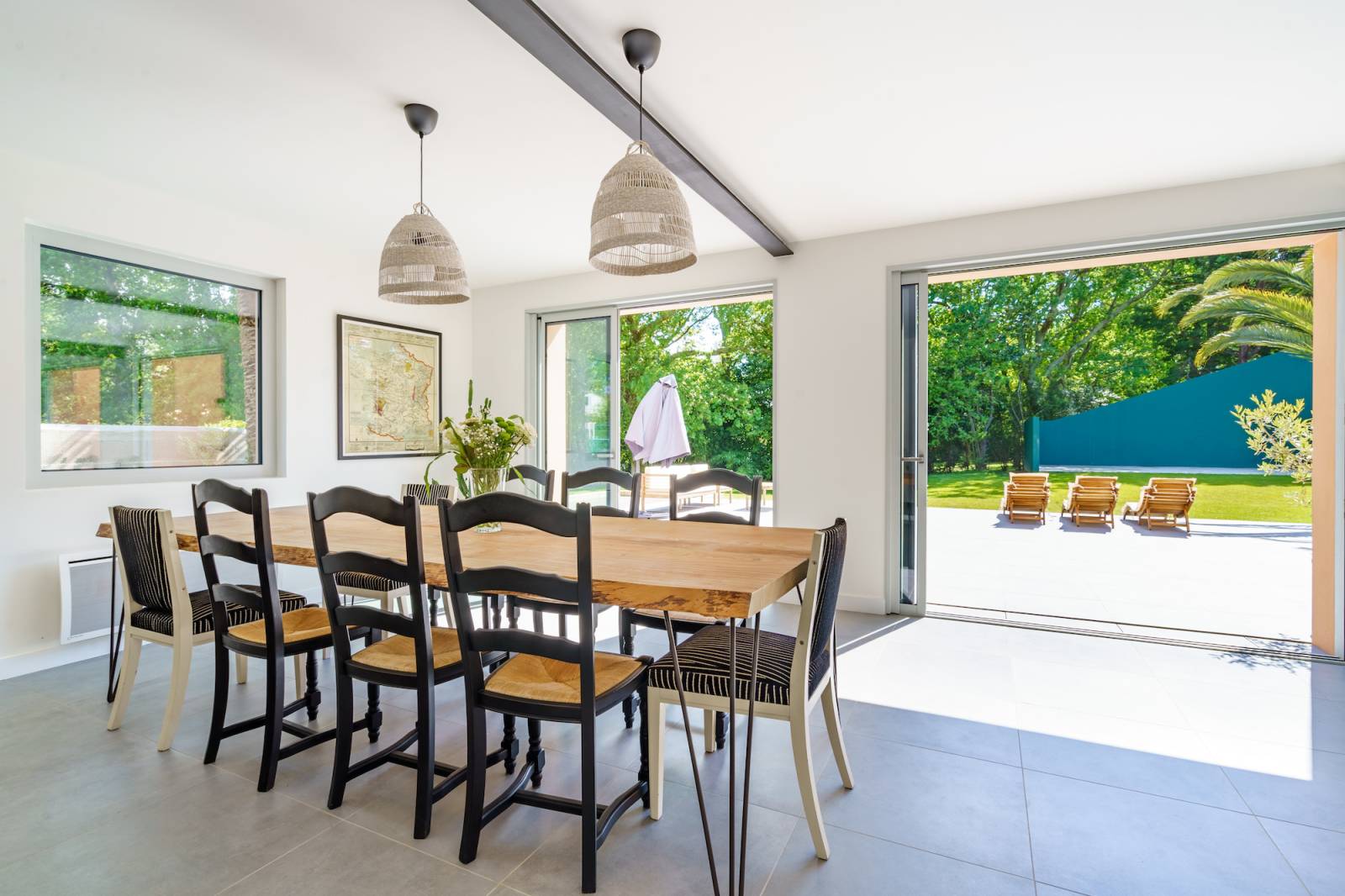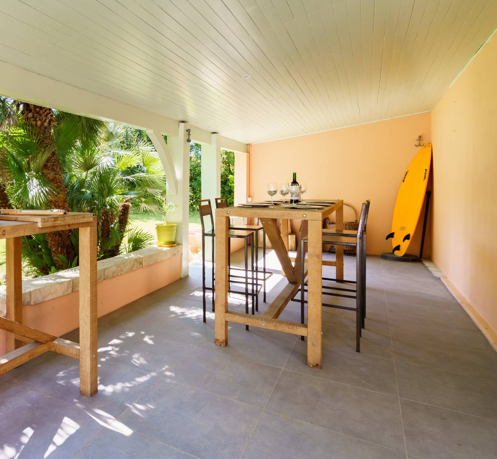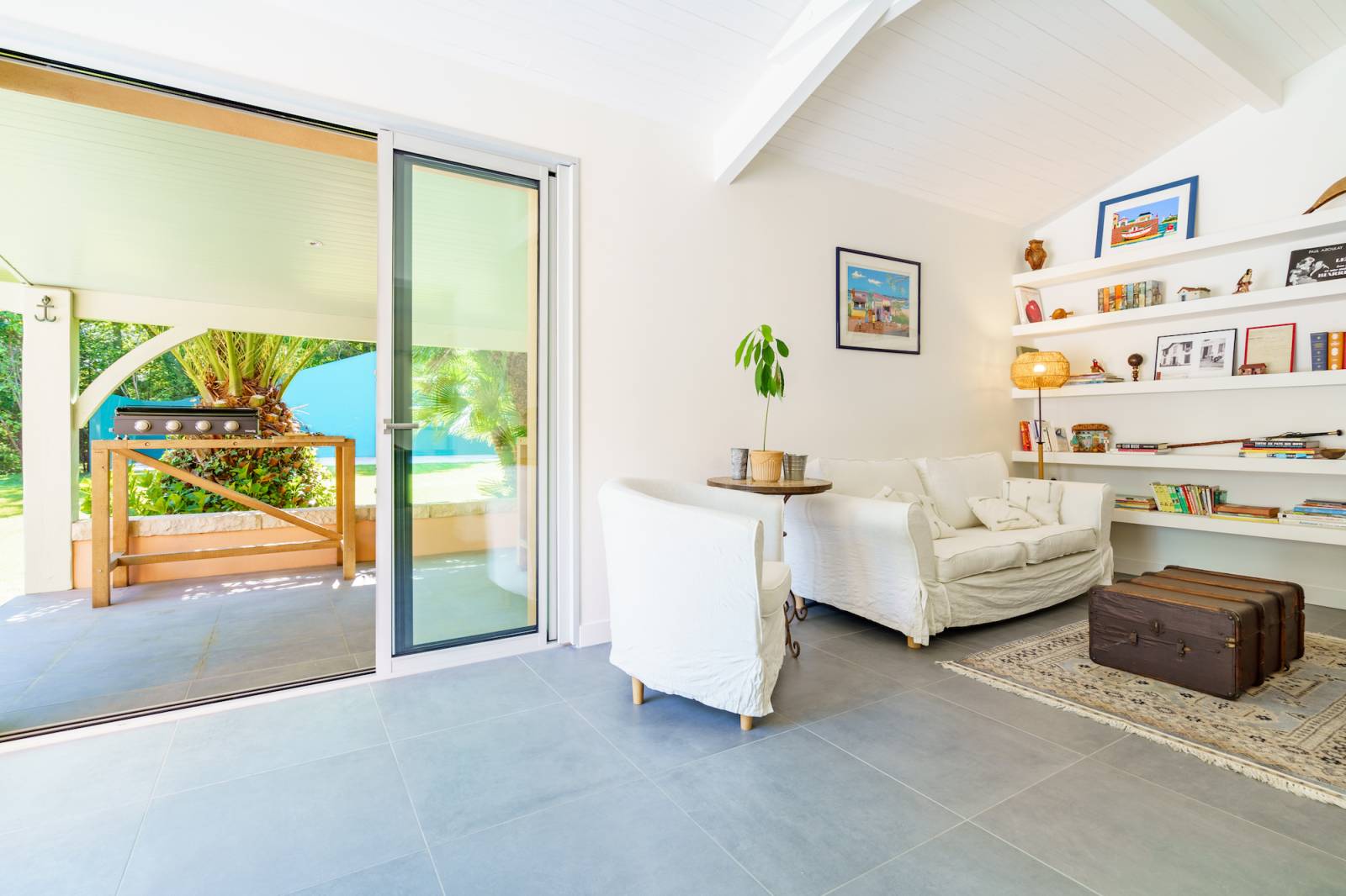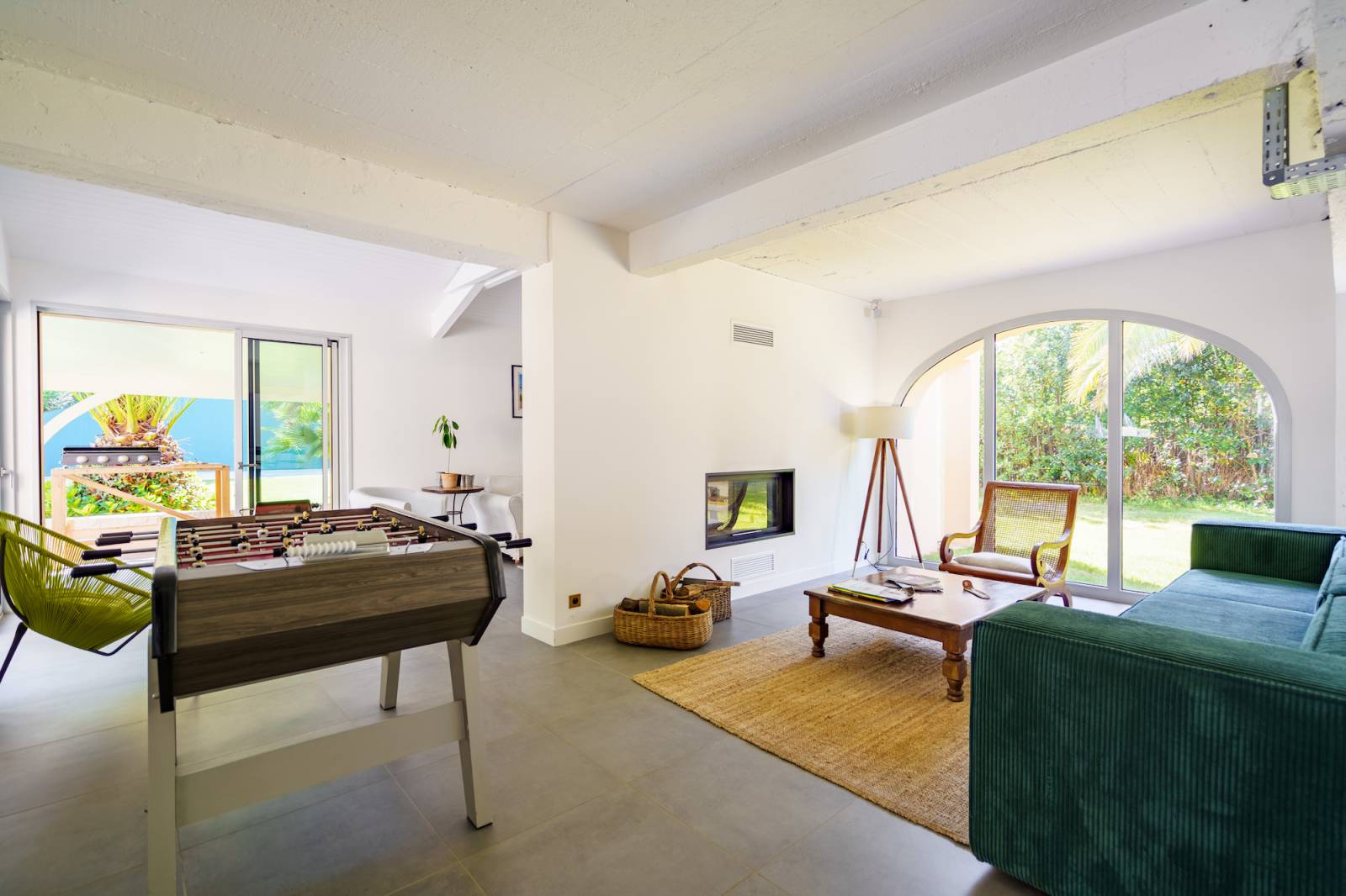 Le séjour lumineux de la maison est idéal pour un shooting esprit surf, avec ses larges baies vitrées laissant entrer la lumière naturelle et offrant une vue imprenable sur le jardin.