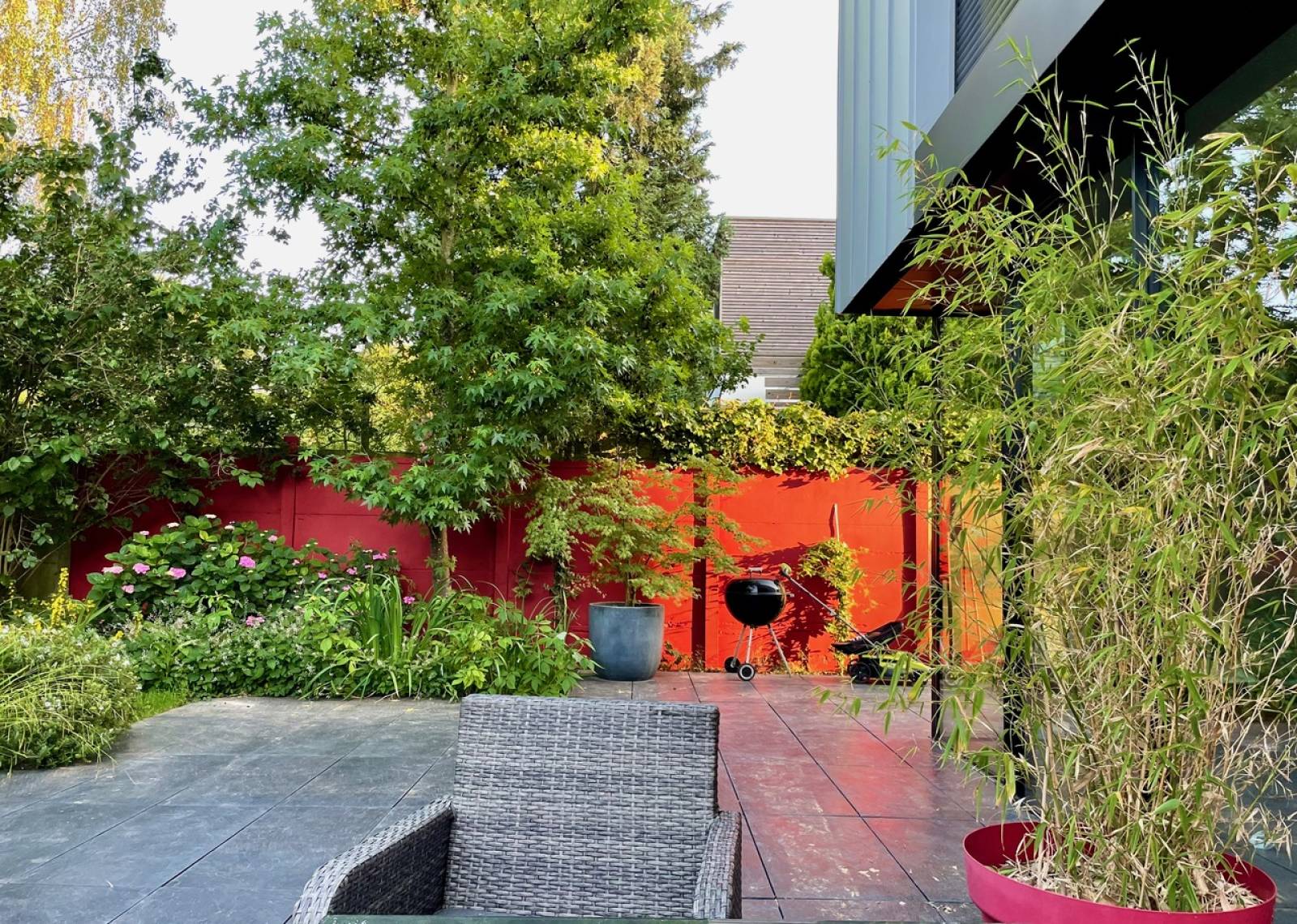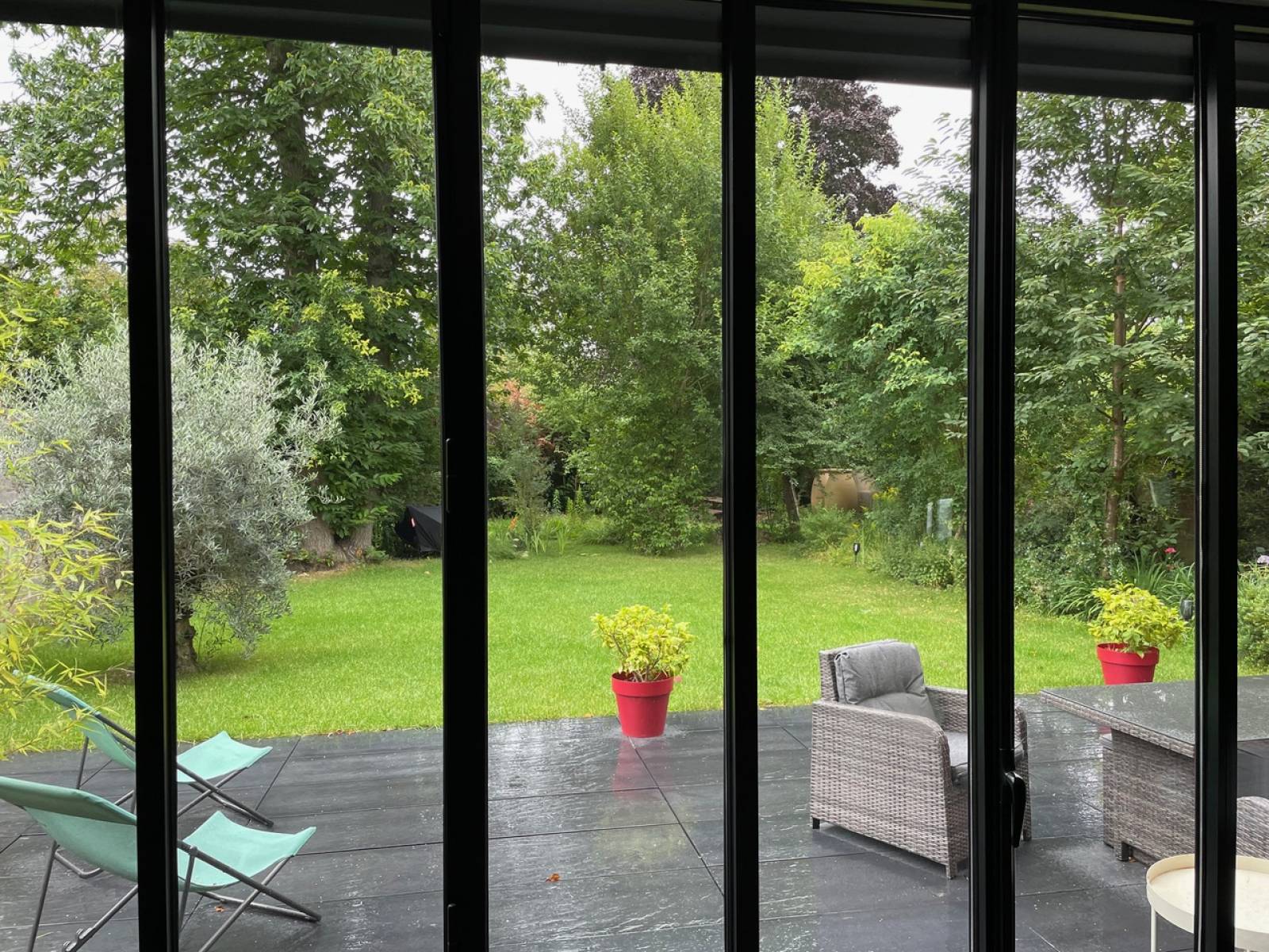Le jardin plat qui entoure la maison représente un véritable atout. Avec ses espaces dégagés et sa verdure soignée, il offre de multiples possibilités pour l'organisation de cocktails en extérieur ou de shooting en plein air.