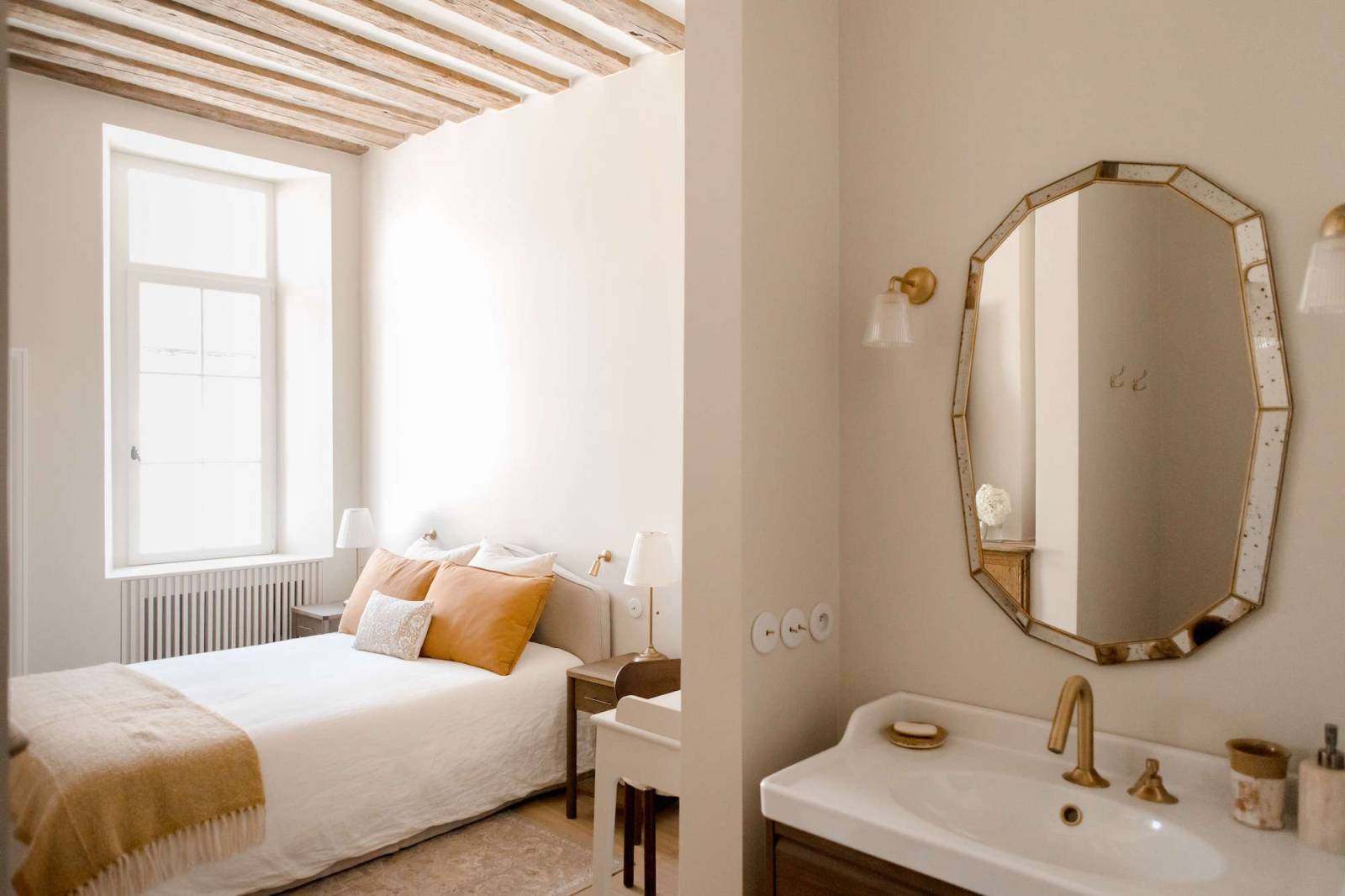 La salle de bain épurée aux lignes simples et matériaux nobles complète l’ensemble, tout comme les jolies chambres cosy qui seront idéales pour un shooting de linge de maison par exemple.