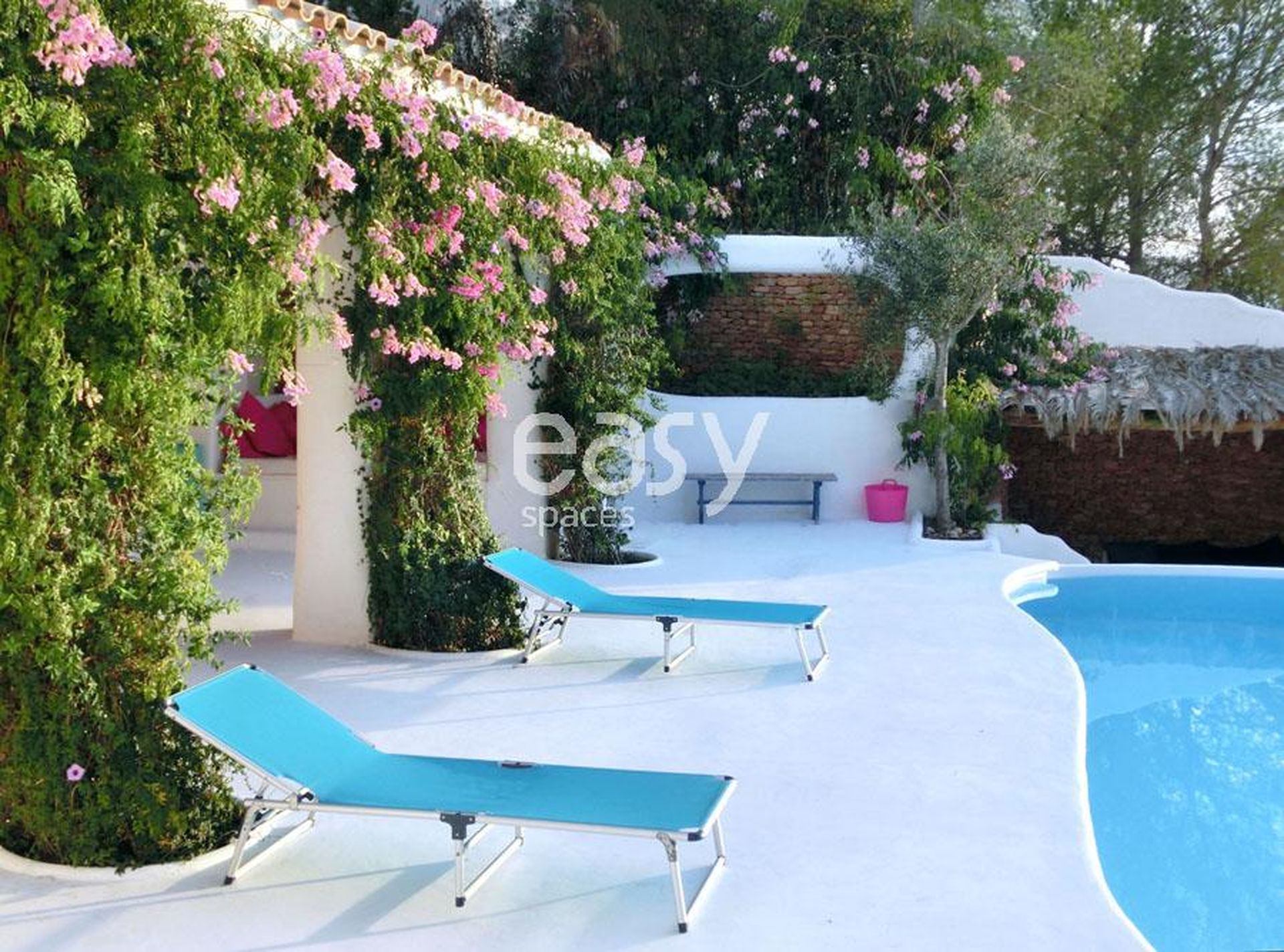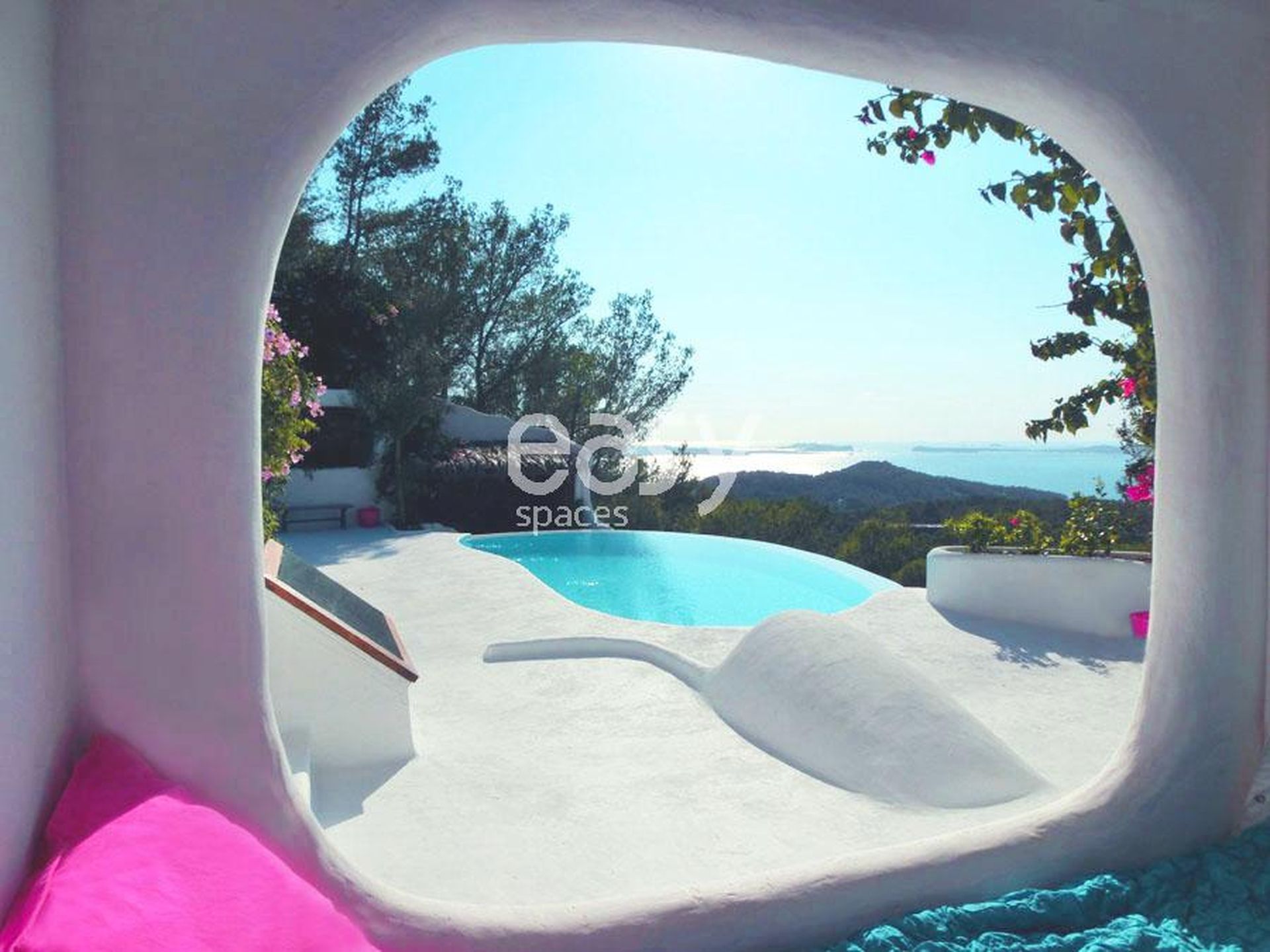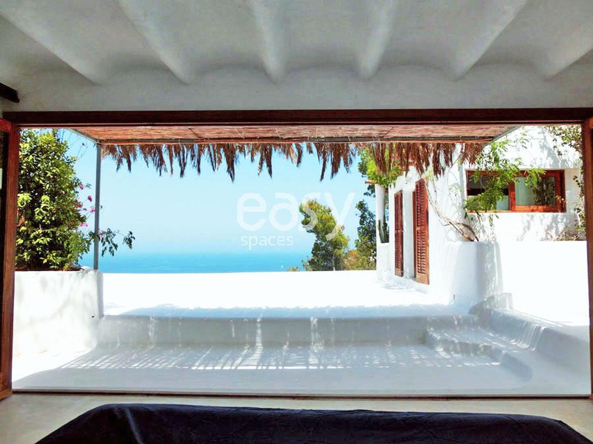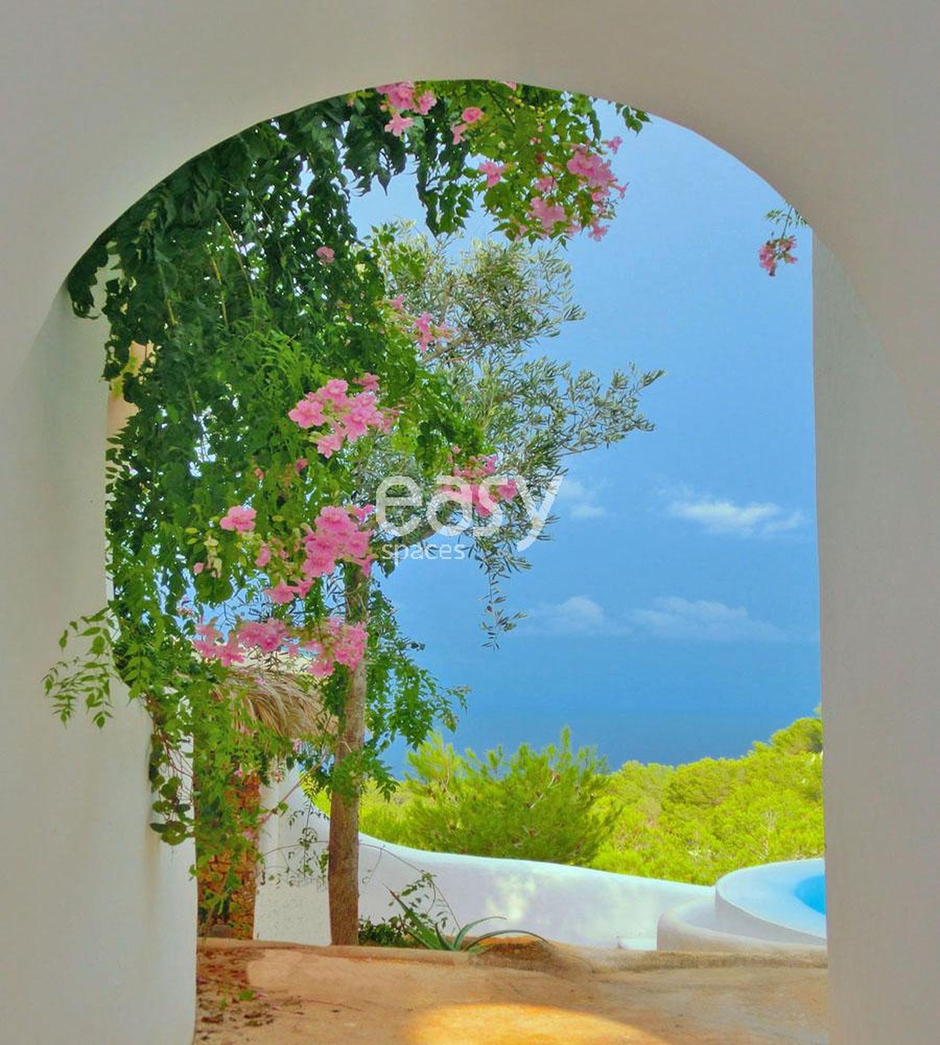 Belle maison atypique vue mer aux murs blancs à louer pour prises de vues et tournages à Ibiza. Ce décor possède une piscine vue mer, un joli jardin fleuris et de très beaux atouts pour une production photode mobilier de jardin par exemple.