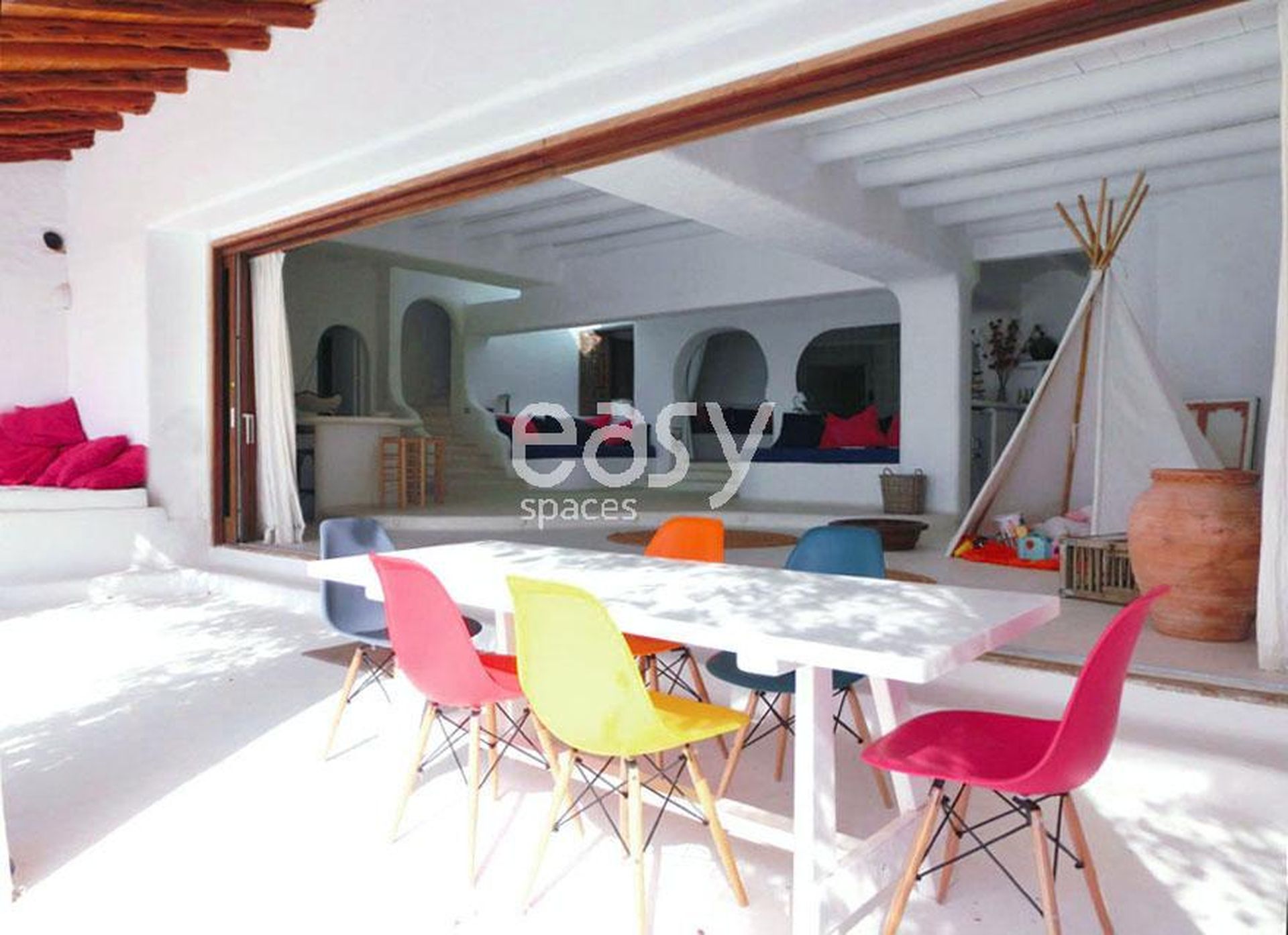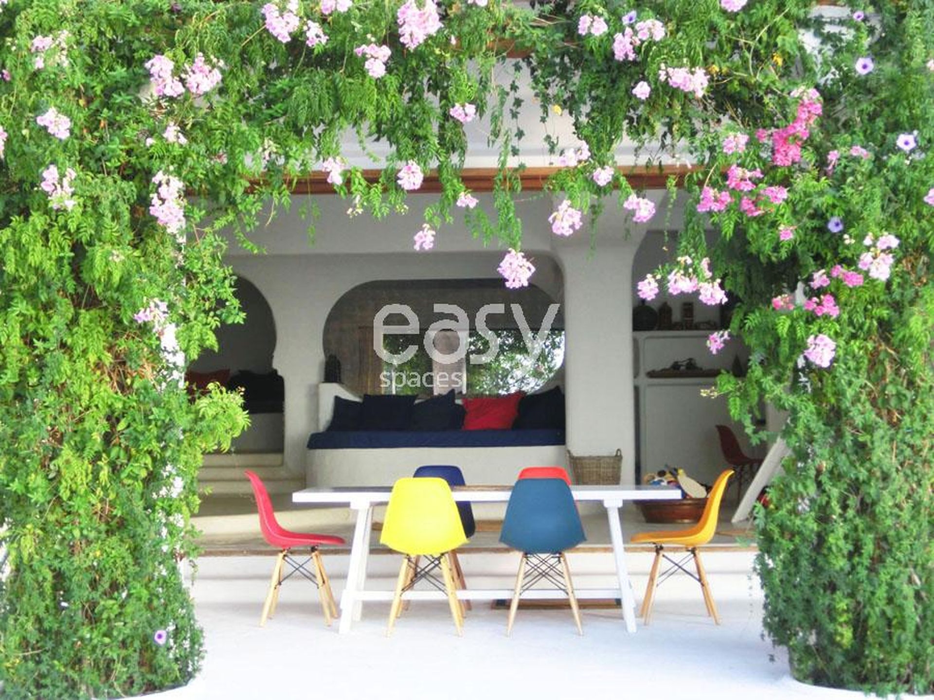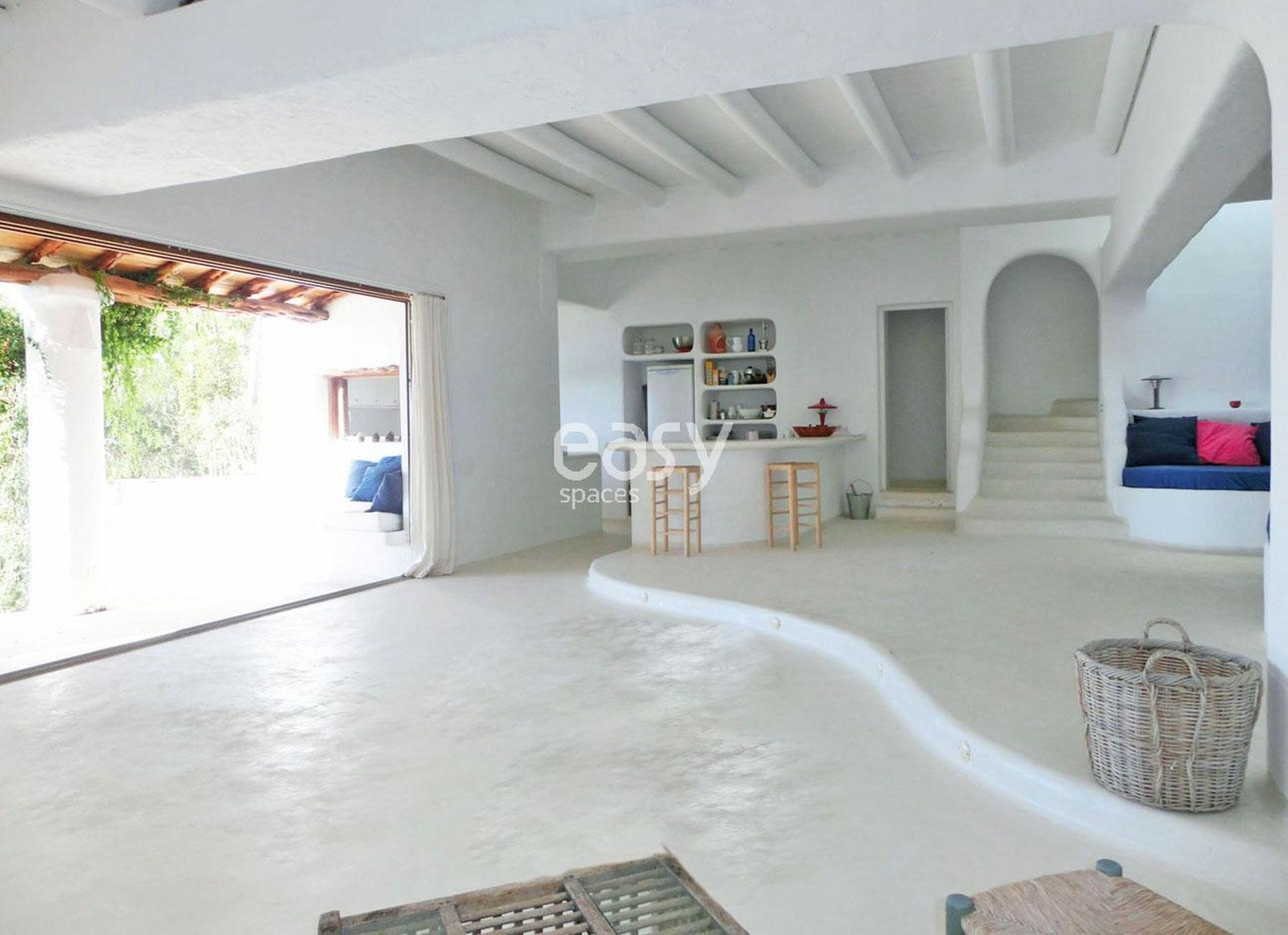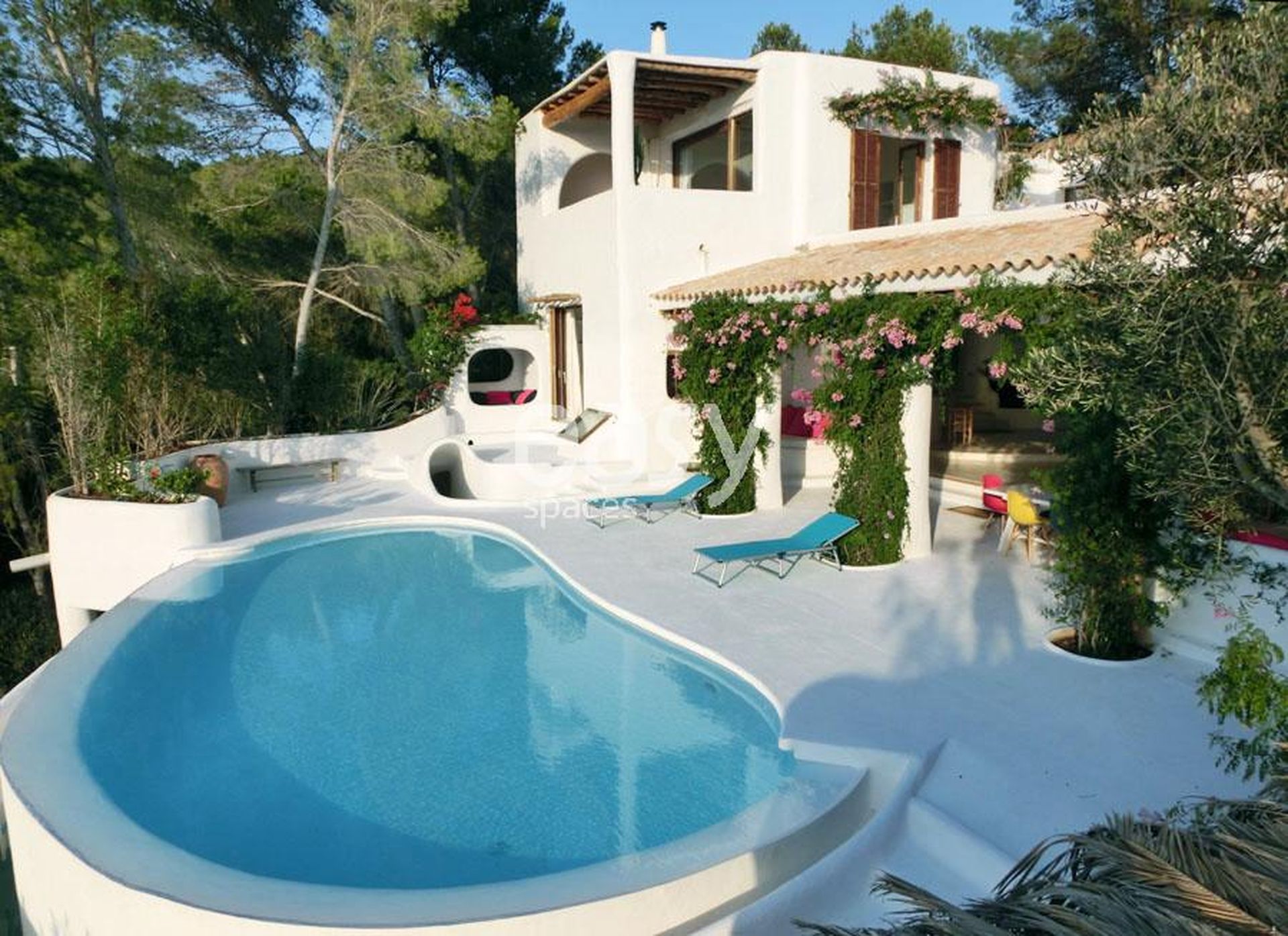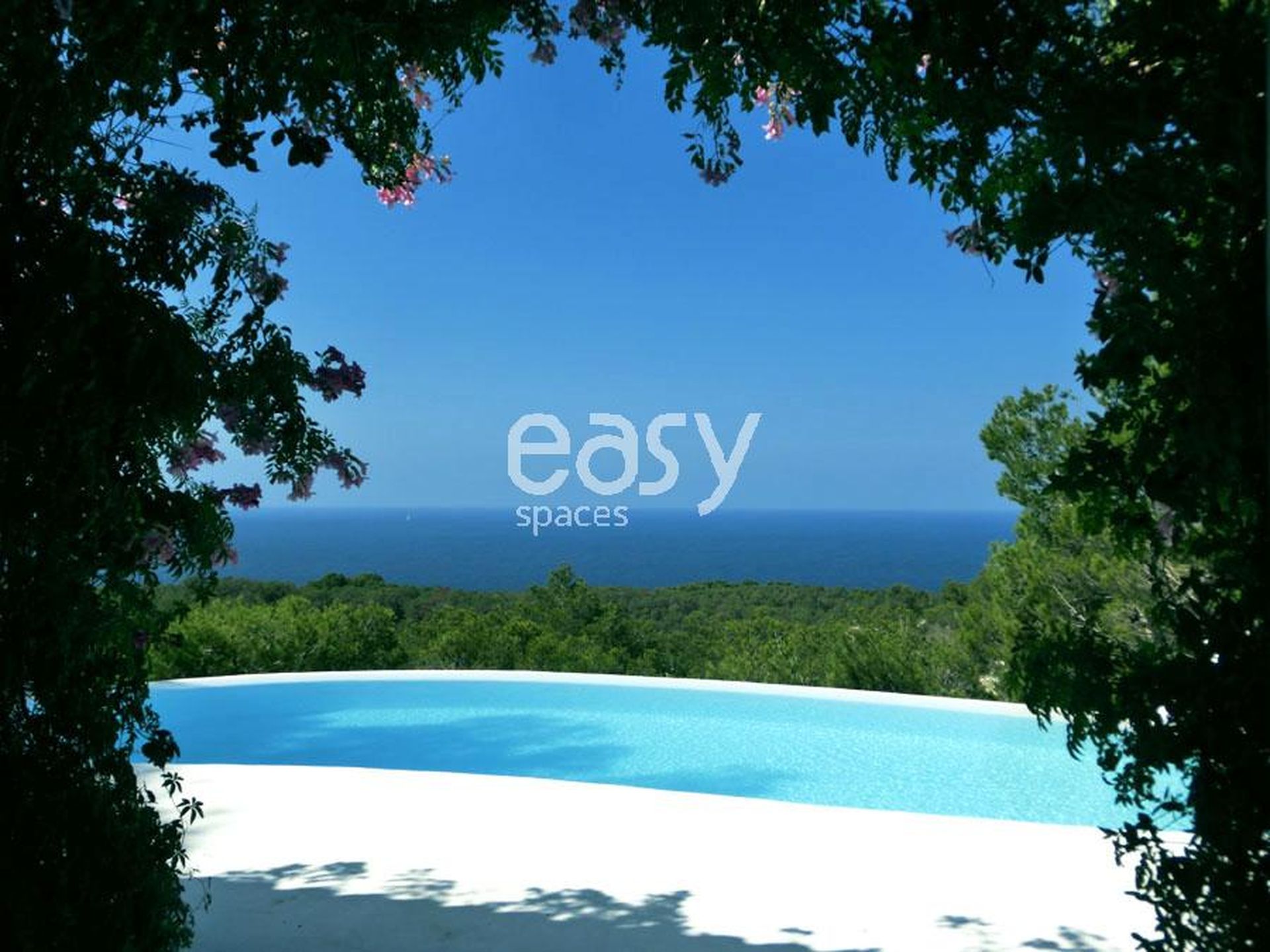 Belle maison atypique vue mer aux murs blancs à louer pour prises de vues et tournages à Ibiza. Ce décor possède une piscine vue mer, un joli jardin fleuris et de très beaux atouts pour une production photode mobilier de jardin par exemple.