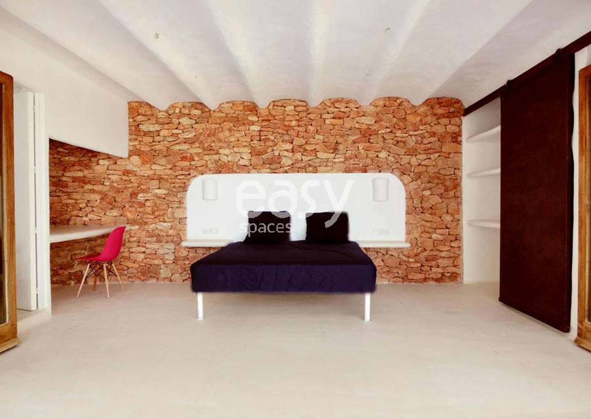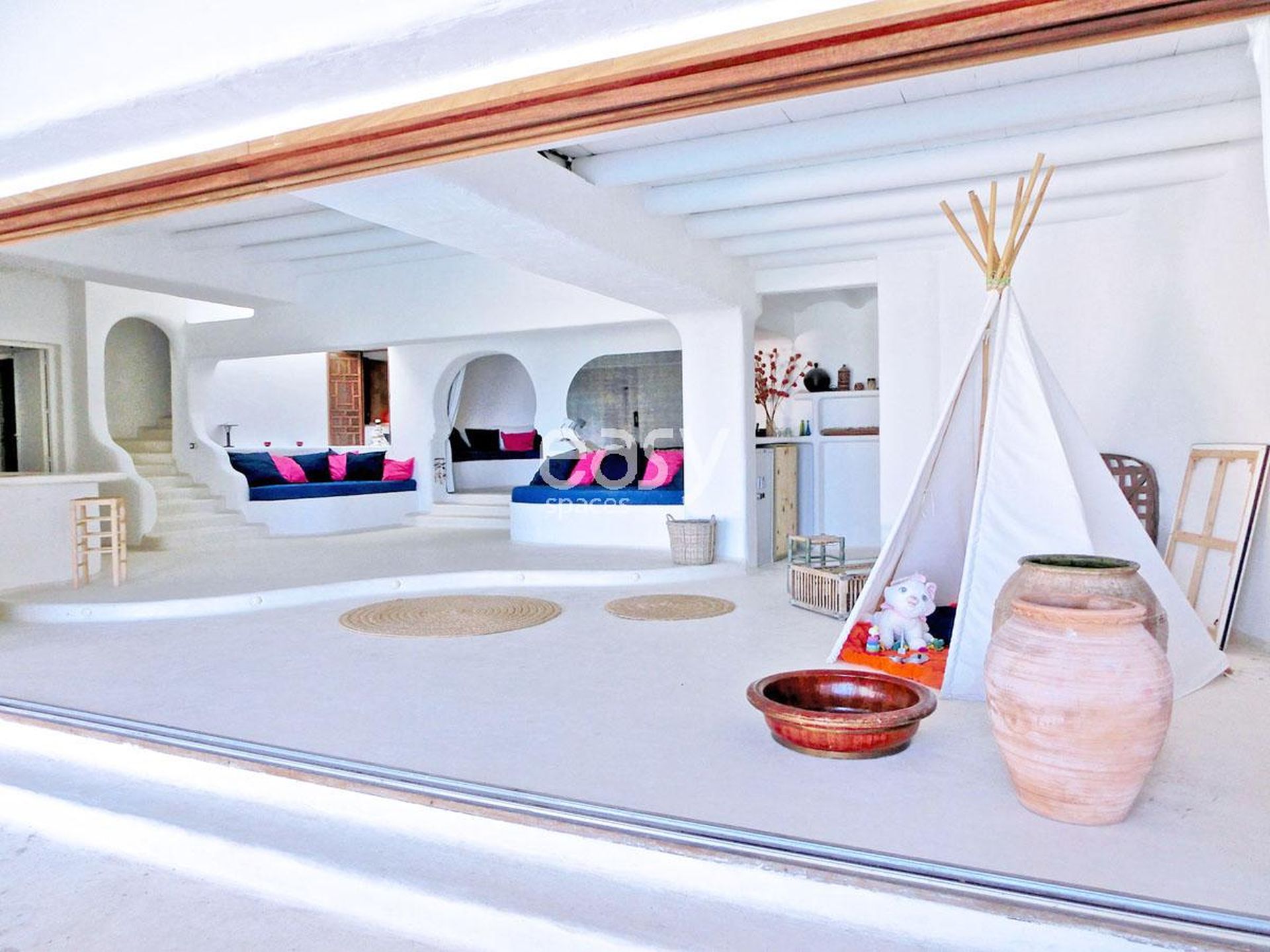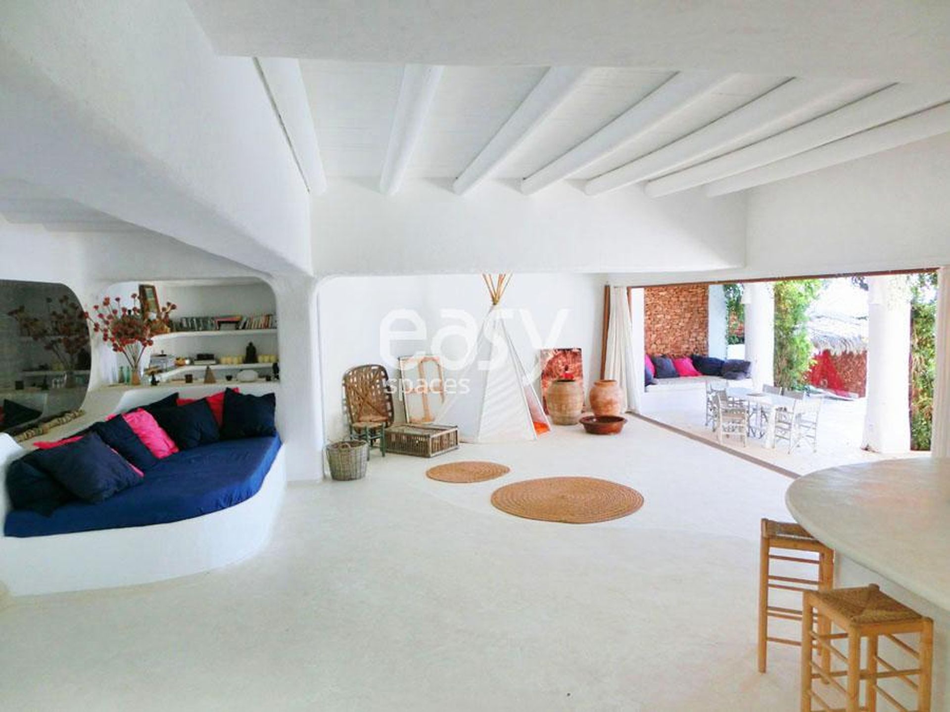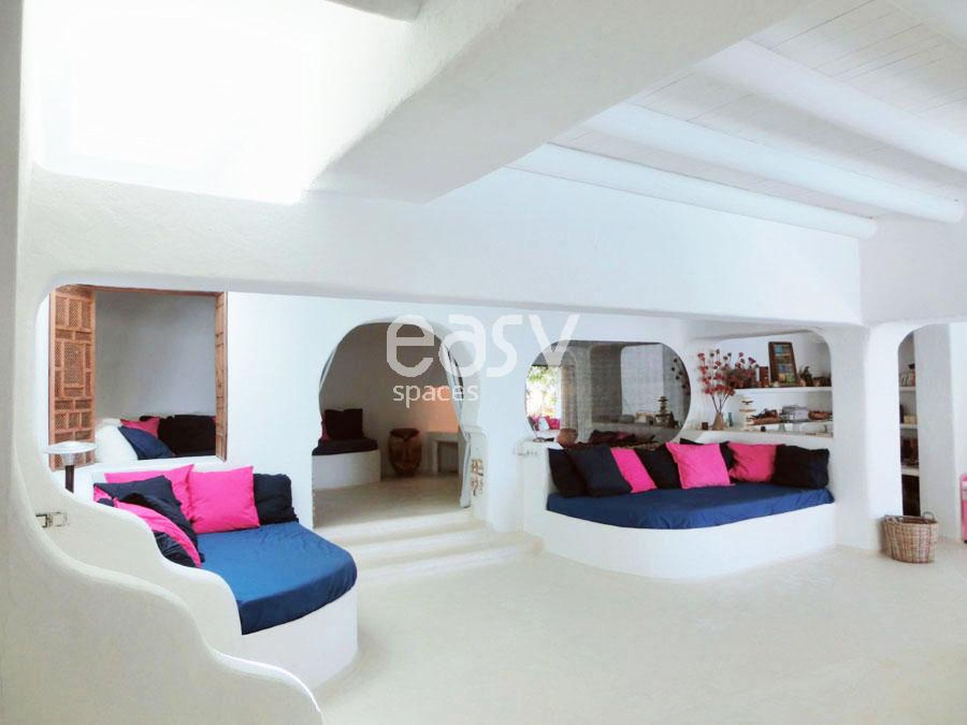 Belle maison atypique vue mer aux murs blancs à louer pour prises de vues et tournages à Ibiza. Ce décor possède une piscine vue mer, un joli jardin fleuris et de très beaux atouts pour une production photode mobilier de jardin par exemple.