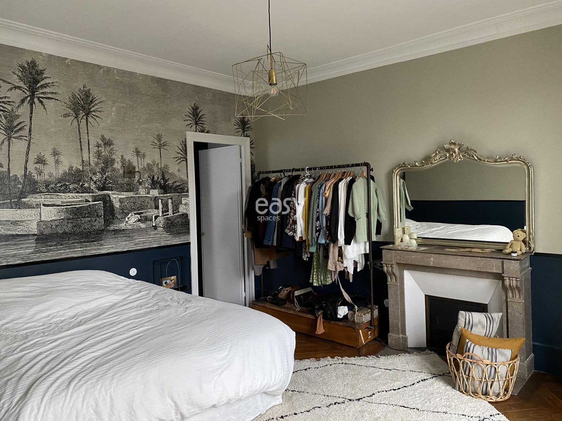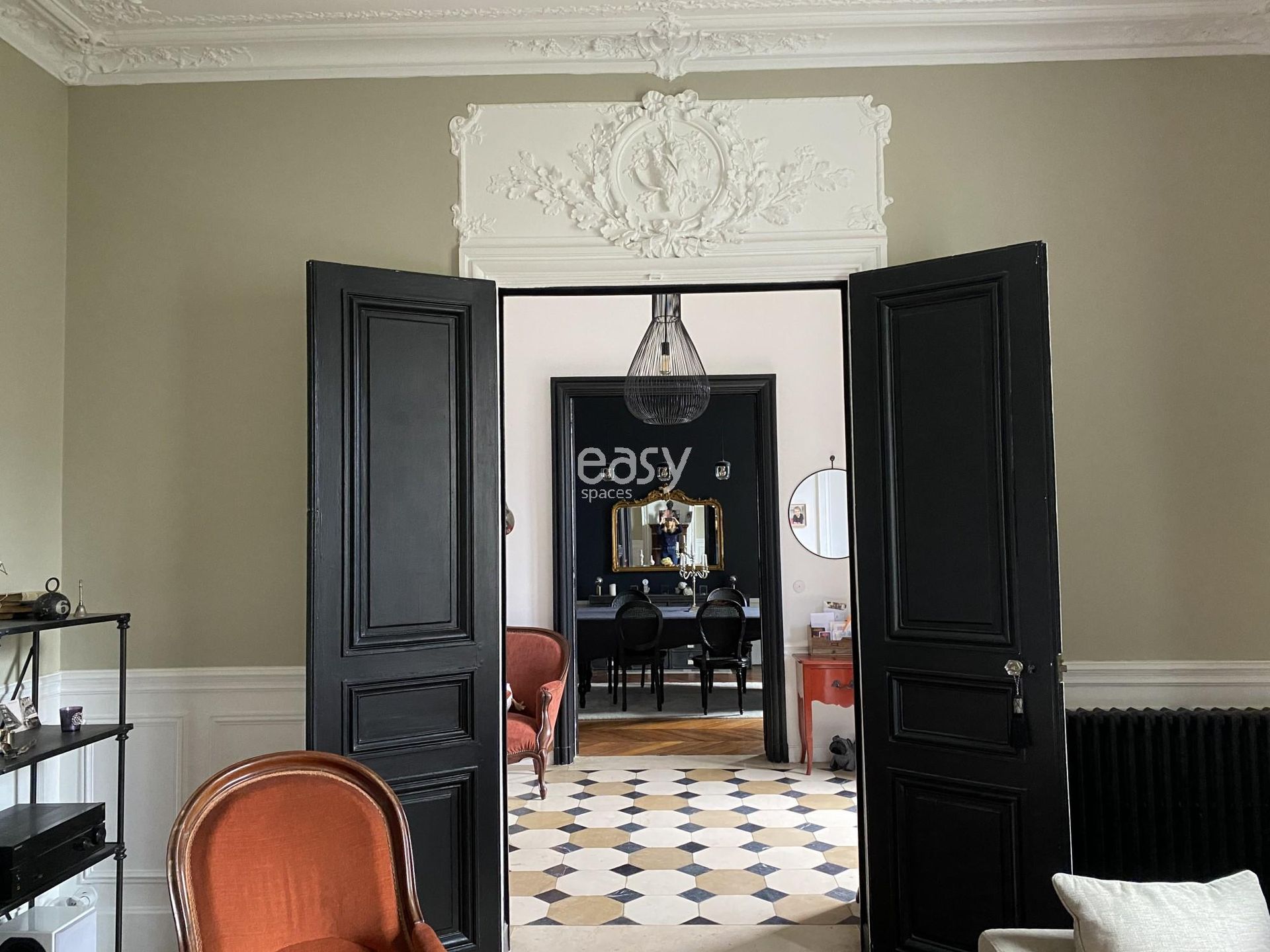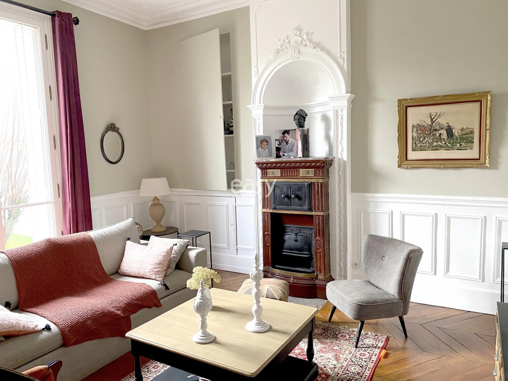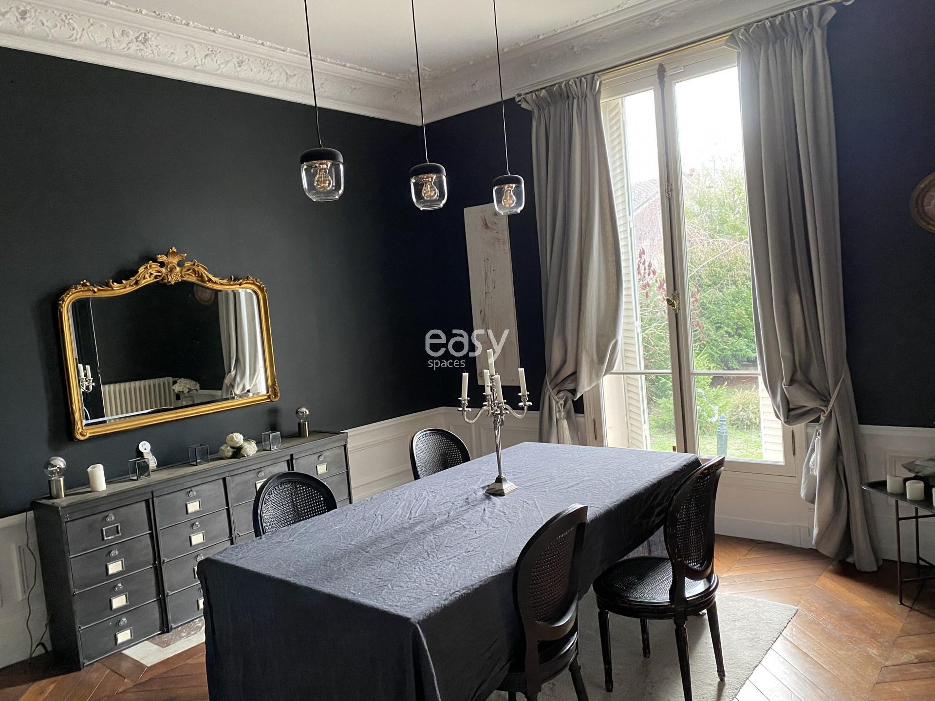 De type villa napoléonienne ce décor bénéficie d'une belle luminosité et de beaux volumes. Sa décoration raffinée, son parquet point de Hongrie, ces moulures et ces cheminées anciennes en font un décor type "parquet et moulures" très prisé pour les productions photos mode ou décoration par exemple.