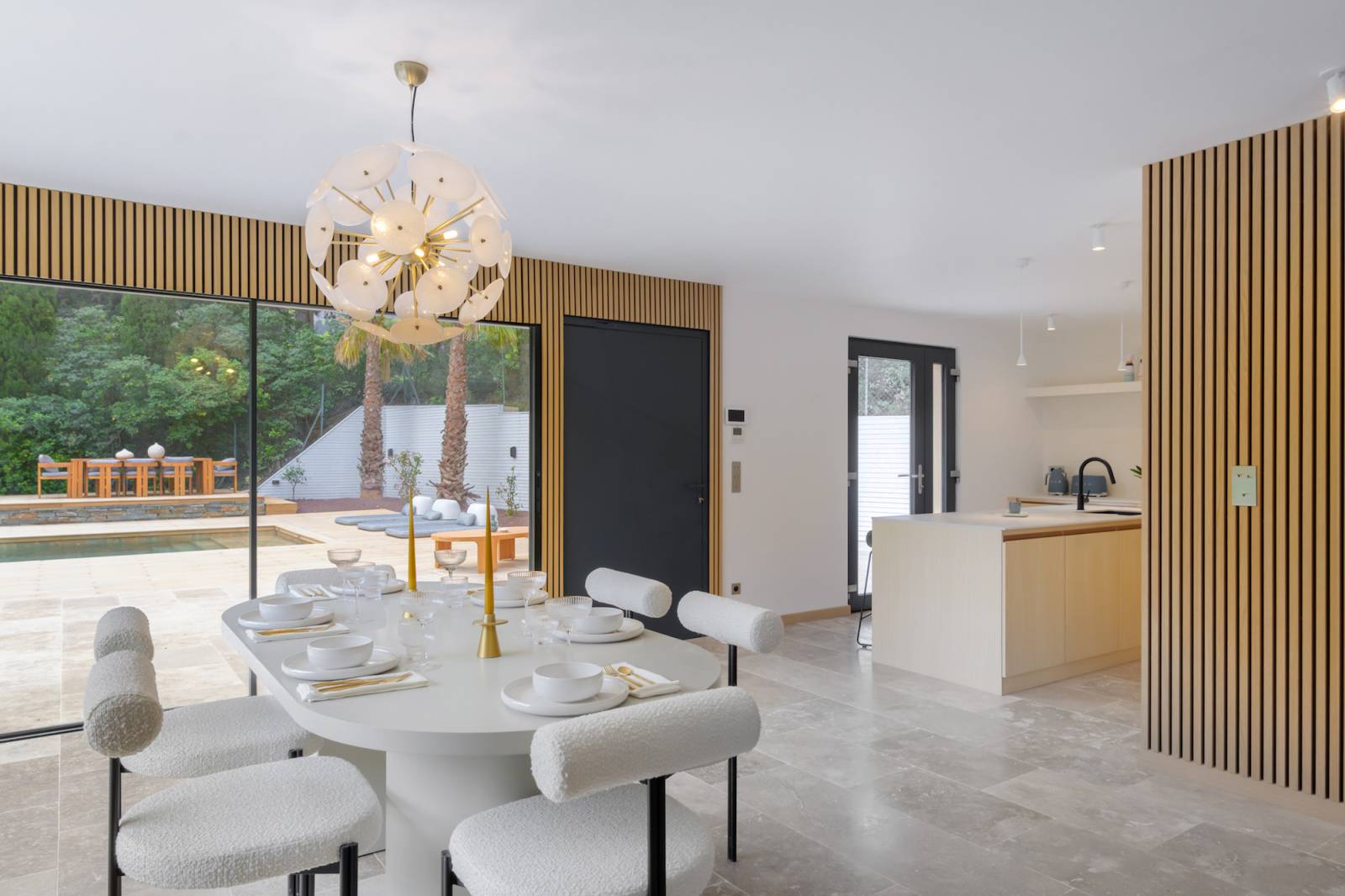 À l’intérieur, le séjour moderne s’ouvre sur une cuisine contemporaine et conviviale, formant un espace de vie lumineux et spacieux. Les grandes baies vitrées offrent une continuité fluide entre intérieur et extérieur, idéale pour capter la lumière naturelle dans vos prises de vues.