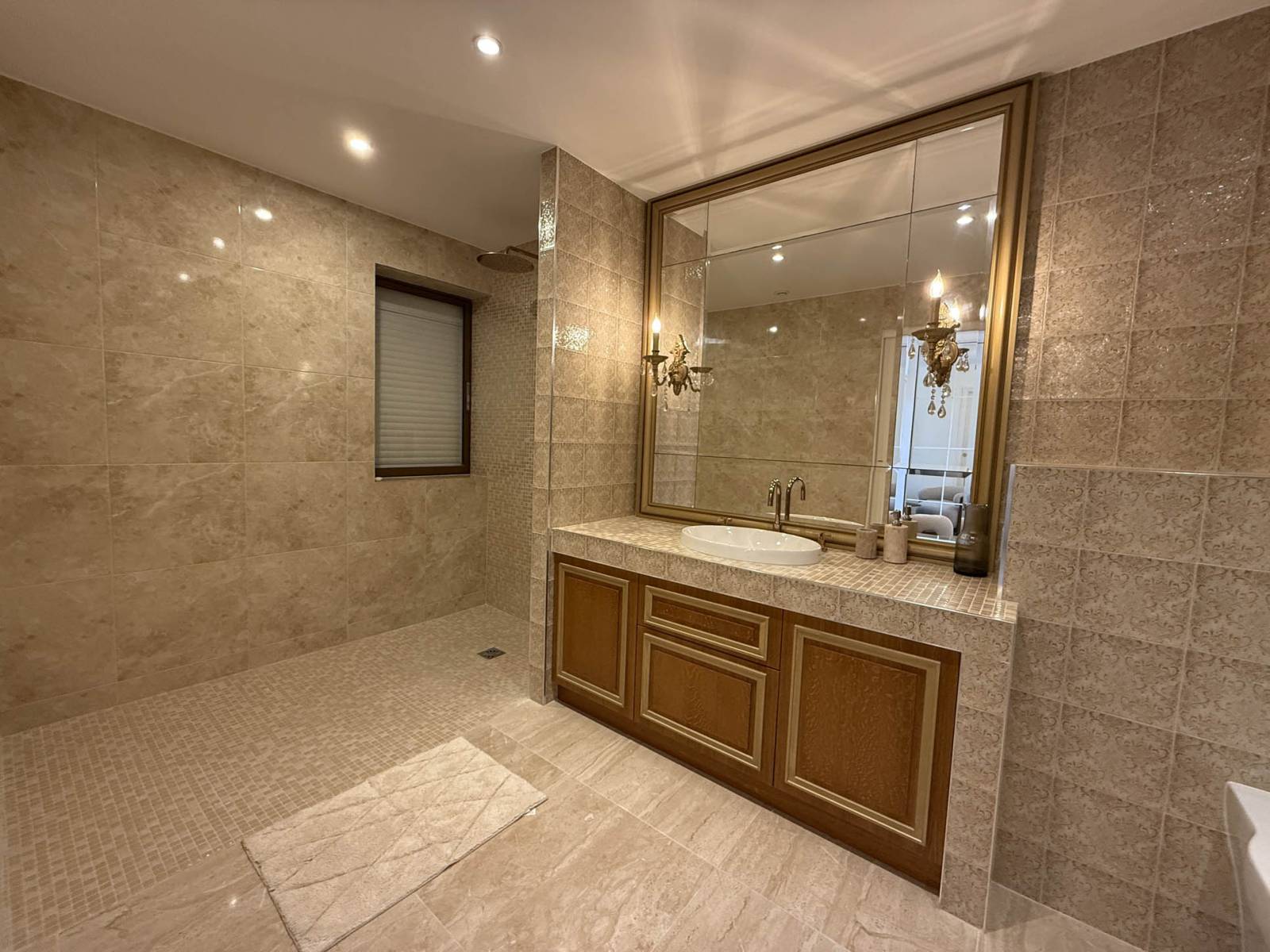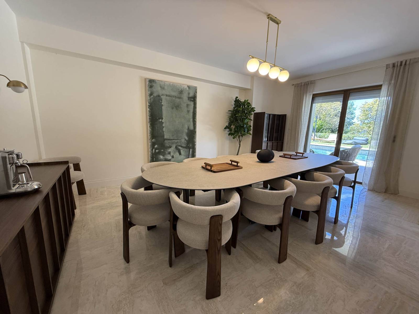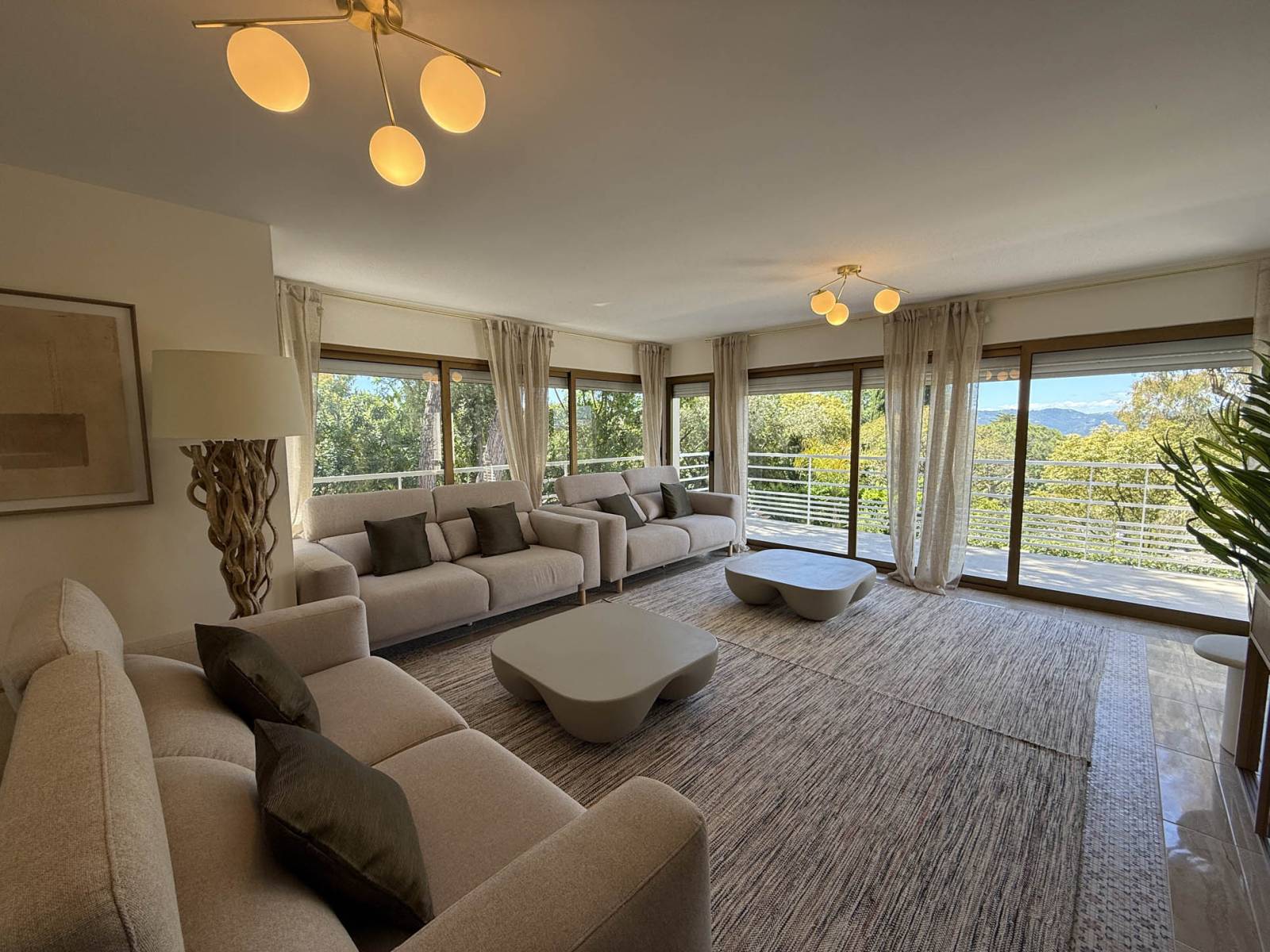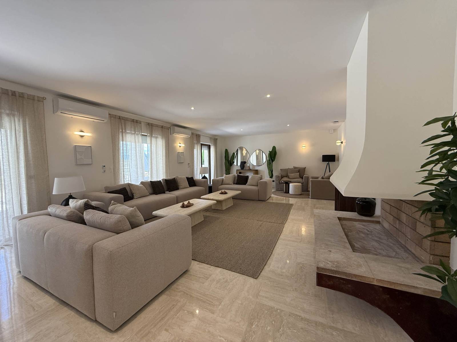 Le séjour principal, au style minimaliste et élégant, s’ouvre généreusement sur l’extérieur grâce à de grandes baies vitrées. La décoration intérieure propose une palette de tons gris contemporains, ponctuée de matériaux nobles et d’un mobilier design soigneusement sélectionné.