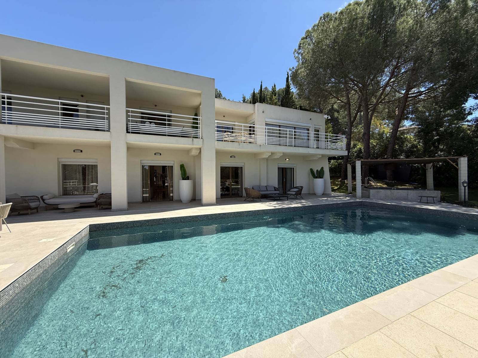 Nichée dans un environnement résidentiel calme et préservé, à seulement quelques minutes de Cannes, cette maison contemporaine au toit plat séduit par son architecture épurée et son atmosphère résolument design.