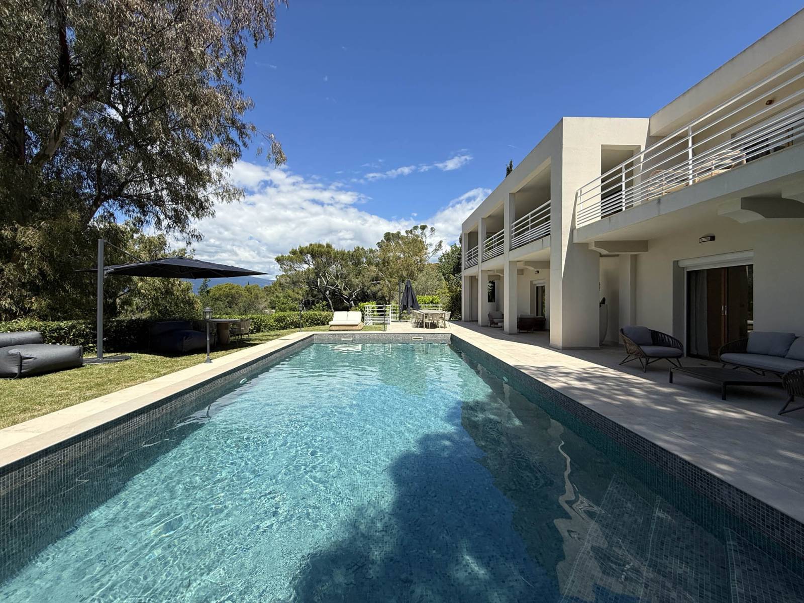 La terrasse surplombe une piscine miroir qui reflète le ciel azuréen, ajoutant une dimension graphique et luxueuse à vos productions.