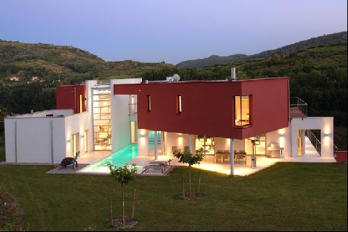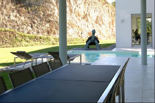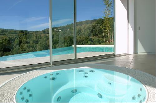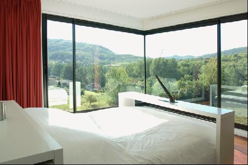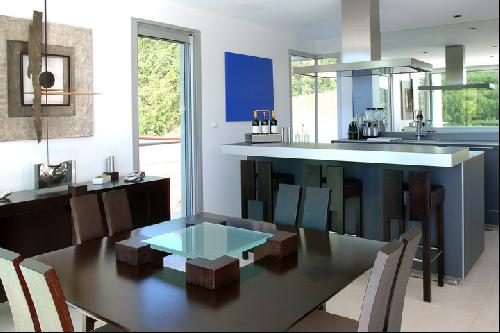 Une belle villa d ' architecte contemporaine avec piscine en location pour les shootings photos dans la région de Lyon. Beaux volumes, vues dégagées. Des lieux de prises de vues pleins de lumières construits autour d ' un piscine d ' exception. Décoration très moderne, jacuzzi, multiples terrasses.