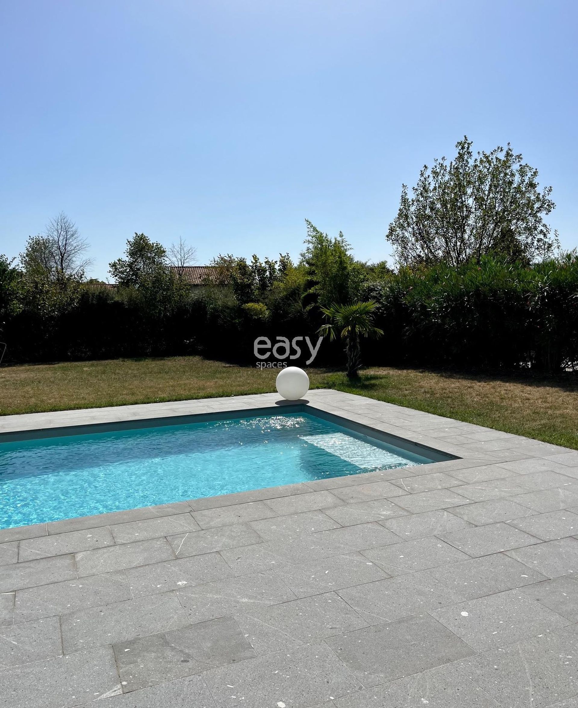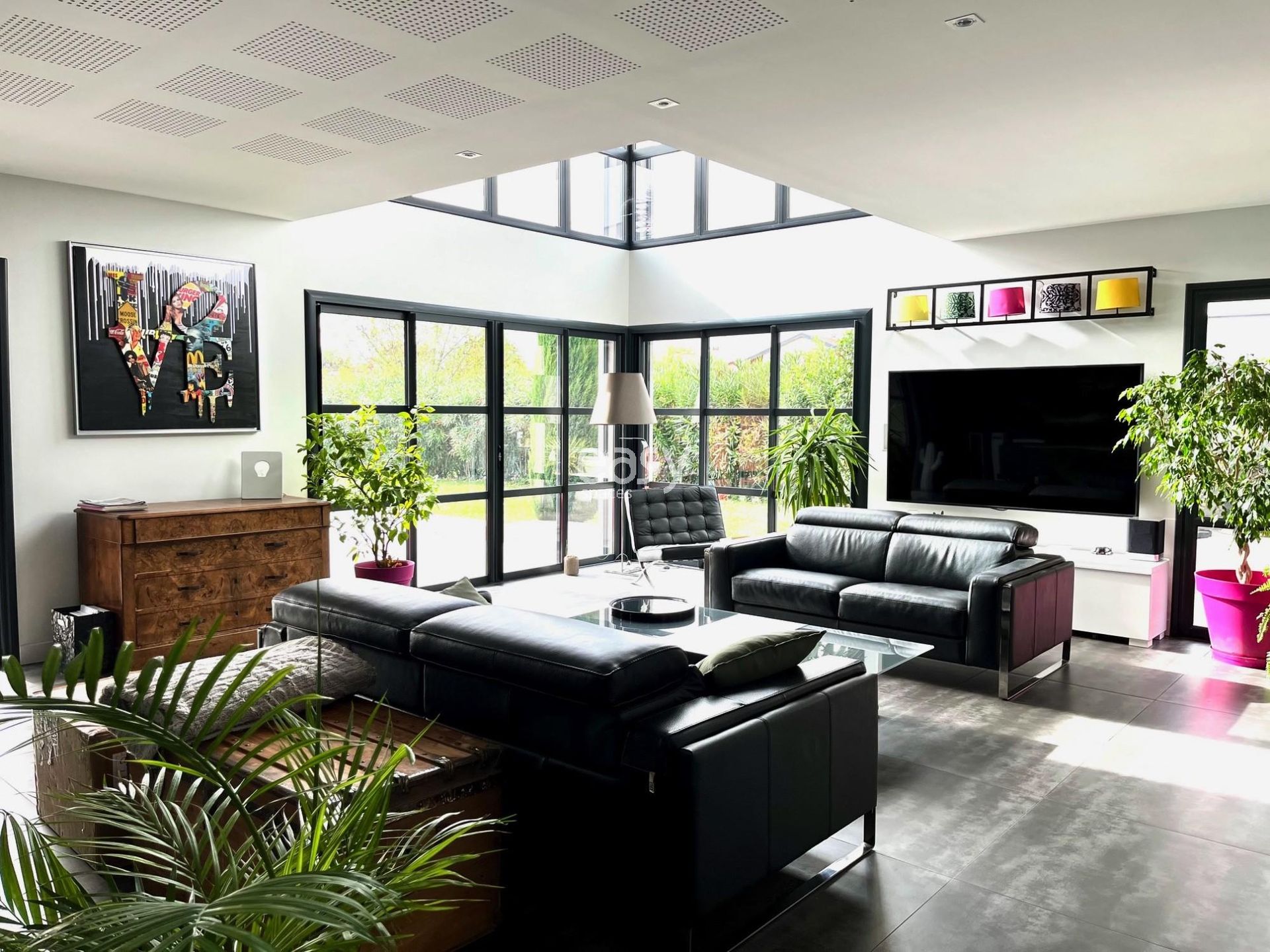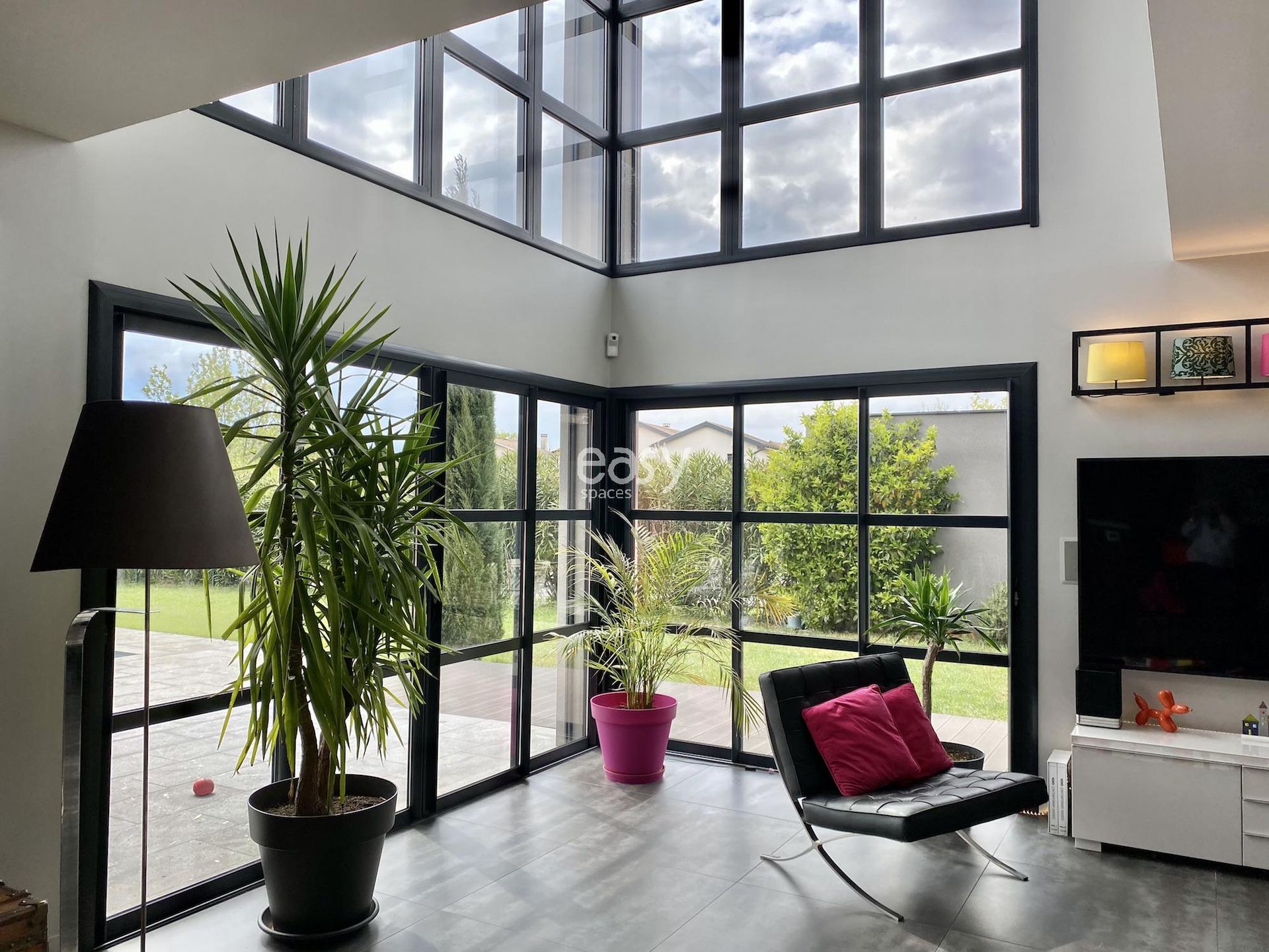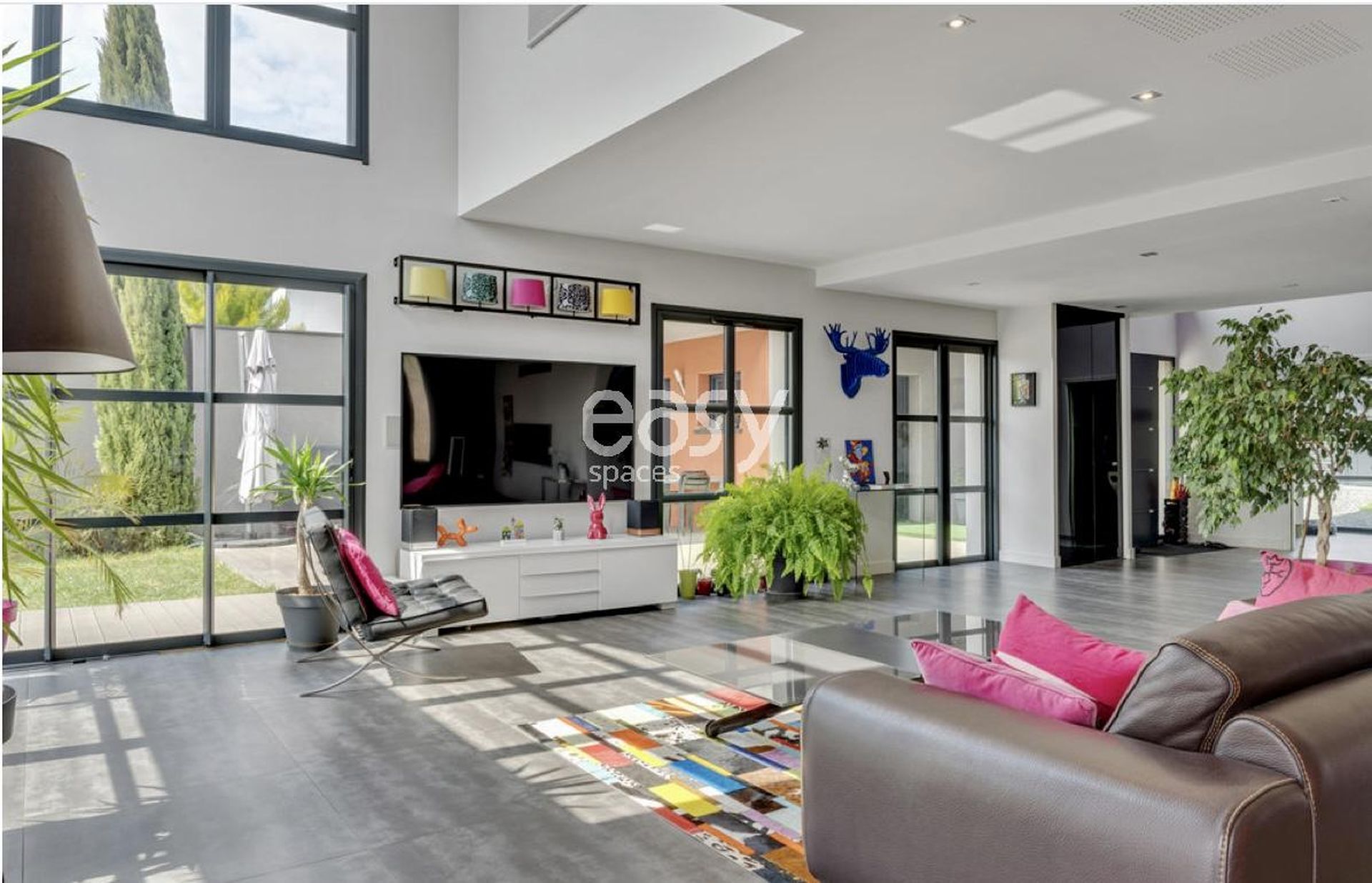 Bénéficiant d'un grand séjour lumineux avec de beaux volumes et d'une décoration colorée et moderne, ce lieu sera idéal pour un shooting photo déco et son jardin plat avec piscine pour un shooting de mobilier de jardin par exemple.
