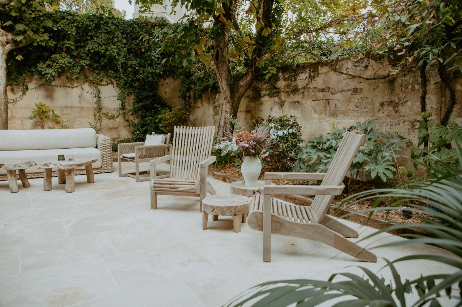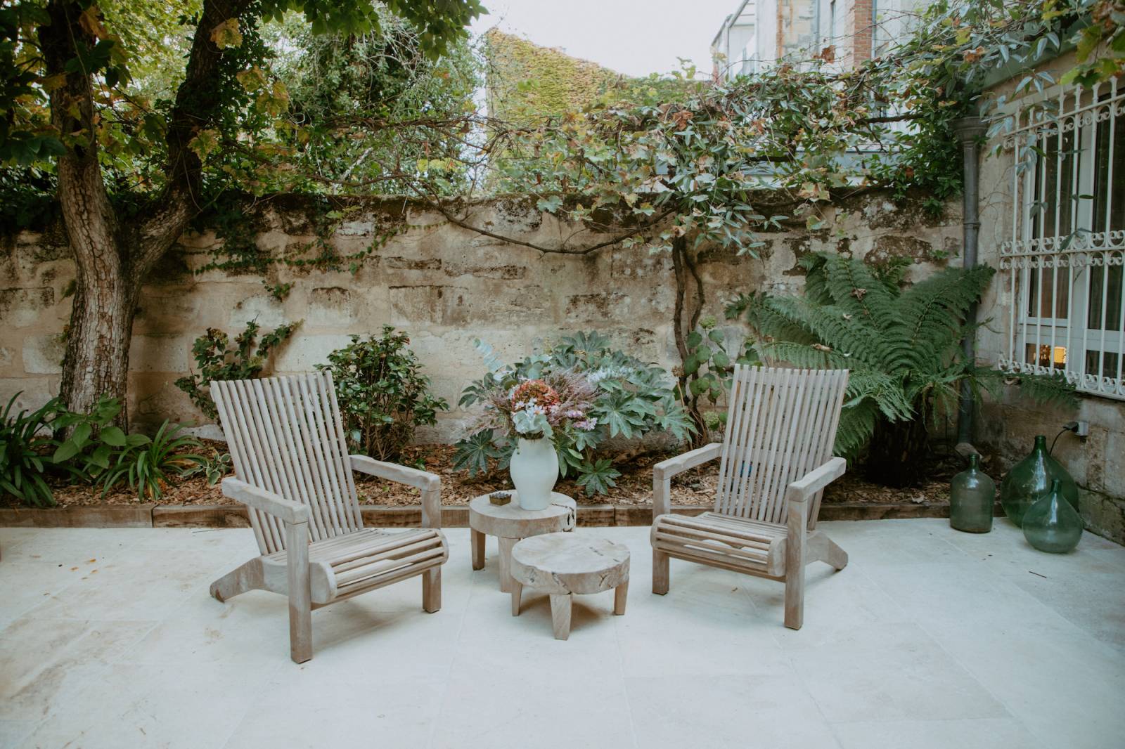 Pour les beaux jours la terrasse aménagée avec mobilier de jardin en bois flotté vous permettra d'organiser des pauses relaxantes ou des moments de convivialité en extérieur. Épurée et élégante, cette terrasse offre un bel écrin intimiste en plein cœur de la ville.