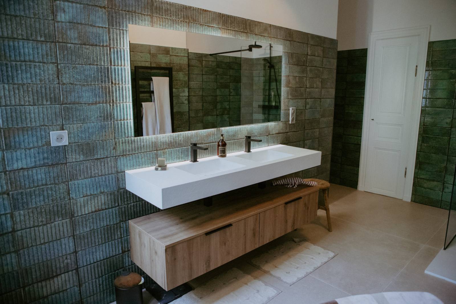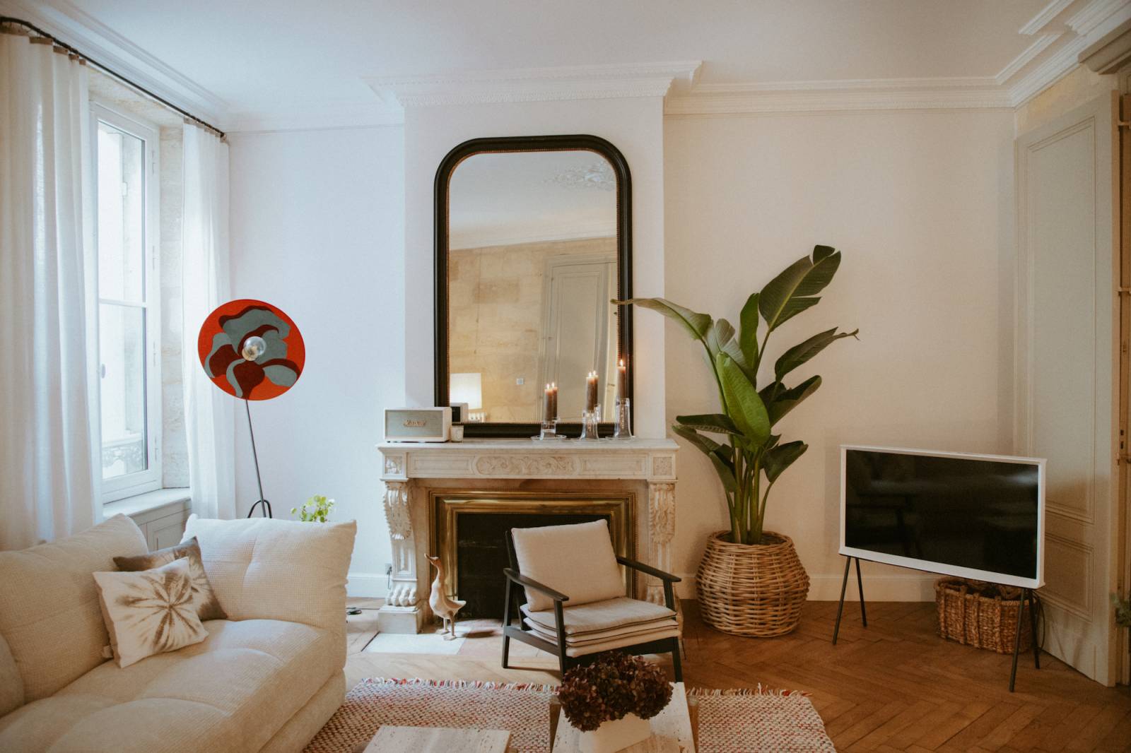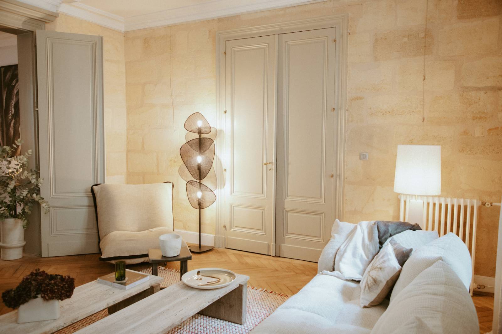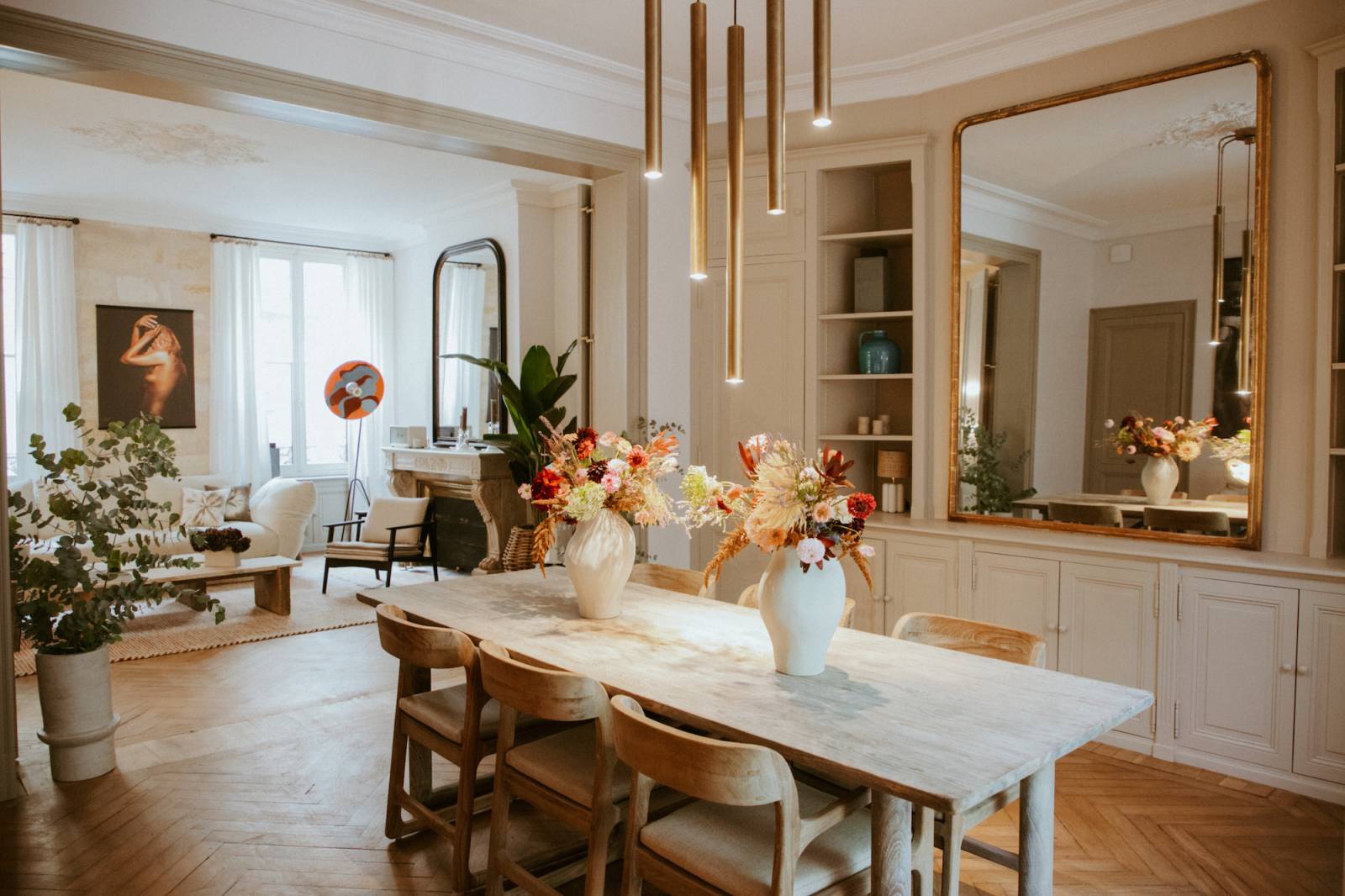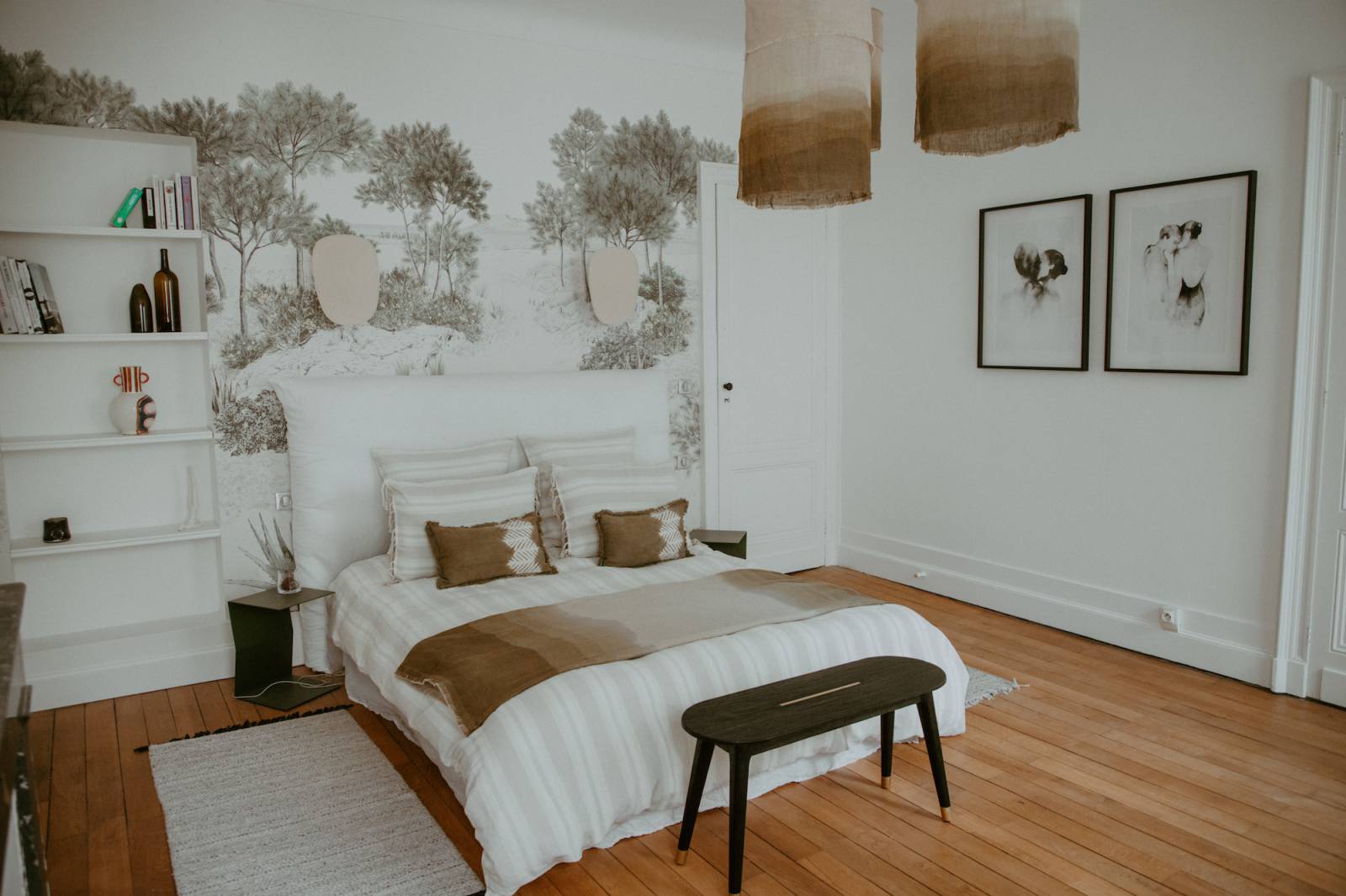 La décoration a été soigneusement choisie dans des tons camel, lin, doré, laiton et ocre, mettant en valeur des matières naturelles et chaleureuses.