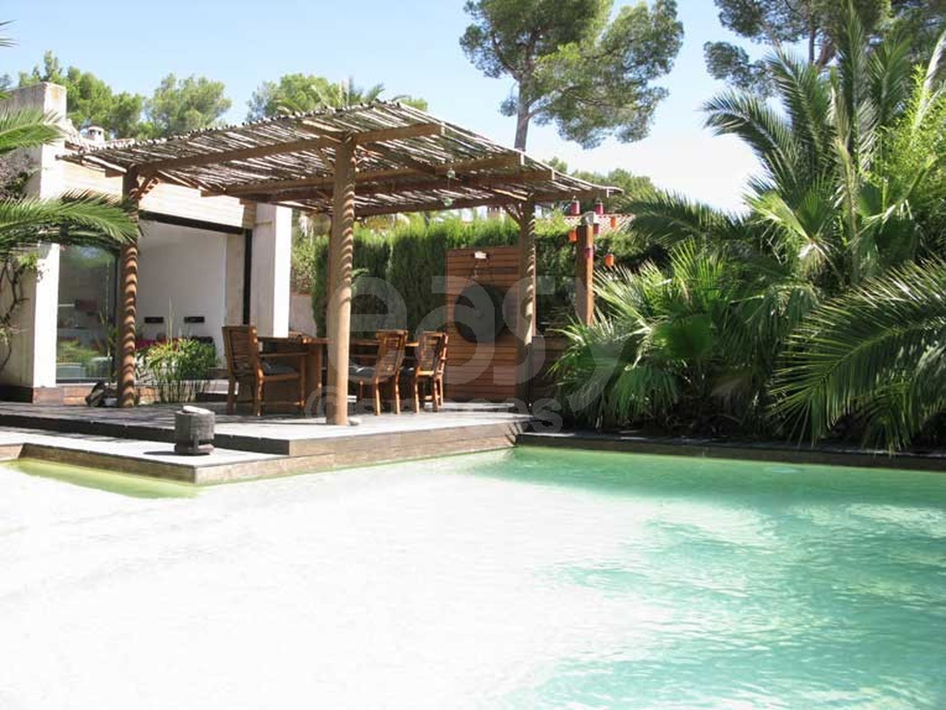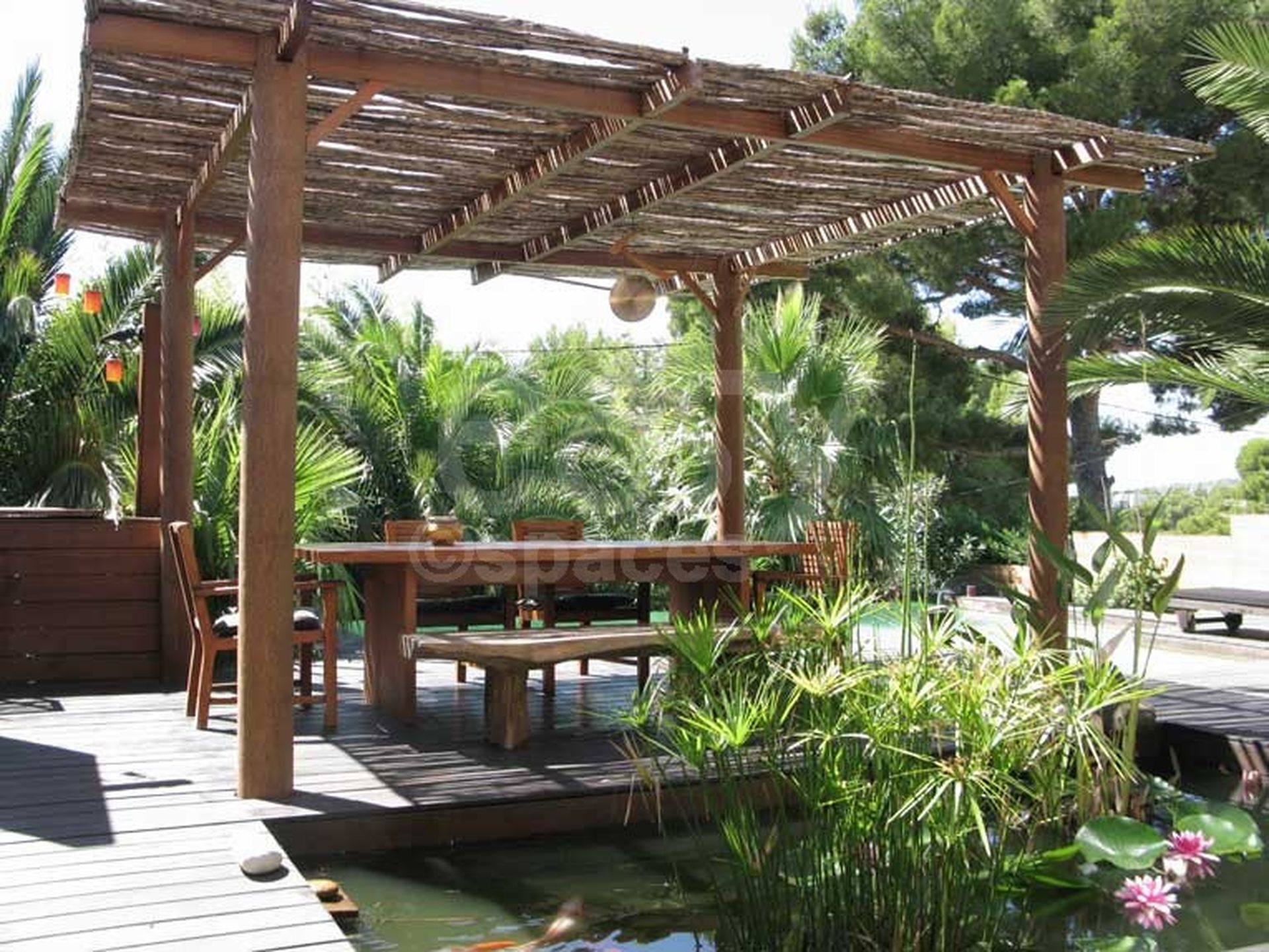 Entourée de jardins luxuriants, cette villa est dotée de terrasses en bois de style teck qui prolongent harmonieusement l'intérieur vers l'extérieur, invitant à la détente et à la contemplation. La piscine, véritable oasis au sein de la propriété, ajoute une note de fraîcheur et d'évasion.