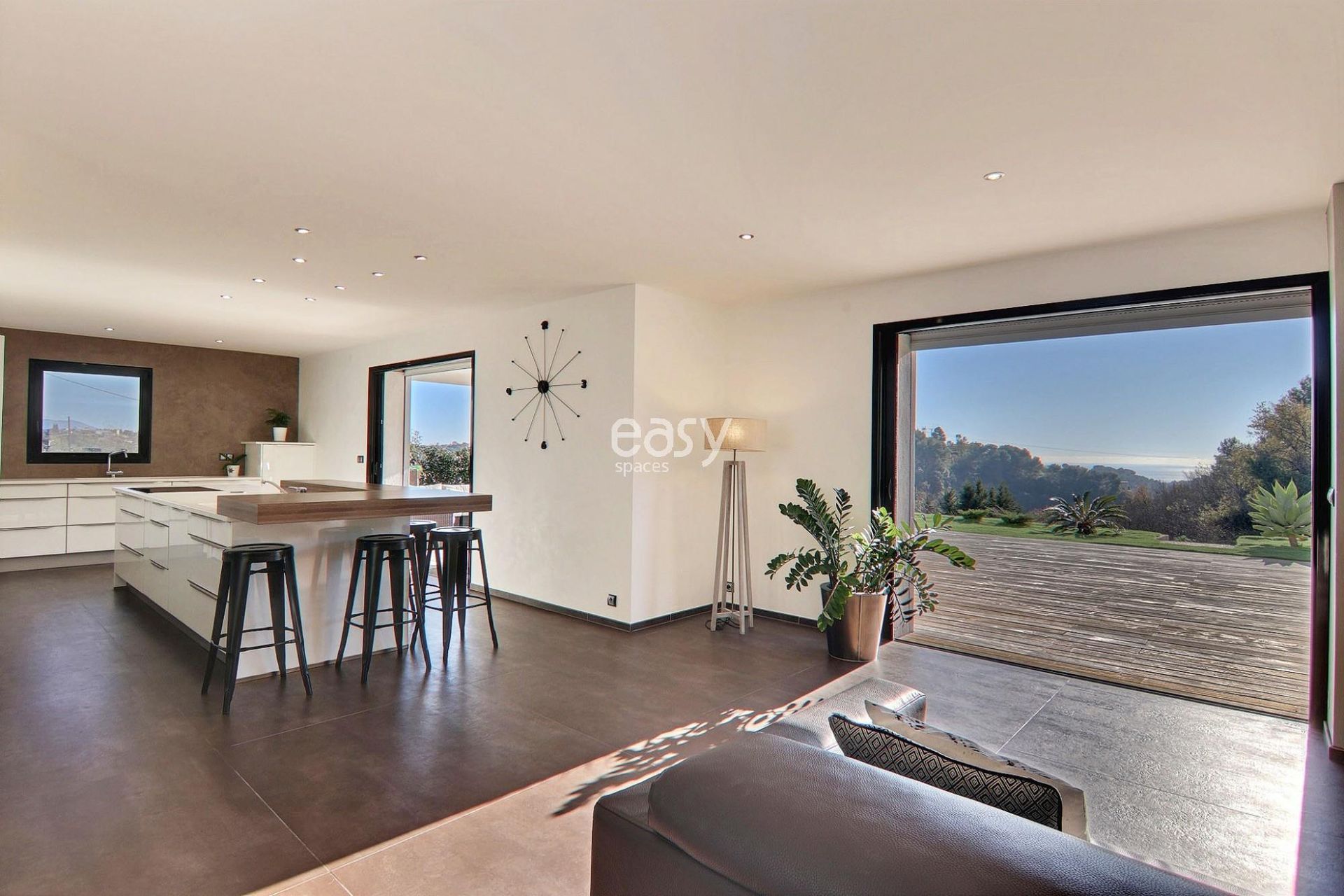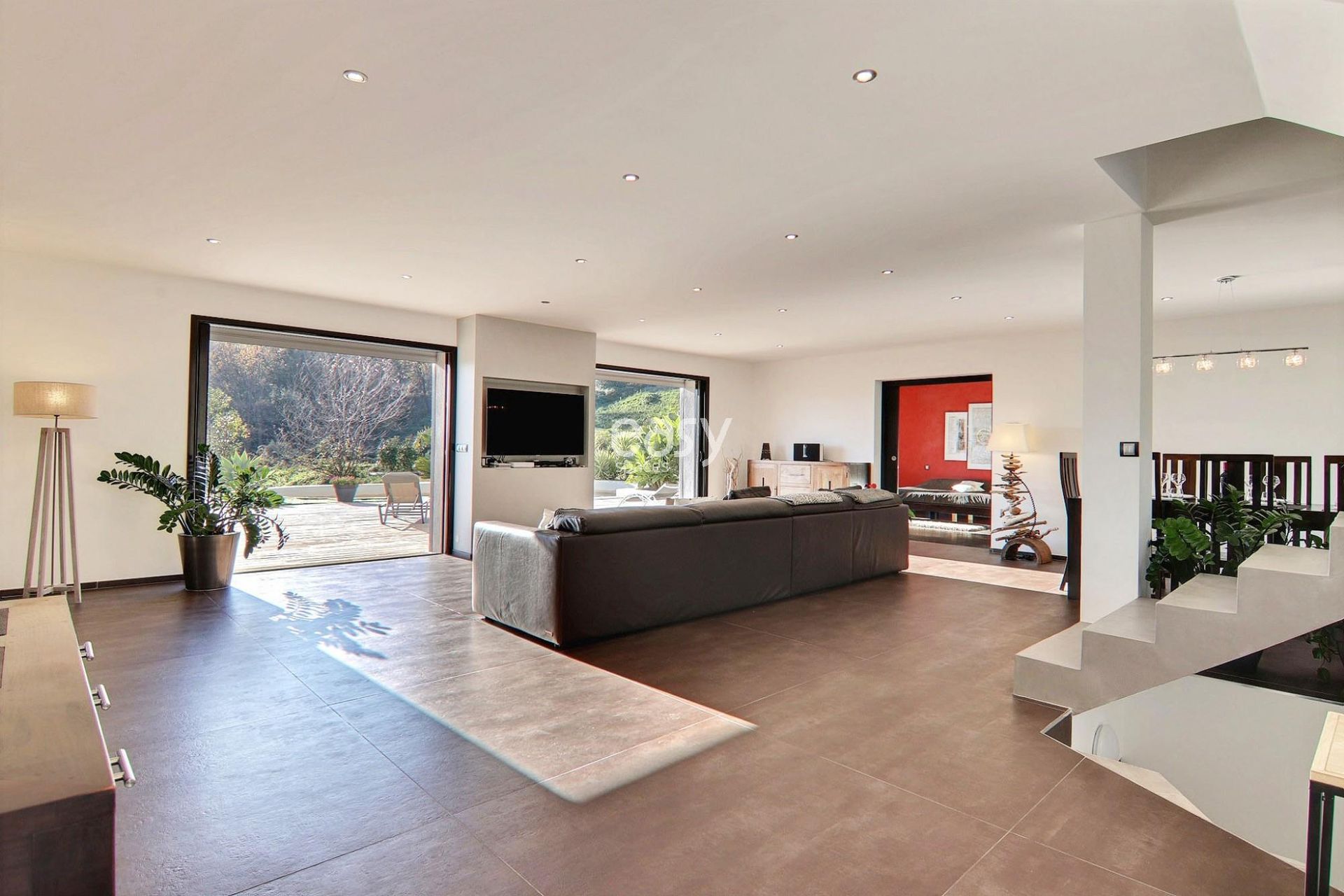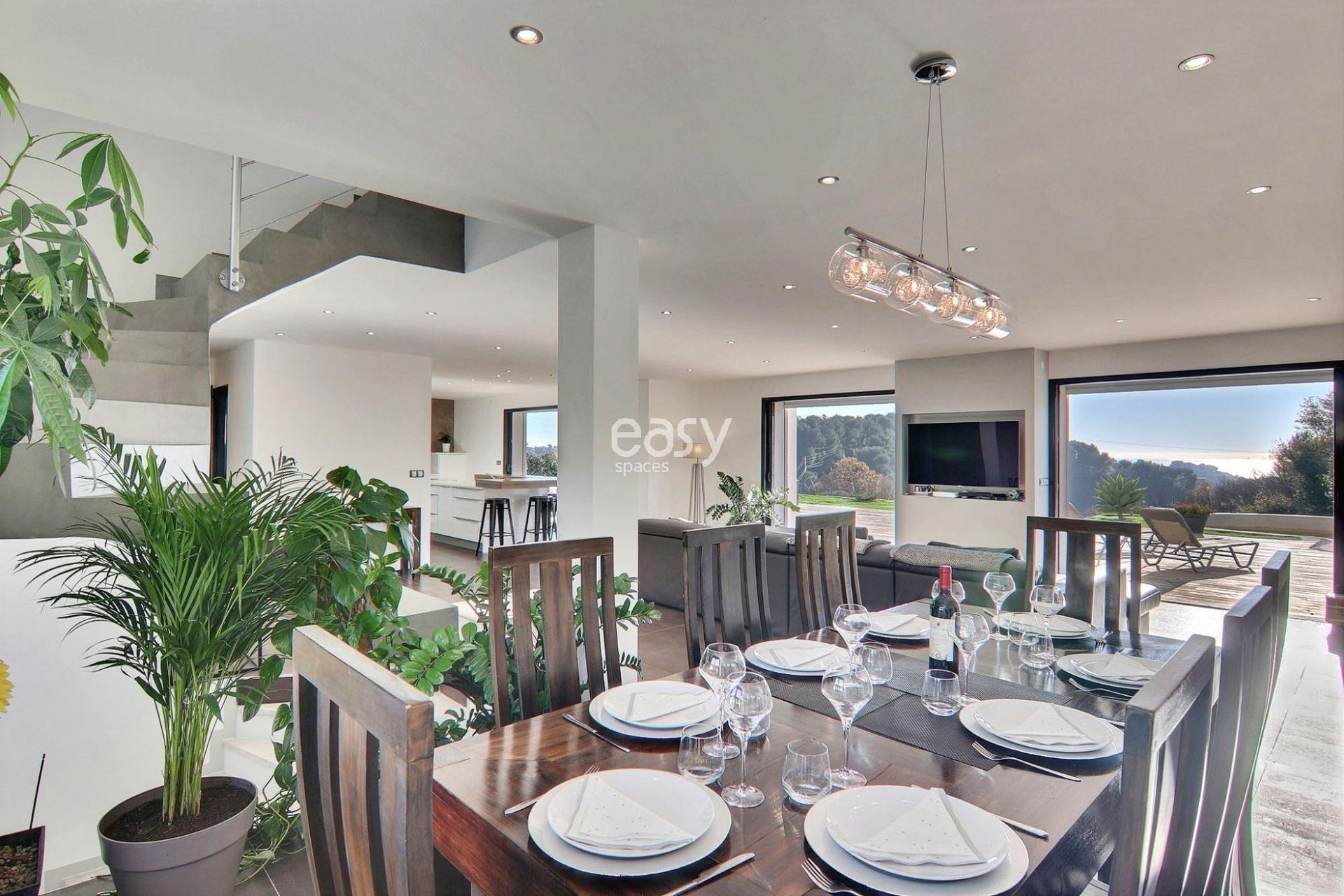 Son grand salon lumineux de 80m2 entièrement ouvert sur l'extérieur, sa décoration épurée et sa piscine à la forme originale en font un cadre parfait pour une production photographique de mobilier de jardin par exemple ou pour un tournage de long métrage dans le 06.