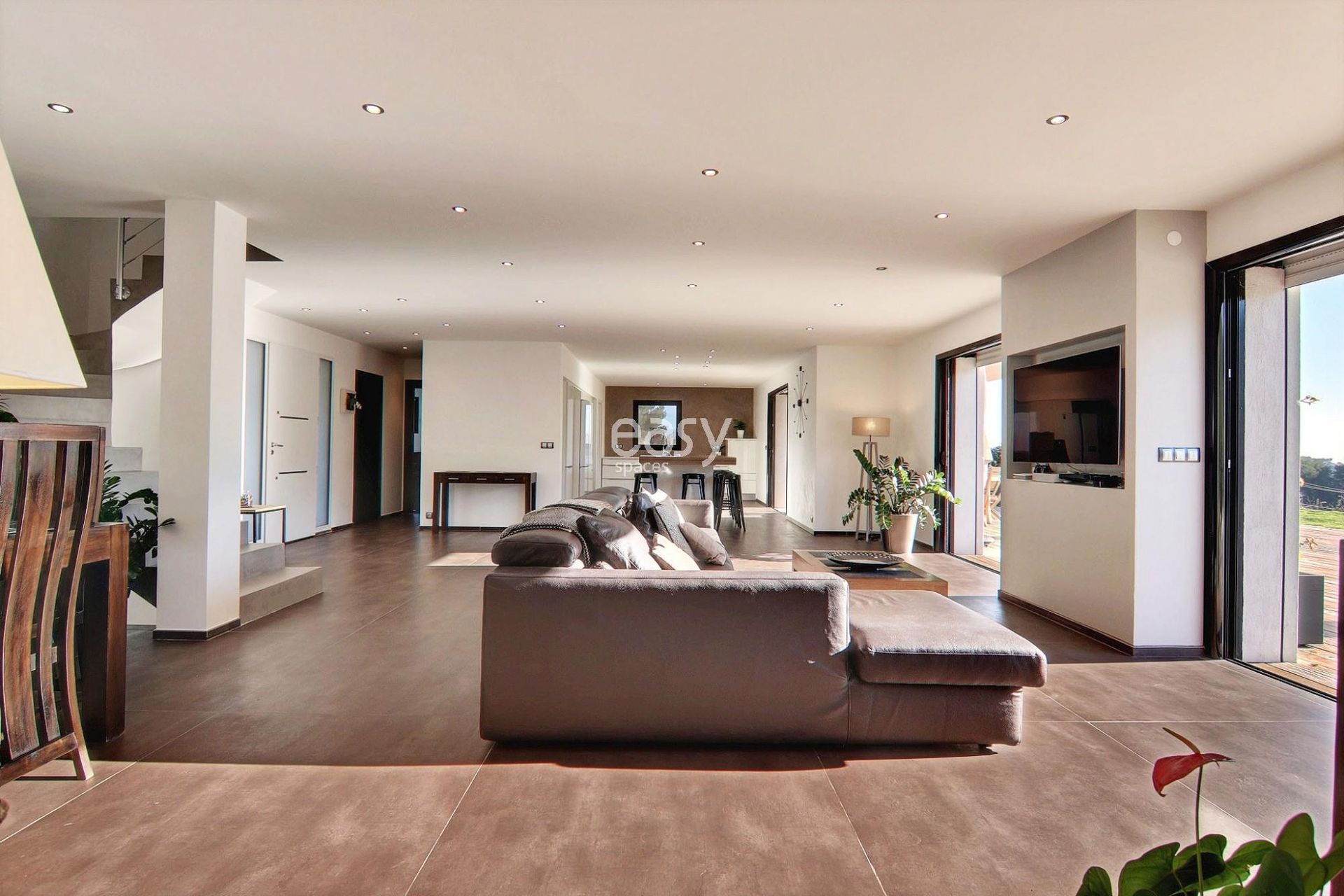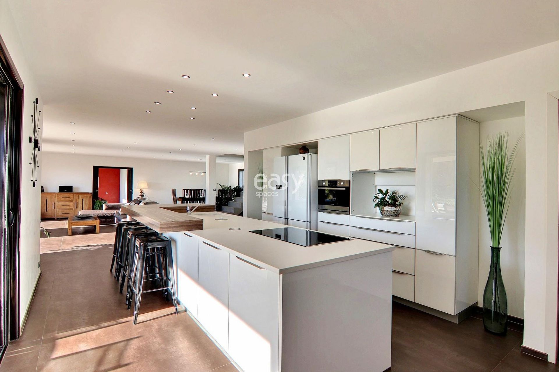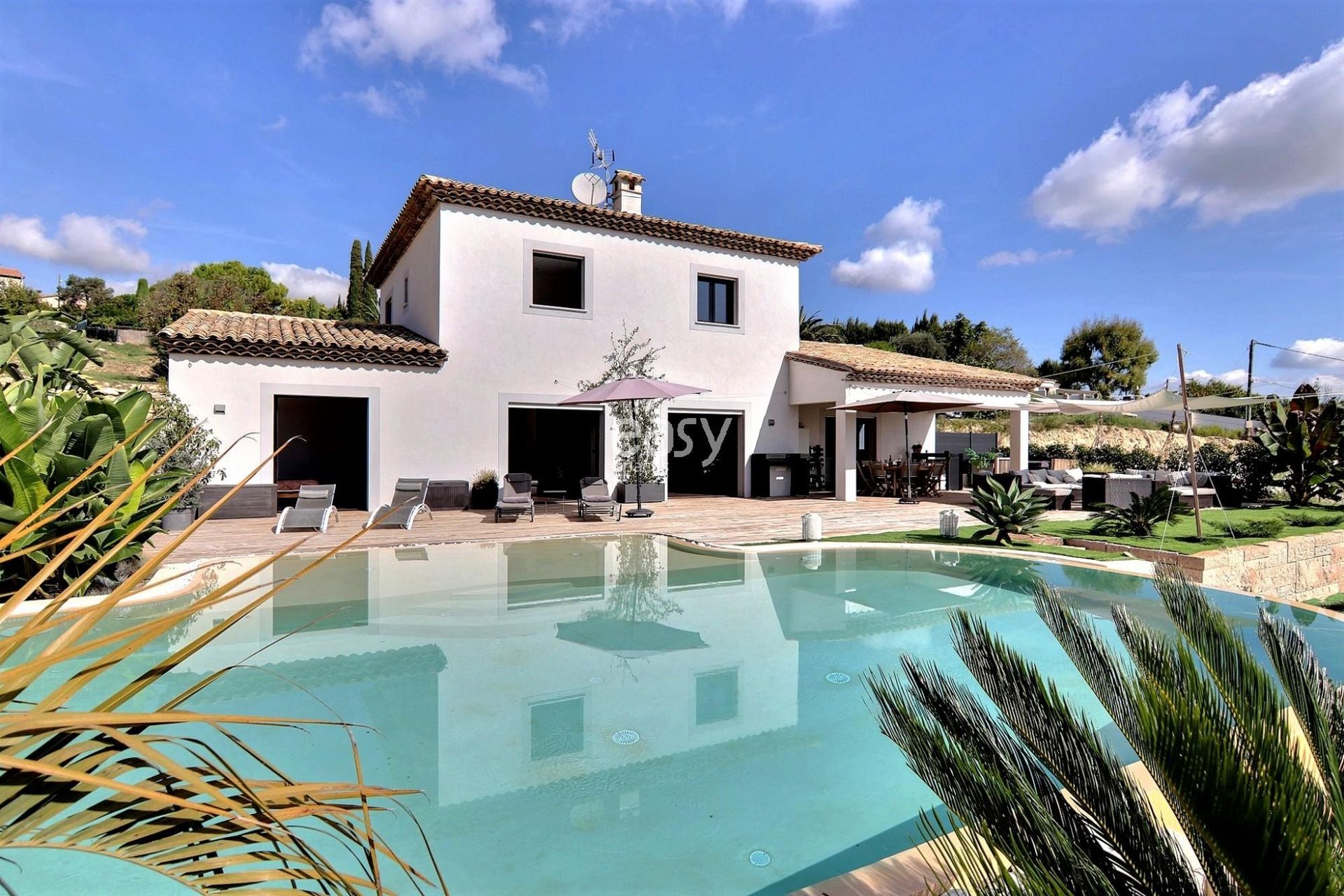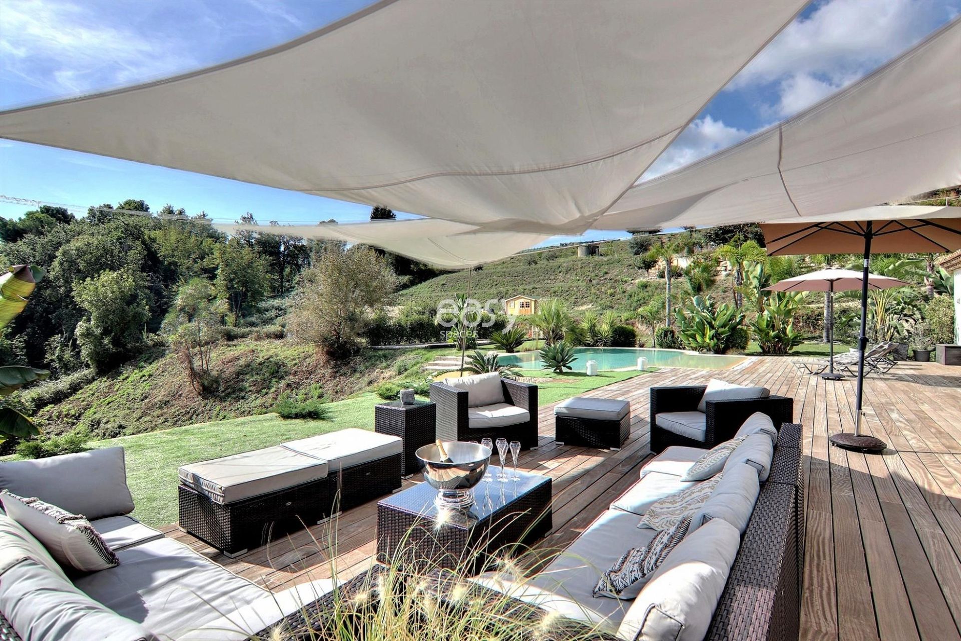 Son grand salon lumineux de 80m2 entièrement ouvert sur l'extérieur, sa décoration épurée et sa piscine à la forme originale en font un cadre parfait pour une production photographique de mobilier de jardin par exemple ou pour un tournage de long métrage dans le 06.