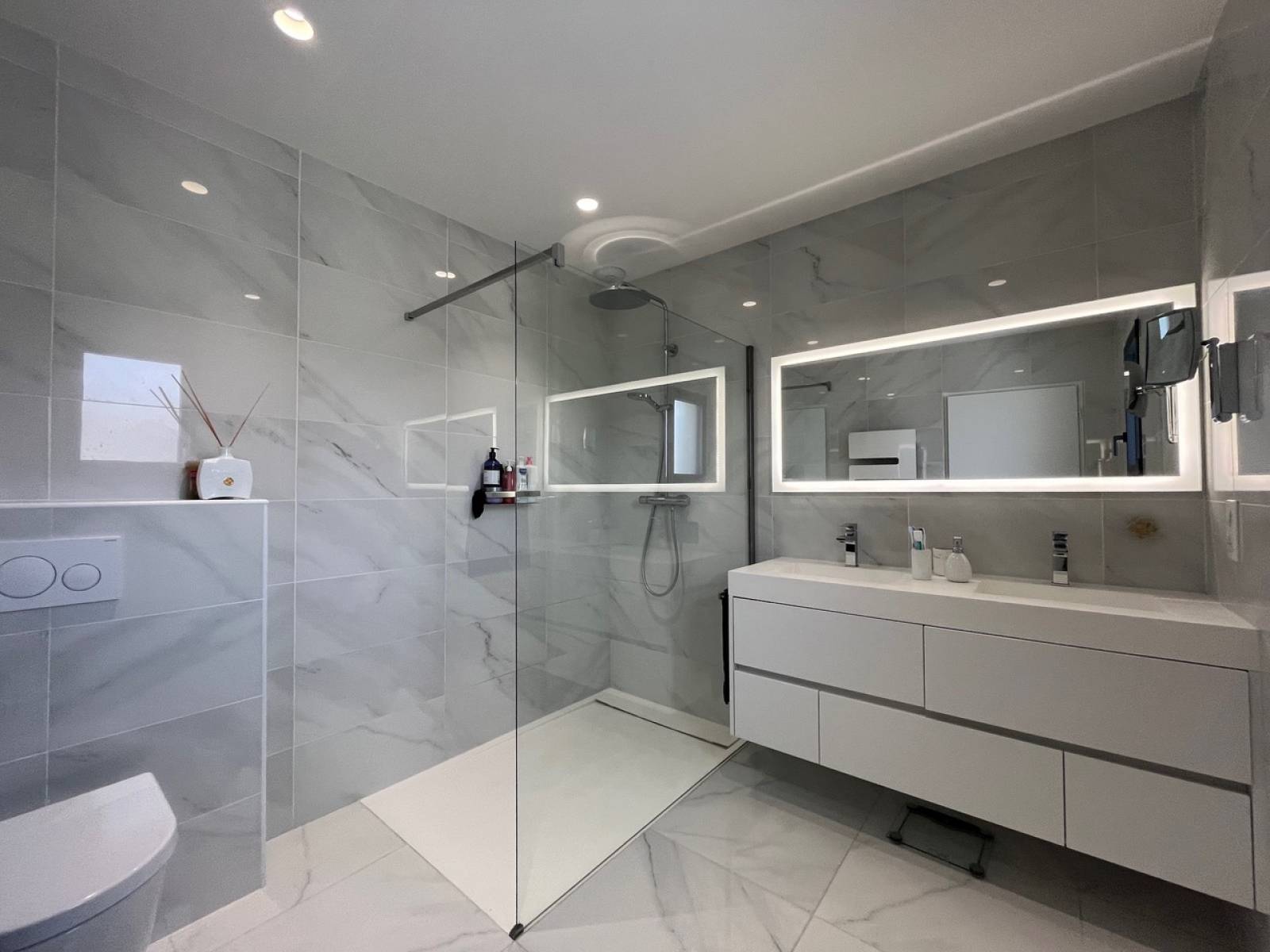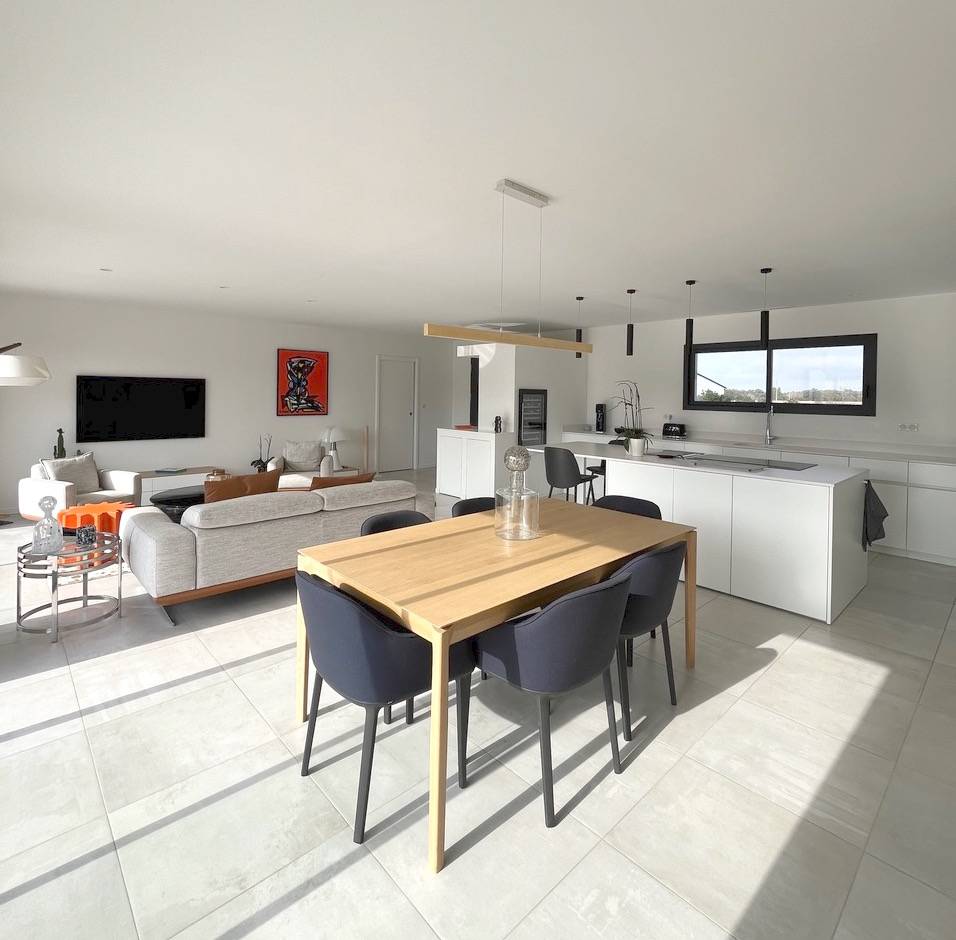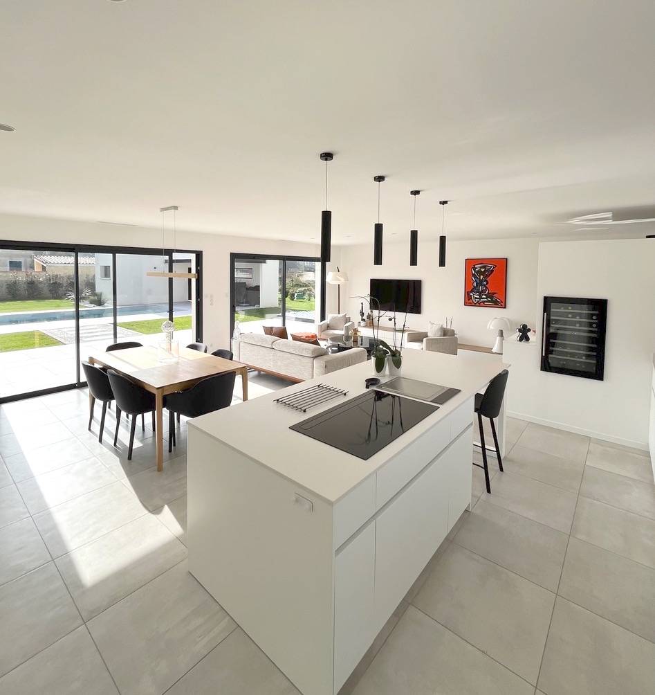 Le séjour s’ouvre sur une cuisine moderne entièrement équipée, avec un îlot central et un design sobre et chic. La cuisine est non seulement fonctionnelle, mais également esthétique, idéale pour des mises en scène culinaires ou des tournages lifestyle.