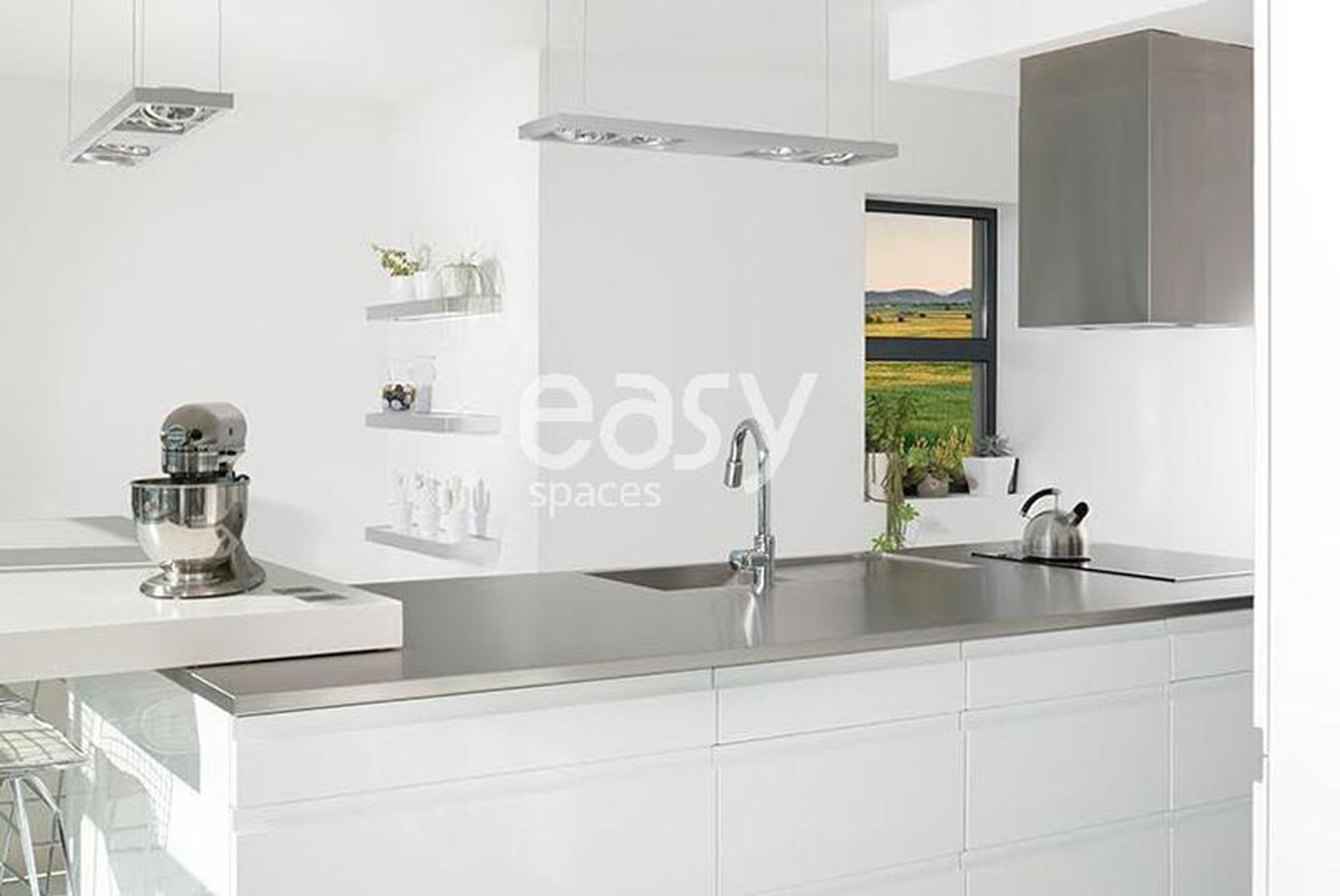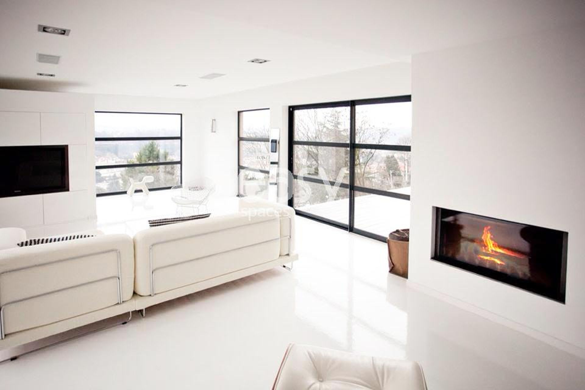 Intérieurs clés : pièces blanches lumineuses, cheminée design, cuisine ouverte, espaces « glossy » faciles à nettoyer/protéger.