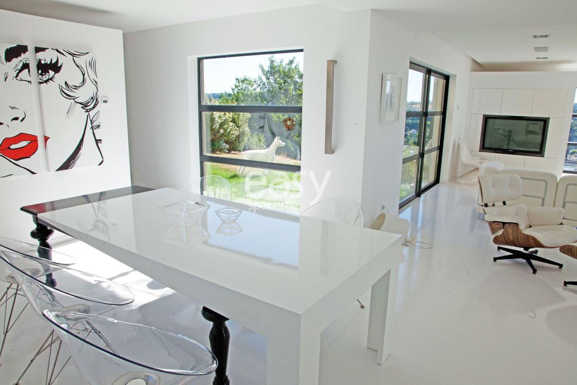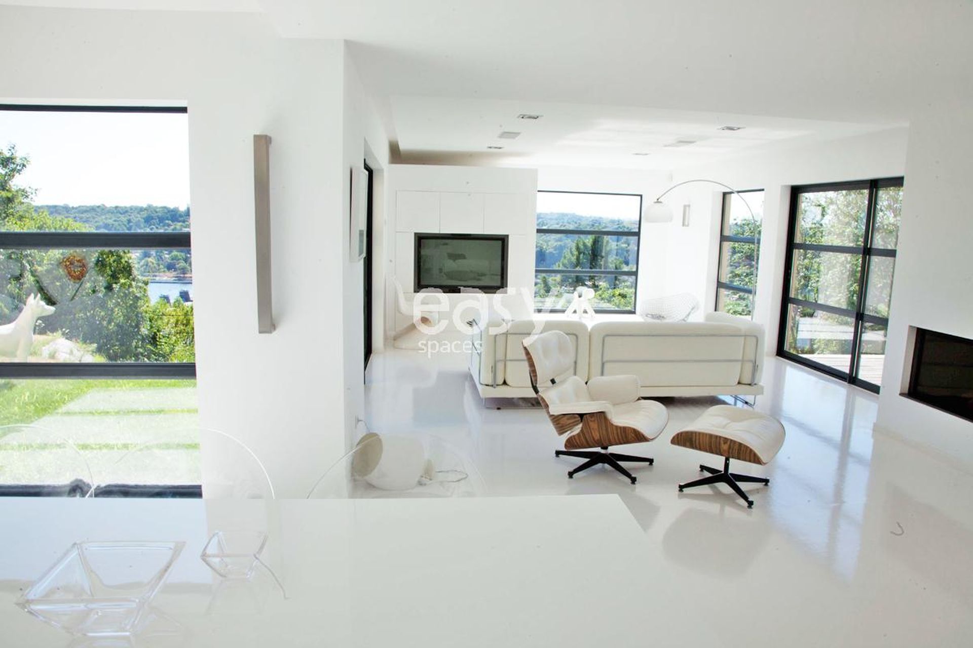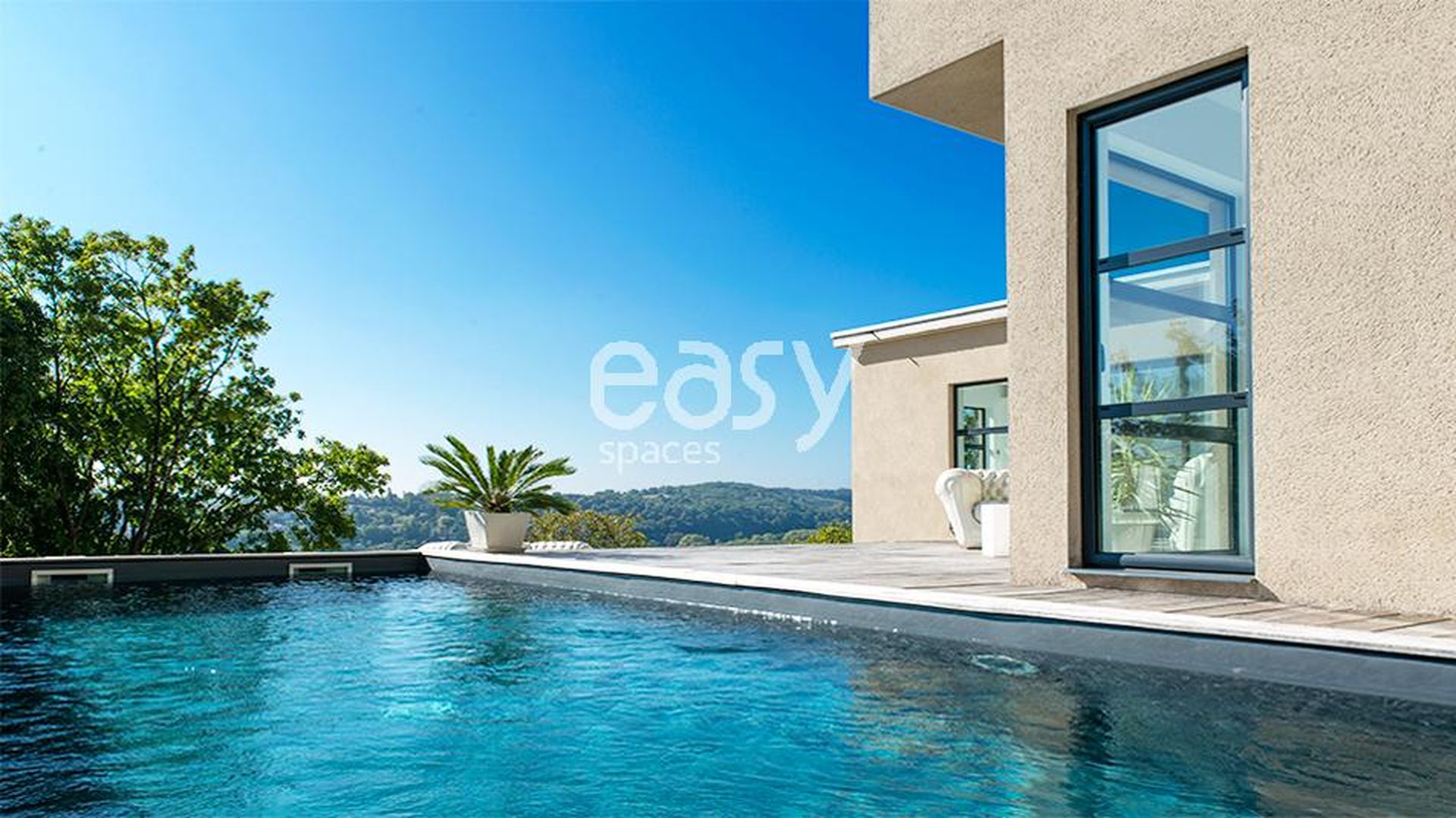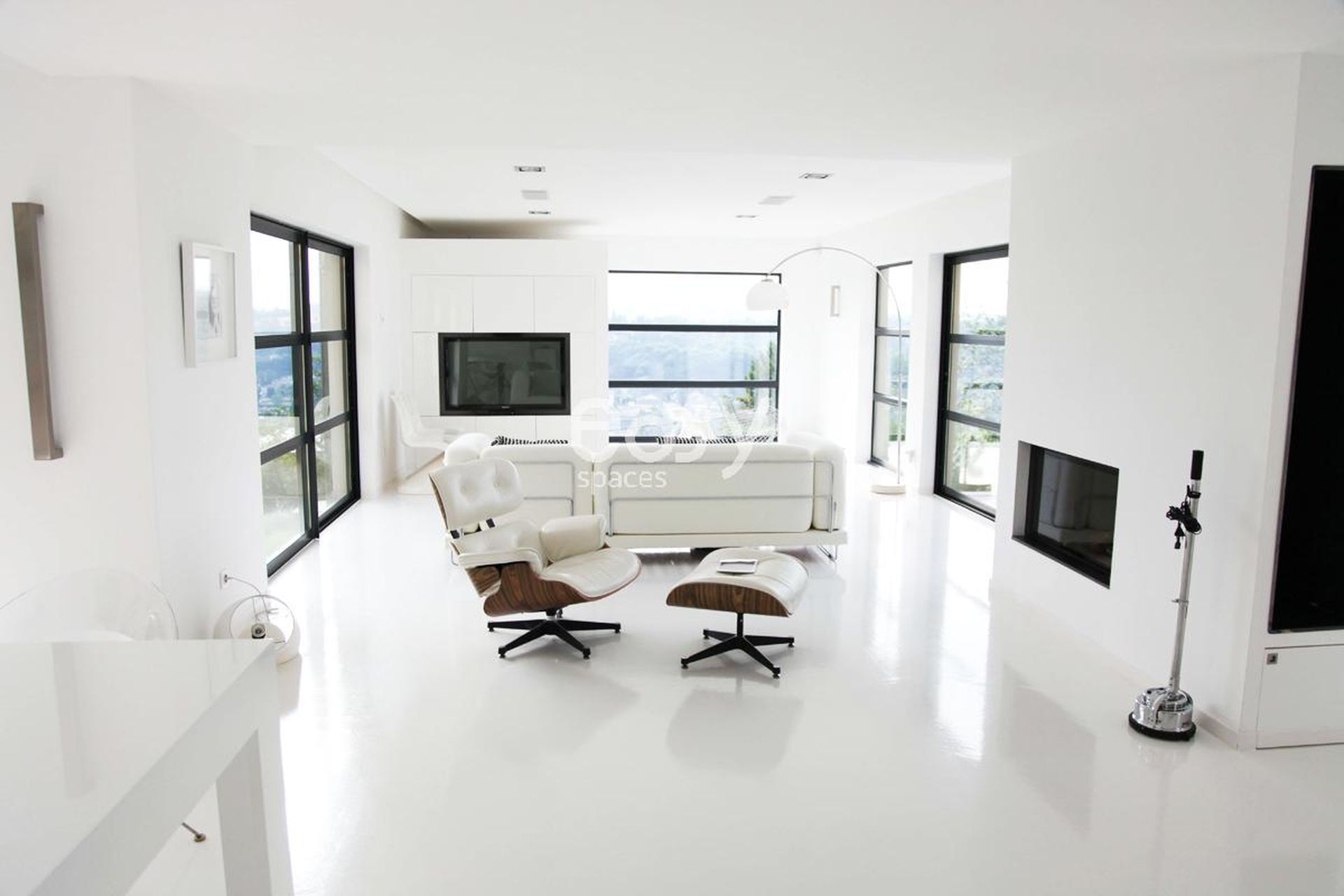 Ici, tout est pensé pour l’image : volumes contemporains, sols blancs laqués, menuiseries noires qui découpent l’espace, baies vitrées plein cadre et vues dégagées sur la vallée. Le salon en enfilade, la cuisine immaculée et l’escalier noir « flottant » composent un vocabulaire visuel clair et haut de gamme. À l’extérieur, piscine miroir, rooftop en bois et terrasses meublées (palmiers, banquettes blanches) offrent des axes caméra complémentaires pour votre journée de captation. Cette maison moderne avec piscine pour shooting et tournage Lyon conjugue esthétique ultra-moderne et vraie facilité de travail, destinée exclusivement à l' organisation d' événements professionnels.